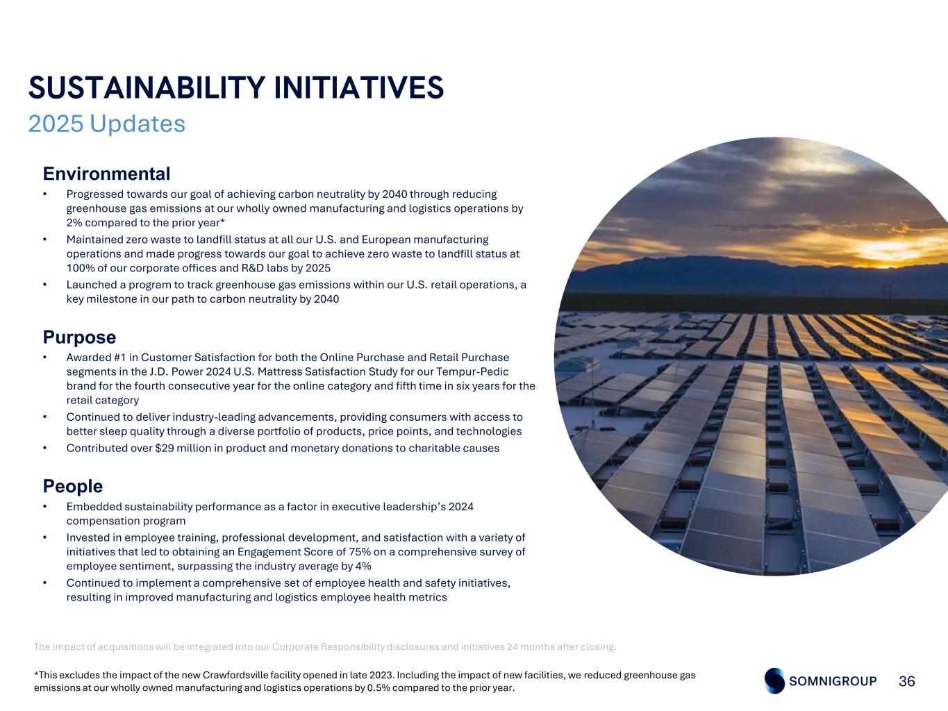 36 SUSTAINABILITY INITIATIVES Environmental • Progressed towards our goal of achieving carbon neutrality by 2040 through reducing greenhouse gas emissions at our wholly owned manufacturing and logistics operations by 2% compared to the prior year* • Maintained zero waste to landfill status at all our U.S. and European manufacturing operations and made progress towards our goal to achieve zero waste to landfill status at 100% of our corporate offices and R&D labs by 2025 • Launched a program to track greenhouse gas emissions within our U.S. retail operations, a key milestone in our path to carbon neutrality by 2040 Purpose • Awarded #1 in Customer Satisfaction for both the Online Purchase and Retail Purchase segments in the J.D. Power 2024 U.S. Mattress Satisfaction Study for our Tempur-Pedic brand for the fourth consecutive year for the online category and fifth time in six years for the retail category • Continued to deliver industry-leading advancements, providing consumers with access to better sleep quality through a diverse portfolio of products, price points, and technologies • Contributed over $29 million in product and monetary donations to charitable causes People • Embedded sustainability performance as a factor in executive leadership’s 2024 compensation program • Invested in employee training, professional development, and satisfaction with a variety of initiatives that led to obtaining an Engagement Score of 75% on a comprehensive survey of employee sentiment, surpassing the industry average by 4% • Continued to implement a comprehensive set of employee health and safety initiatives, resulting in improved manufacturing and logistics employee health metrics *This excludes the impact of the new Crawfordsville facility opened in late 2023. Including the impact of new facilities, we reduced greenhouse gas emissions at our wholly owned manufacturing and logistics operations by 0.5% compared to the prior year. The impact of acquisitions will be integrated into our Corporate Responsibility disclosures and initiatives 24 months after closing. 2025 Updates