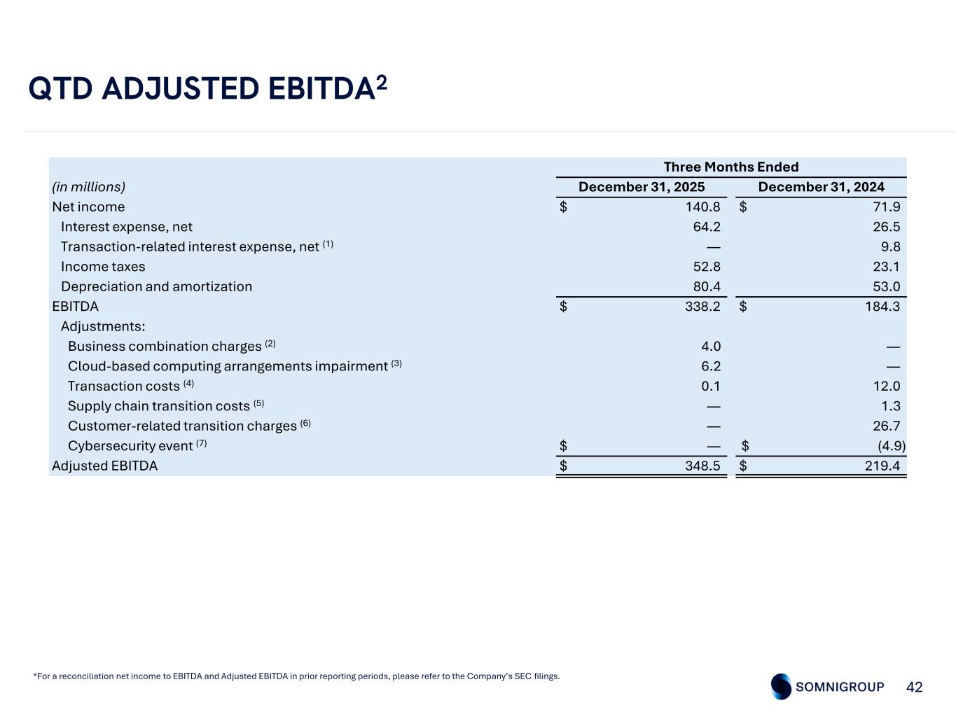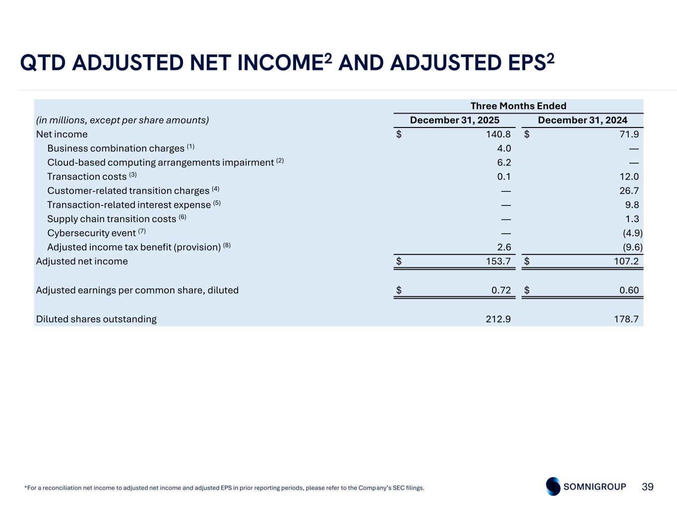 Three Months Ended (in millions, except per share amounts) December 31, 2025 December 31, 2024 Net income $ 140.8 $ 71.9 Business combination charges (1) 4.0 — Cloud-based computing arrangements impairment (2) 6.2 — Transaction costs (3) 0.1 12.0 Customer-related transition charges (4) — 26.7 Transaction-related interest expense (5) — 9.8 Supply chain transition costs (6) — 1.3 Cybersecurity event (7) — (4.9) Adjusted income tax benefit (provision) (8) 2.6 (9.6) Adjusted net income $ 153.7 $ 107.2 Adjusted earnings per common share, diluted $ 0.72 $ 0.60 Diluted shares outstanding 212.9 178.7 39 QTD ADJUSTED NET INCOME2 AND ADJUSTED EPS2 *For a reconciliation net income to adjusted net income and adjusted EPS in prior reporting periods, please refer to the Company’s SEC filings.