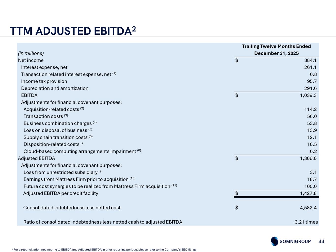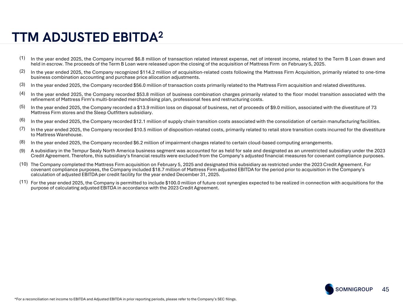 45 TTM ADJUSTED EBITDA2 *For a reconciliation net income to EBITDA and Adjusted EBITDA in prior reporting periods, please refer to the Company’s SEC filings. (1) In the year ended 2025, the Company incurred $6.8 million of transaction related interest expense, net of interest income, related to the Term B Loan drawn and held in escrow. The proceeds of the Term B Loan were released upon the closing of the acquisition of Mattress Firm on February 5, 2025. (2) In the year ended 2025, the Company recognized $114.2 million of acquisition-related costs following the Mattress Firm Acquisition, primarily related to one-time business combination accounting and purchase price allocation adjustments. (3) In the year ended 2025, the Company recorded $56.0 million of transaction costs primarily related to the Mattress Firm acquisition and related divestitures. (4) In the year ended 2025, the Company recorded $53.8 million of business combination charges primarily related to the floor model transition associated with the refinement of Mattress Firm's multi-branded merchandising plan, professional fees and restructuring costs. (5) In the year ended 2025, the Company recorded a $13.9 million loss on disposal of business, net of proceeds of $9.0 million, associated with the divestiture of 73 Mattress Firm stores and the Sleep Outfitters subsidiary. (6) In the year ended 2025, the Company recorded $12.1 million of supply chain transition costs associated with the consolidation of certain manufacturing facilities. (7) In the year ended 2025, the Company recorded $10.5 million of disposition-related costs, primarily related to retail store transition costs incurred for the divestiture to Mattress Warehouse. (8) In the year ended 2025, the Company recorded $6.2 million of impairment charges related to certain cloud-based computing arrangements. (9) A subsidiary in the Tempur Sealy North America business segment was accounted for as held for sale and designated as an unrestricted subsidiary under the 2023 Credit Agreement. Therefore, this subsidiary's financial results were excluded from the Company’s adjusted financial measures for covenant compliance purposes. (10) The Company completed the Mattress Firm acquisition on February 5, 2025 and designated this subsidiary as restricted under the 2023 Credit Agreement. For covenant compliance purposes, the Company included $18.7 million of Mattress Firm adjusted EBITDA for the period prior to acquisition in the Company's calculation of adjusted EBITDA per credit facility for the year ended December 31, 2025. (11) For the year ended 2025, the Company is permitted to include $100.0 million of future cost synergies expected to be realized in connection with acquisitions for the purpose of calculating adjusted EBITDA in accordance with the 2023 Credit Agreement.