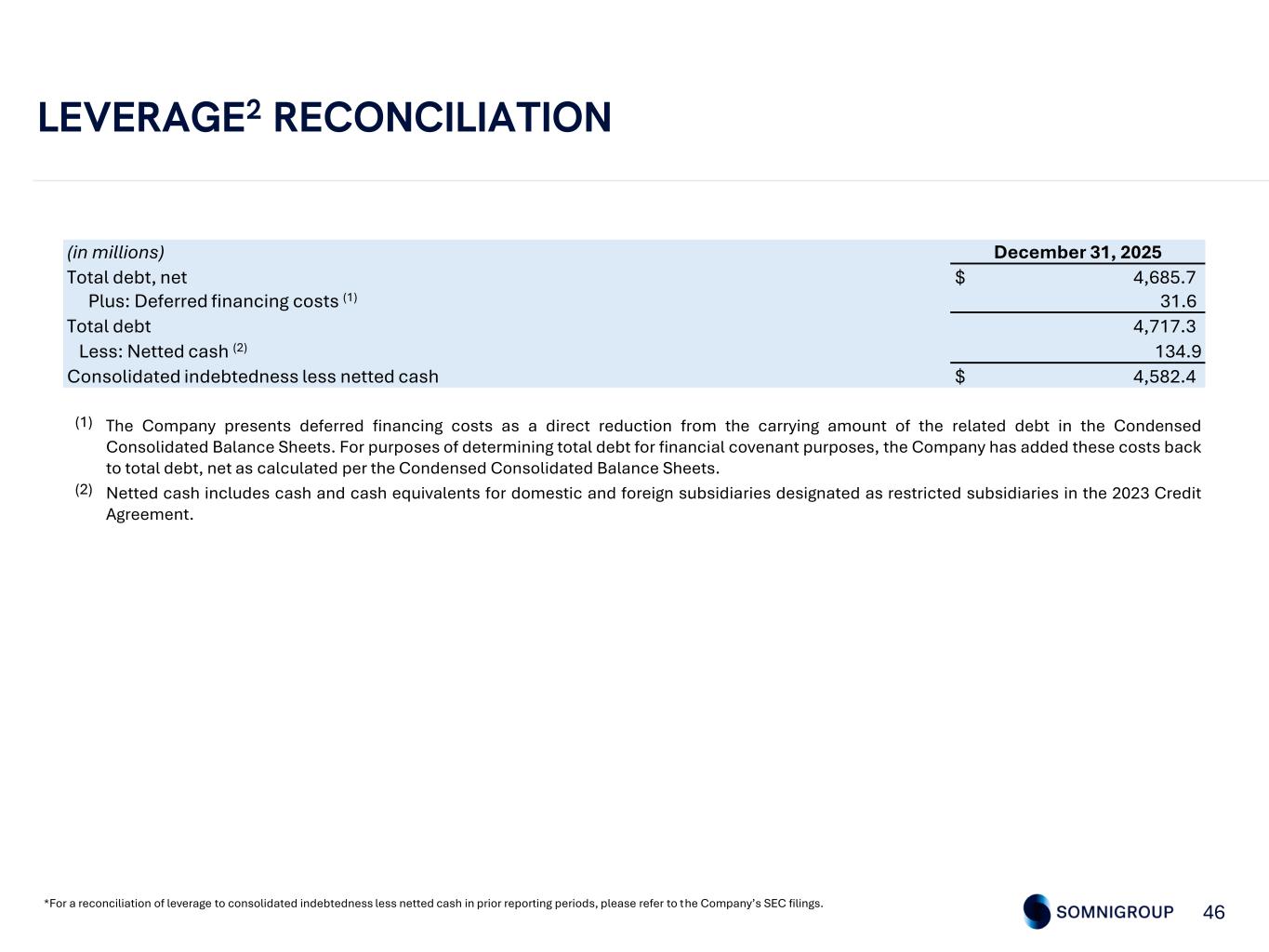 46 LEVERAGE2 RECONCILIATION *For a reconciliation of leverage to consolidated indebtedness less netted cash in prior reporting periods, please refer to the Company’s SEC filings. (1) The Company presents deferred financing costs as a direct reduction from the carrying amount of the related debt in the Condensed Consolidated Balance Sheets. For purposes of determining total debt for financial covenant purposes, the Company has added these costs back to total debt, net as calculated per the Condensed Consolidated Balance Sheets. (2) Netted cash includes cash and cash equivalents for domestic and foreign subsidiaries designated as restricted subsidiaries in the 2023 Credit Agreement. (in millions) December 31, 2025 Total debt, net $ 4,685.7 Plus: Deferred financing costs (1) 31.6 Total debt 4,717.3 Less: Netted cash (2) 134.9 Consolidated indebtedness less netted cash $ 4,582.4