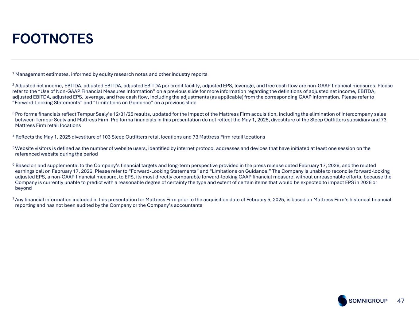 47 FOOTNOTES 1 Management estimates, informed by equity research notes and other industry reports 2 Adjusted net income, EBITDA, adjusted EBITDA, adjusted EBITDA per credit facility, adjusted EPS, leverage, and free cash flow are non-GAAP financial measures. Please refer to the “Use of Non-GAAP Financial Measures Information” on a previous slide for more information regarding the definitions of adjusted net income, EBITDA, adjusted EBITDA, adjusted EPS, leverage, and free cash flow, including the adjustments (as applicable) from the corresponding GAAP information. Please refer to “Forward-Looking Statements” and “Limitations on Guidance” on a previous slide 3 Pro forma financials reflect Tempur Sealy’s 12/31/25 results, updated for the impact of the Mattress Firm acquisition, including the elimination of intercompany sales between Tempur Sealy and Mattress Firm. Pro forma financials in this presentation do not reflect the May 1, 2025, divestiture of the Sleep Outfitters subsidiary and 73 Mattress Firm retail locations 4 Reflects the May 1, 2025 divestiture of 103 Sleep Outfitters retail locations and 73 Mattress Firm retail locations 5 Website visitors is defined as the number of website users, identified by internet protocol addresses and devices that have initiated at least one session on the referenced website during the period 6 Based on and supplemental to the Company’s financial targets and long-term perspective provided in the press release dated February 17, 2026, and the related earnings call on February 17, 2026. Please refer to “Forward-Looking Statements” and “Limitations on Guidance.” The Company is unable to reconcile forward‐looking adjusted EPS, a non‐GAAP financial measure, to EPS, its most directly comparable forward‐looking GAAP financial measure, without unreasonable efforts, because the Company is currently unable to predict with a reasonable degree of certainty the type and extent of certain items that would be expected to impact EPS in 2026 or beyond 7 Any financial information included in this presentation for Mattress Firm prior to the acquisition date of February 5, 2025, is based on Mattress Firm’s historical financial reporting and has not been audited by the Company or the Company’s accountants