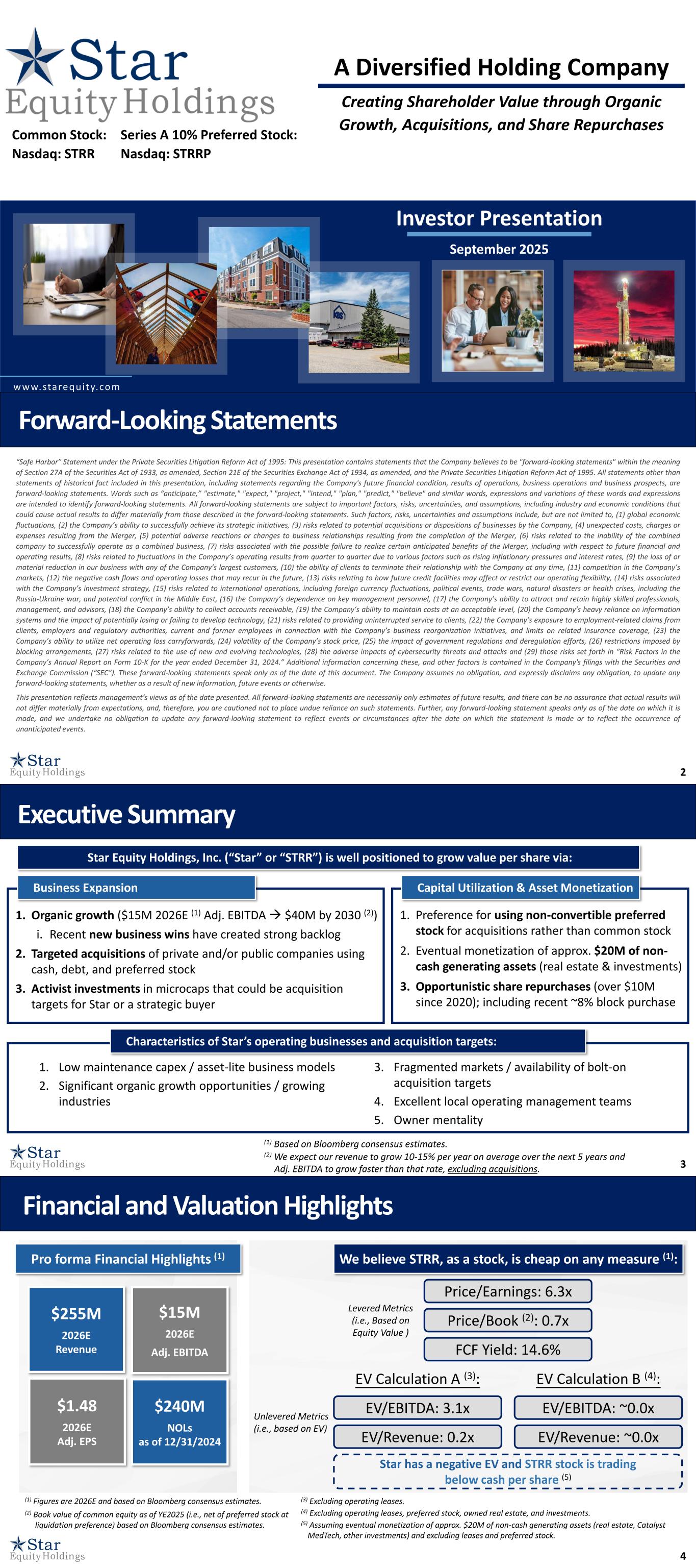 1 A Diversified Holding Company www.starequity.com Creating Shareholder Value through Organic Growth, Acquisitions, and Share Repurchases Investor Presentation September 2025 Common Stock: Nasdaq: STRR Series A 10% Preferred Stock: Nasdaq: STRRP 2 “Safe Harbor” Statement under the Private Securities Litigation Reform Act of 1995: This presentation contains statements that the Company believes to be "forward-looking statements" within the meaning of Section 27A of the Securities Act of 1933, as amended, Section 21E of the Securities Exchange Act of 1934, as amended, and the Private Securities Litigation Reform Act of 1995. All statements other than statements of historical fact included in this presentation, including statements regarding the Company's future financial condition, results of operations, business operations and business prospects, are forward-looking statements. Words such as “anticipate,” "estimate," "expect," "project," "intend," "plan," "predict," "believe" and similar words, expressions and variations of these words and expressions are intended to identify forward-looking statements. All forward-looking statements are subject to important factors, risks, uncertainties, and assumptions, including industry and economic conditions that could cause actual results to differ materially from those described in the forward-looking statements. Such factors, risks, uncertainties and assumptions include, but are not limited to, (1) global economic fluctuations, (2) the Company’s ability to successfully achieve its strategic initiatives, (3) risks related to potential acquisitions or dispositions of businesses by the Company, (4) unexpected costs, charges or expenses resulting from the Merger, (5) potential adverse reactions or changes to business relationships resulting from the completion of the Merger, (6) risks related to the inability of the combined company to successfully operate as a combined business, (7) risks associated with the possible failure to realize certain anticipated benefits of the Merger, including with respect to future financial and operating results, (8) risks related to fluctuations in the Company’s operating results from quarter to quarter due to various factors such as rising inflationary pressures and interest rates, (9) the loss of or material reduction in our business with any of the Company’s largest customers, (10) the ability of clients to terminate their relationship with the Company at any time, (11) competition in the Company’s markets, (12) the negative cash flows and operating losses that may recur in the future, (13) risks relating to how future credit facilities may affect or restrict our operating flexibility, (14) risks associated with the Company’s investment strategy, (15) risks related to international operations, including foreign currency fluctuations, political events, trade wars, natural disasters or health crises, including the Russia-Ukraine war, and potential conflict in the Middle East, (16) the Company’s dependence on key management personnel, (17) the Company’s ability to attract and retain highly skilled professionals, management, and advisors, (18) the Company’s ability to collect accounts receivable, (19) the Company’s ability to maintain costs at an acceptable level, (20) the Company’s heavy reliance on information systems and the impact of potentially losing or failing to develop technology, (21) risks related to providing uninterrupted service to clients, (22) the Company’s exposure to employment-related claims from clients, employers and regulatory authorities, current and former employees in connection with the Company’s business reorganization initiatives, and limits on related insurance coverage, (23) the Company’s ability to utilize net operating loss carryforwards, (24) volatility of the Company’s stock price, (25) the impact of government regulations and deregulation efforts, (26) restrictions imposed by blocking arrangements, (27) risks related to the use of new and evolving technologies, (28) the adverse impacts of cybersecurity threats and attacks and (29) those risks set forth in “Risk Factors in the Company’s Annual Report on Form 10-K for the year ended December 31, 2024.” Additional information concerning these, and other factors is contained in the Company's filings with the Securities and Exchange Commission (“SEC”). These forward-looking statements speak only as of the date of this document. The Company assumes no obligation, and expressly disclaims any obligation, to update any forward-looking statements, whether as a result of new information, future events or otherwise. This presentation reflects management’s views as of the date presented. All forward-looking statements are necessarily only estimates of future results, and there can be no assurance that actual results will not differ materially from expectations, and, therefore, you are cautioned not to place undue reliance on such statements. Further, any forward-looking statement speaks only as of the date on which it is made, and we undertake no obligation to update any forward-looking statement to reflect events or circumstances after the date on which the statement is made or to reflect the occurrence of unanticipated events. Forward-Looking Statements 3 Executive Summary (1) Based on Bloomberg consensus estimates. 1. Low maintenance capex / asset-lite business models 2. Significant organic growth opportunities / growing industries 3. Fragmented markets / availability of bolt-on acquisition targets 4. Excellent local operating management teams 5. Owner mentality Characteristics of Star’s operating businesses and acquisition targets: (2) We expect our revenue to grow 10-15% per year on average over the next 5 years and Adj. EBITDA to grow faster than that rate, excluding acquisitions. Star Equity Holdings, Inc. (“Star” or “STRR”) is well positioned to grow value per share via: 1. Organic g