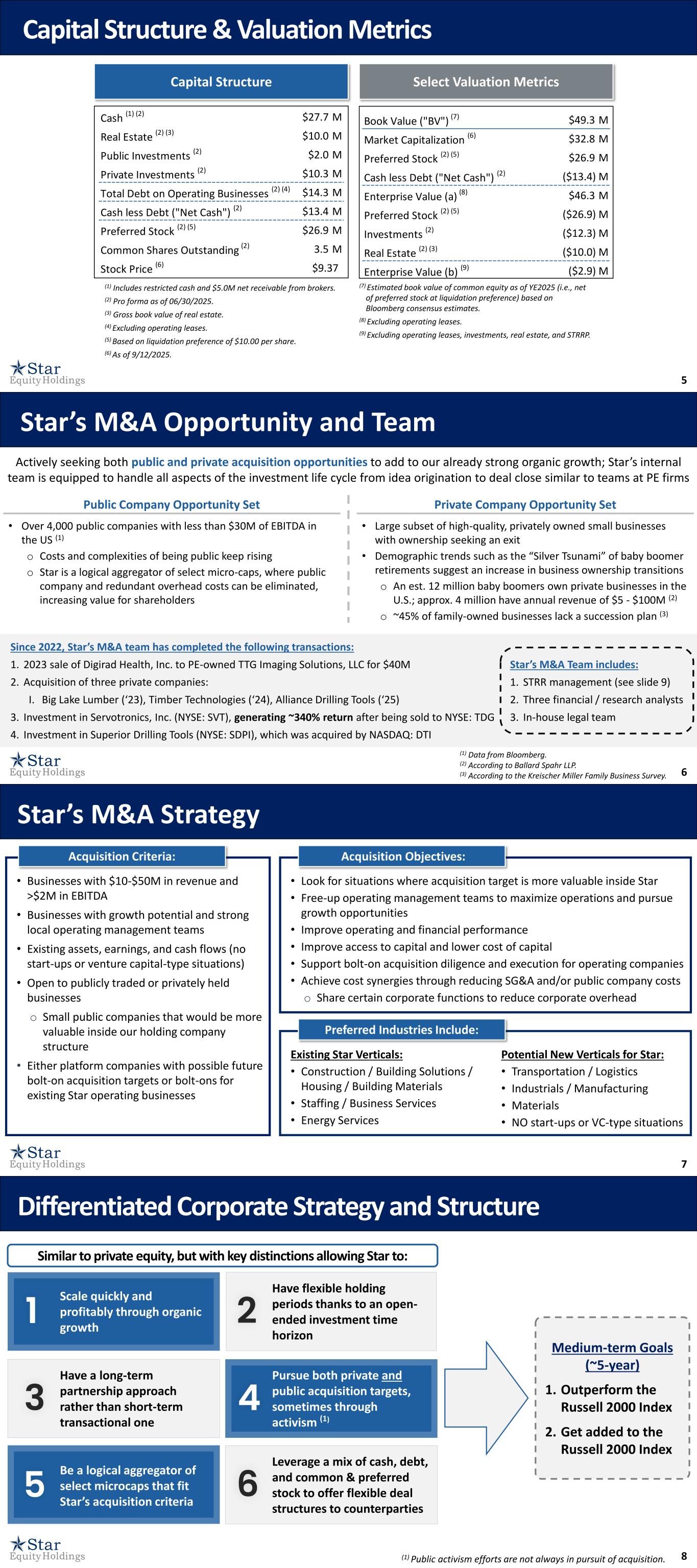 5 Capital Structure & Valuation Metrics (1) Includes restricted cash and $5.0M net receivable from brokers. (2) Pro forma as of 06/30/2025. (3) Gross book value of real estate. (4) Excluding operating leases. (5) Based on liquidation preference of $10.00 per share. (6) As of 9/12/2025. (7) Estimated book value of common equity as of YE2025 (i.e., net of preferred stock at liquidation preference) based on Bloomberg consensus estimates. (8) Excluding operating leases. (9) Excluding operating leases, investments, real estate, and STRRP. Capital Structure Select Valuation Metrics Cash (1) (2) $27.7 M Real Estate (2) (3) $10.0 M Public Investments (2) $2.0 M Private Investments (2) $10.3 M Total Debt on Operating Businesses (2) (4) $14.3 M Cash less Debt ("Net Cash") (2) $13.4 M Preferred Stock (2) (5) $26.9 M Common Shares Outstanding (2) 3.5 M Stock Price (6) $9.37 Book Value ("BV") (7) $49.3 M Market Capitalization (6) $32.8 M Preferred Stock (2) (5) $26.9 M Cash less Debt ("Net Cash") (2) ($13.4) M Enterprise Value (a) (8) $46.3 M Preferred Stock (2) (5) ($26.9) M Investments (2) ($12.3) M Real Estate (2) (3) ($10.0) M Enterprise Value (b) (9) ($2.9) M 6 Star’s M&A Opportunity and Team Actively seeking both public and private acquisition opportunities to add to our already strong organic growth; Star’s internal team is equipped to handle all aspects of the investment life cycle from idea origination to deal close similar to teams at PE firms (1) Data from Bloomberg. (2) According to Ballard Spahr LLP. (3) According to the Kreischer Miller Family Business Survey. Public Company Opportunity Set • Over 4,000 public companies with less than $30M of EBITDA in the US (1) o Costs and complexities of being public keep rising o Star is a logical aggregator of select micro-caps, where public company and redundant overhead costs can be eliminated, increasing value for shareholders Private Company Opportunity Set • Large subset of high-quality, privately owned small businesses with ownership seeking an exit • Demographic trends such as the “Silver Tsunami” of baby boomer retirements suggest an increase in business ownership transitions o An est. 12 million baby boomers own private businesses in the U.S.; approx. 4 million have annual revenue of $5 - $100M (2) o ~45% of family-owned businesses lack a succession plan (3) Since 2022, Star’s M&A team has completed the following transactions: 1. 2023 sale of Digirad Health, Inc. to PE-owned TTG Imaging Solutions, LLC for $40M 2. Acquisition of three private companies: I. Big Lake Lumber (‘23), Timber Technologies (‘24), Alliance Drilling Tools (‘25) 3. Investment in Servotronics, Inc. (NYSE: SVT), generating ~340% return after being sold to NYSE: TDG 4. Investment in Superior Drilling Tools (NYSE: SDPI), which was acquired by NASDAQ: DTI Star’s M&A Team includes: 1. STRR management (see slide 9) 2. Three financial / research analysts 3. In-house legal team 7 • Businesses with $10-$50M in revenue and >$2M in EBITDA • Businesses with growth potential and strong local operating management teams • Existing assets, earnings, and cash flows (no start-ups or venture capital-type situations) • Open to publicly traded or privately held businesses o Small public companies that would be more valuable inside our holding company structure • Either platform companies with possible future bolt-on acquisition targets or bolt-ons for existing Star operating businesses Acquisition Criteria: • Look for situations where acquisition target is more valuable inside Star • Free-up operating management teams to maximize operations and pursue growth opportunities • Improve operating and financial performance • Improve access to capital and lower cost of capital • Support bolt-on acquisition diligence and execution for operating companies • Achieve cost synergies through reducing SG&A and/or public company costs o Share certain corporate functions to reduce corporate overhead Acquisition Objectives: Existing Star Verticals: • Construction / Building Solutions / Housing / Building Materials • Staffing / Business Services • Energy Services Potential New Verticals for Star: • Transportation / Logistics • Industrials / Manufacturing • Materials • NO start-ups or VC-type situations Preferred Industries Include: Star’s M&A Strategy 8(1) Public activism efforts are not always in pursuit of acquisition. Differentiated Corporate Strategy and Structure 1 Scale quickly and profitably through organic growth 3 5 Have a long-term partnership approach rather than short-term transactional one 2 4 Have flexible holding periods thanks to an open- ended investment time horizon 6Be a logical aggregator of select microcaps that fit Star’s acquisition criteria Similar to private equity, but with key distinctions allowing Star to: Leverage a mix of cash, debt, and common & preferred stock to offer flexible deal structures to counterparties Pursue both private and public acquisition targets, sometimes through activism (1) Medium-term Goals (~5-year) 1. Outperform the Russell 2000 Index 2. Get added to the Russell 2000 Index