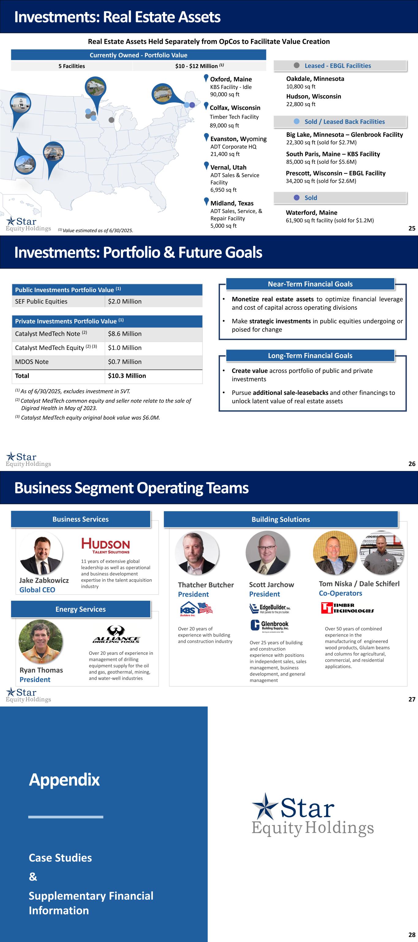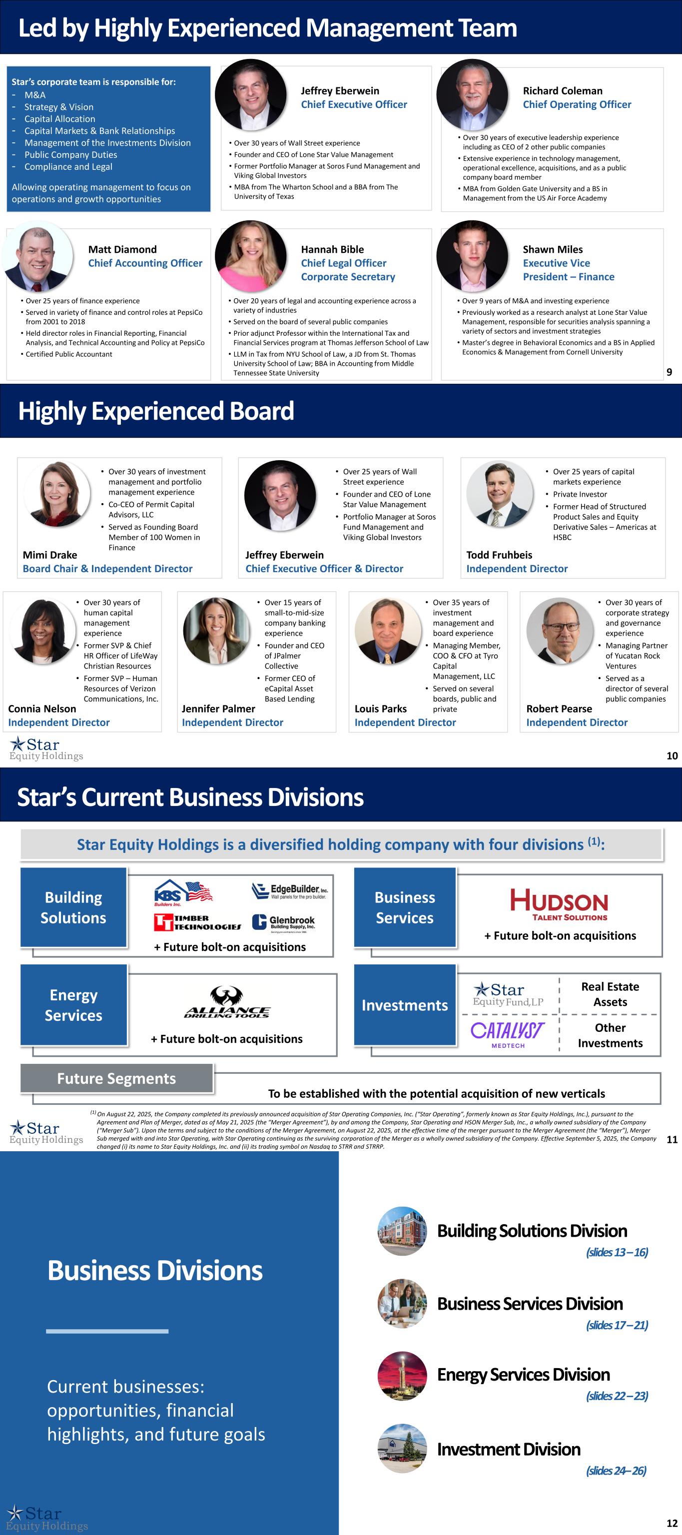 9 Star’s corporate team is responsible for: - M&A - Strategy & Vision - Capital Allocation - Capital Markets & Bank Relationships - Management of the Investments Division - Public Company Duties - Compliance and Legal Allowing operating management to focus on operations and growth opportunities Led by Highly Experienced Management Team Jeffrey Eberwein Chief Executive Officer • Over 30 years of Wall Street experience • Founder and CEO of Lone Star Value Management • Former Portfolio Manager at Soros Fund Management and Viking Global Investors • MBA from The Wharton School and a BBA from The University of Texas Richard Coleman Chief Operating Officer • Over 30 years of executive leadership experience including as CEO of 2 other public companies • Extensive experience in technology management, operational excellence, acquisitions, and as a public company board member • MBA from Golden Gate University and a BS in Management from the US Air Force Academy • Over 9 years of M&A and investing experience • Previously worked as a research analyst at Lone Star Value Management, responsible for securities analysis spanning a variety of sectors and investment strategies • Master’s degree in Behavioral Economics and a BS in Applied Economics & Management from Cornell University Shawn Miles Executive Vice President – Finance • Over 25 years of finance experience • Served in variety of finance and control roles at PepsiCo from 2001 to 2018 • Held director roles in Financial Reporting, Financial Analysis, and Technical Accounting and Policy at PepsiCo • Certified Public Accountant Matt Diamond Chief Accounting Officer • Over 20 years of legal and accounting experience across a variety of industries • Served on the board of several public companies • Prior adjunct Professor within the International Tax and Financial Services program at Thomas Jefferson School of Law • LLM in Tax from NYU School of Law, a JD from St. Thomas University School of Law; BBA in Accounting from Middle Tennessee State University Hannah Bible Chief Legal Officer Corporate Secretary 10 Highly Experienced Board Jeffrey Eberwein Chief Executive Officer & Director • Over 25 years of Wall Street experience • Founder and CEO of Lone Star Value Management • Portfolio Manager at Soros Fund Management and Viking Global Investors • Over 15 years of small-to-mid-size company banking experience • Founder and CEO of JPalmer Collective • Former CEO of eCapital Asset Based Lending Jennifer Palmer Independent Director Louis Parks Independent Director • Over 35 years of investment management and board experience • Managing Member, COO & CFO at Tyro Capital Management, LLC • Served on several boards, public and private Todd Fruhbeis Independent Director • Over 25 years of capital markets experience • Private Investor • Former Head of Structured Product Sales and Equity Derivative Sales – Americas at HSBC Mimi Drake Board Chair & Independent Director • Over 30 years of investment management and portfolio management experience • Co-CEO of Permit Capital Advisors, LLC • Served as Founding Board Member of 100 Women in Finance Connia Nelson Independent Director • Over 30 years of human capital management experience • Former SVP & Chief HR Officer of LifeWay Christian Resources • Former SVP – Human Resources of Verizon Communications, Inc. Robert Pearse Independent Director • Over 30 years of corporate strategy and governance experience • Managing Partner of Yucatan Rock Ventures • Served as a director of several public companies 11 Star Equity Holdings is a diversified holding company with four divisions (1): Investments Investments Future Segments To be established with the potential acquisition of new verticals Business Services Building Solutions Building Solutions Business Services i i + Future bolt-on acquisitions + Future bolt-on acquisitions Star’s Current Business Divisions Other Investments Business Services Business Services Real Estate Assets Investments + Future bolt-on acquisitions Energy Services (1) On August 22, 2025, the Company completed its previously announced acquisition of Star Operating Companies, Inc. (“Star Operating”, formerly known as Star Equity Holdings, Inc.), pursuant to the Agreement and Plan of Merger, dated as of May 21, 2025 (the “Merger Agreement”), by and among the Company, Star Operating and HSON Merger Sub, Inc., a wholly owned subsidiary of the Company (“Merger Sub”). Upon the terms and subject to the conditions of the Merger Agreement, on August 22, 2025, at the effective time of the merger pursuant to the Merger Agreement (the “Merger”), Merger Sub merged with and into Star Operating, with Star Operating continuing as the surviving corporation of the Merger as a wholly owned subsidiary of the Company. Effective September 5, 2025, the Company changed (i) its name to Star Equity Holdings, Inc. and (ii) its trading symbol on Nasdaq to STRR and STRRP. 12 Business Services Division (slides 17 – 21) Energy Services Division (slides 22 – 23) Investment Division (slides 24– 26) Business Divisions Current businesses: opportunities, financial highlights, and future goals Building Solutions Division (slides 13 – 16)