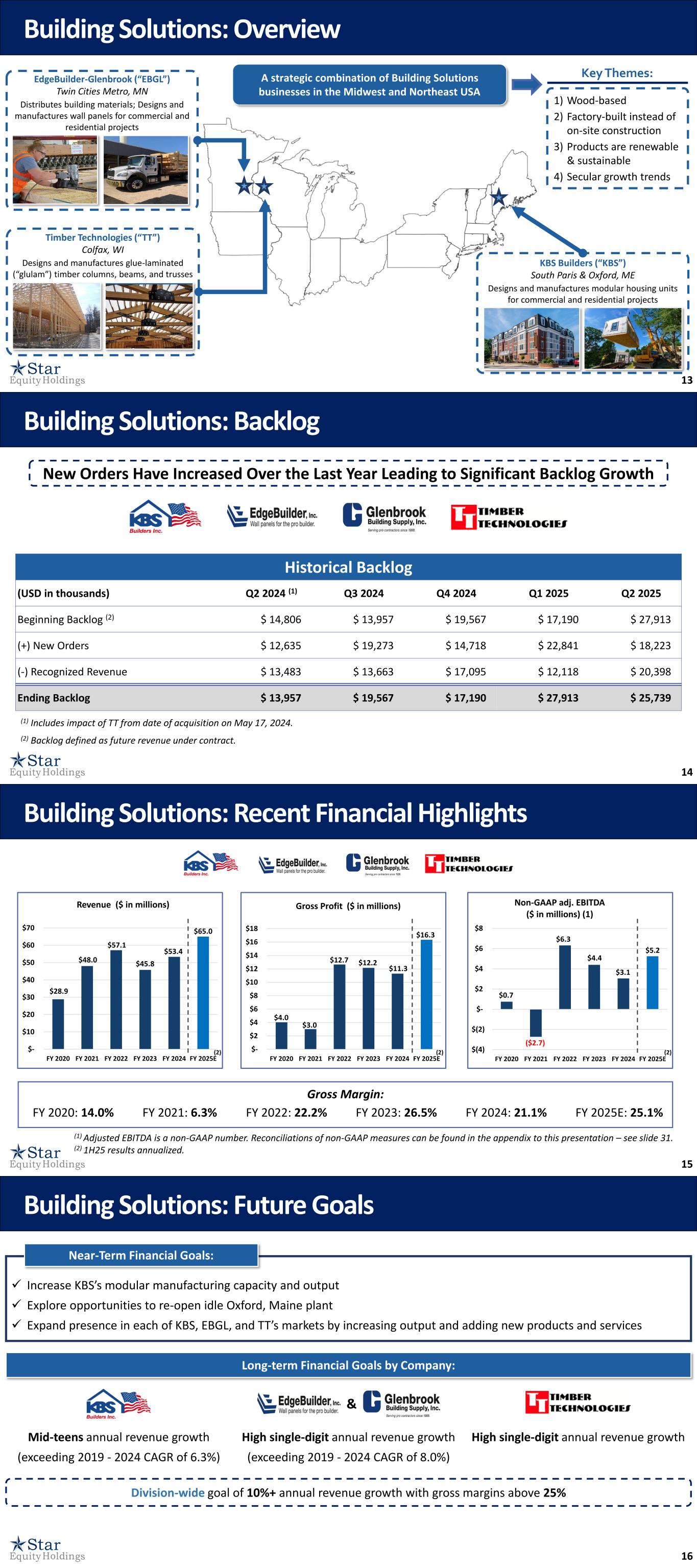 13 Timber Technologies (“TT”) Colfax, WI Designs and manufactures glue-laminated (“glulam”) timber columns, beams, and trusses KBS Builders (“KBS”) South Paris & Oxford, ME Designs and manufactures modular housing units for commercial and residential projects EdgeBuilder-Glenbrook (“EBGL”) Twin Cities Metro, MN Distributes building materials; Designs and manufactures wall panels for commercial and residential projects A strategic combination of Building Solutions businesses in the Midwest and Northeast USA 1) Wood-based 2) Factory-built instead of on-site construction 3) Products are renewable & sustainable 4) Secular growth trends Key Themes: Building Solutions: Overview 14 Building Solutions: Backlog Historical Backlog (USD in thousands) Q2 2024 (1) Q3 2024 Q4 2024 Q1 2025 Q2 2025 Beginning Backlog (2) $ 14,806 $ 13,957 $ 19,567 $ 17,190 $ 27,913 (+) New Orders $ 12,635 $ 19,273 $ 14,718 $ 22,841 $ 18,223 (-) Recognized Revenue $ 13,483 $ 13,663 $ 17,095 $ 12,118 $ 20,398 Ending Backlog $ 13,957 $ 19,567 $ 17,190 $ 27,913 $ 25,739 (1) Includes impact of TT from date of acquisition on May 17, 2024. (2) Backlog defined as future revenue under contract. New Orders Have Increased Over the Last Year Leading to Significant Backlog Growth 15 $28.9 $48.0 $57.1 $45.8 $53.4 $65.0 $- $10 $20 $30 $40 $50 $60 $70 FY 2020 FY 2021 FY 2022 FY 2023 FY 2024 FY 2025E Revenue ($ in millions) $4.0 $3.0 $12.7 $12.2 $11.3 $16.3 $- $2 $4 $6 $8 $10 $12 $14 $16 $18 FY 2020 FY 2021 FY 2022 FY 2023 FY 2024 FY 2025E Gross Profit ($ in millions) $0.7 ($2.7) $6.3 $4.4 $3.1 $5.2 $(4) $(2) $- $2 $4 $6 $8 FY 2020 FY 2021 FY 2022 FY 2023 FY 2024 FY 2025E Non-GAAP adj. EBITDA ($ in millions) (1) Gross Margin: FY 2020: 14.0% FY 2021: 6.3% FY 2022: 22.2% FY 2023: 26.5% FY 2024: 21.1% FY 2025E: 25.1% (1) Adjusted EBITDA is a non-GAAP number. Reconciliations of non-GAAP measures can be found in the appendix to this presentation – see slide 31. (2) 1H25 results annualized. (2) (2) (2) Building Solutions: Recent Financial Highlights 16 ✓ Increase KBS’s modular manufacturing capacity and output ✓ Explore opportunities to re-open idle Oxford, Maine plant ✓ Expand presence in each of KBS, EBGL, and TT’s markets by increasing output and adding new products and services Near-Term Financial Goals: Long-term Financial Goals by Company: Mid-teens annual revenue growth (exceeding 2019 - 2024 CAGR of 6.3%) High single-digit annual revenue growthHigh single-digit annual revenue growth (exceeding 2019 - 2024 CAGR of 8.0%) & Division-wide goal of 10%+ annual revenue growth with gross margins above 25% Building Solutions: Future Goals