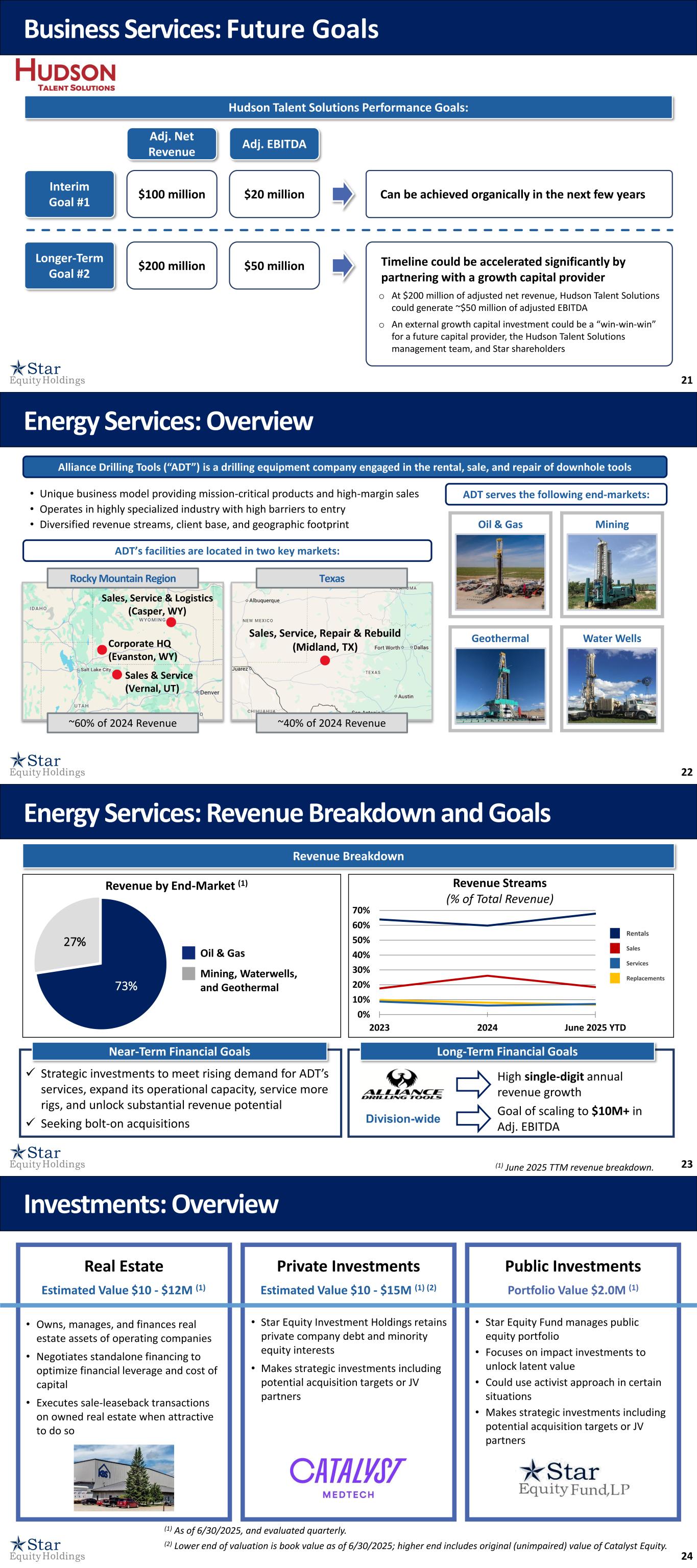 21 Interim Goal #1 Longer-Term Goal #2 $100 million $200 million $20 million $50 million Adj. Net Revenue Adj. EBITDA Hudson Talent Solutions Performance Goals: Can be achieved organically in the next few years Timeline could be accelerated significantly by partnering with a growth capital provider o At $200 million of adjusted net revenue, Hudson Talent Solutions could generate ~$50 million of adjusted EBITDA o An external growth capital investment could be a “win-win-win” for a future capital provider, the Hudson Talent Solutions management team, and Star shareholders Business Services: Future Goals 22 Alliance Drilling Tools (“ADT”) is a drilling equipment company engaged in the rental, sale, and repair of downhole tools Energy Services: Overview Sales, Service & Logistics (Casper, WY) ADT’s facilities are located in two key markets: Water Wells Mining Geothermal Oil & Gas Corporate HQ (Evanston, WY) Sales & Service (Vernal, UT) Rocky Mountain Region ~60% of 2024 Revenue Sales, Service, Repair & Rebuild (Midland, TX) Texas ~40% of 2024 Revenue ADT serves the following end-markets:• Unique business model providing mission-critical products and high-margin sales • Operates in highly specialized industry with high barriers to entry • Diversified revenue streams, client base, and geographic footprint 23 Revenue Breakdown Energy Services: Revenue Breakdown and Goals Rentals Sales Services Replacements 0% 10% 20% 30% 40% 50% 60% 70% 2023 2024 June 2025 YTD Revenue Streams (% of Total Revenue) (1) June 2025 TTM revenue breakdown. 73% 27% Oil & Gas Mining, Waterwells, and Geothermal Revenue by End-Market (1) Long-Term Financial Goals ✓ Strategic investments to meet rising demand for ADT’s services, expand its operational capacity, service more rigs, and unlock substantial revenue potential ✓ Seeking bolt-on acquisitions Near-Term Financial Goals Goal of scaling to $10M+ in Adj. EBITDA Division-wide High single-digit annual revenue growth 24 Private Investments • Star Equity Investment Holdings retains private company debt and minority equity interests • Makes strategic investments including potential acquisition targets or JV partners Investments: Overview Real Estate • Owns, manages, and finances real estate assets of operating companies • Negotiates standalone financing to optimize financial leverage and cost of capital • Executes sale-leaseback transactions on owned real estate when attractive to do so Public Investments • Star Equity Fund manages public equity portfolio • Focuses on impact investments to unlock latent value • Could use activist approach in certain situations • Makes strategic investments including potential acquisition targets or JV partners Estimated Value $10 - $12M (1) Estimated Value $10 - $15M (1) (2) Portfolio Value $2.0M (1) (1) As of 6/30/2025, and evaluated quarterly. (2) Lower end of valuation is book value as of 6/30/2025; higher end includes original (unimpaired) value of Catalyst Equity.