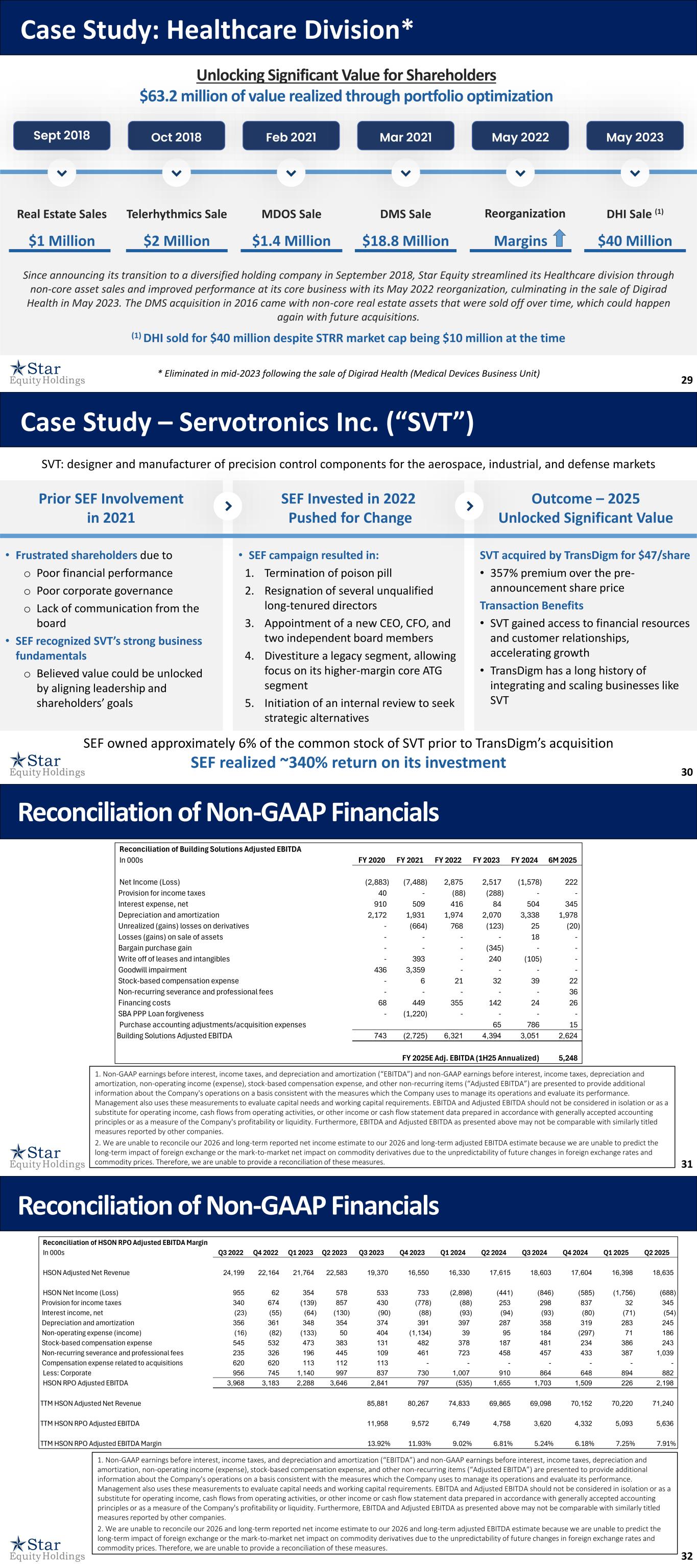 29 Case Study: Healthcare Division* Telerhythmics Sale $2 Million Reorganization Margins DMS Sale $18.8 Million MDOS Sale $1.4 Million DHI Sale (1) $40 Million Real Estate Sales $1 Million Feb 2021 Mar 2021 May 2022 May 2023Oct 2018Sept 2018 Since announcing its transition to a diversified holding company in September 2018, Star Equity streamlined its Healthcare division through non-core asset sales and improved performance at its core business with its May 2022 reorganization, culminating in the sale of Digirad Health in May 2023. The DMS acquisition in 2016 came with non-core real estate assets that were sold off over time, which could happen again with future acquisitions. Unlocking Significant Value for Shareholders $63.2 million of value realized through portfolio optimization (1) DHI sold for $40 million despite STRR market cap being $10 million at the time * Eliminated in mid-2023 following the sale of Digirad Health (Medical Devices Business Unit) 30 Outcome – 2025 Unlocked Significant Value SVT acquired by TransDigm for $47/share • 357% premium over the pre- announcement share price Transaction Benefits • SVT gained access to financial resources and customer relationships, accelerating growth • TransDigm has a long history of integrating and scaling businesses like SVT SEF Invested in 2022 Pushed for Change • SEF campaign resulted in: 1. Termination of poison pill 2. Resignation of several unqualified long-tenured directors 3. Appointment of a new CEO, CFO, and two independent board members 4. Divestiture a legacy segment, allowing focus on its higher-margin core ATG segment 5. Initiation of an internal review to seek strategic alternatives Prior SEF Involvement in 2021 • Frustrated shareholders due to o Poor financial performance o Poor corporate governance o Lack of communication from the board • SEF recognized SVT’s strong business fundamentals o Believed value could be unlocked by aligning leadership and shareholders’ goals Case Study – Servotronics Inc. (“SVT”) SVT: designer and manufacturer of precision control components for the aerospace, industrial, and defense markets SEF owned approximately 6% of the common stock of SVT prior to TransDigm’s acquisition SEF realized ~340% return on its investment 31 Reconciliation of Non-GAAP Financials 1. Non-GAAP earnings before interest, income taxes, and depreciation and amortization (“EBITDA”) and non-GAAP earnings before interest, income taxes, depreciation and amortization, non-operating income (expense), stock-based compensation expense, and other non-recurring items (“Adjusted EBITDA”) are presented to provide additional information about the Company's operations on a basis consistent with the measures which the Company uses to manage its operations and evaluate its performance. Management also uses these measurements to evaluate capital needs and working capital requirements. EBITDA and Adjusted EBITDA should not be considered in isolation or as a substitute for operating income, cash flows from operating activities, or other income or cash flow statement data prepared in accordance with generally accepted accounting principles or as a measure of the Company's profitability or liquidity. Furthermore, EBITDA and Adjusted EBITDA as presented above may not be comparable with similarly titled measures reported by other companies. 2. We are unable to reconcile our 2026 and long-term reported net income estimate to our 2026 and long-term adjusted EBITDA estimate because we are unable to predict the long-term impact of foreign exchange or the mark-to-market net impact on commodity derivatives due to the unpredictability of future changes in foreign exchange rates and commodity prices. Therefore, we are unable to provide a reconciliation of these measures. Reconciliation of Building Solutions Adjusted EBITDA In 000s FY 2020 FY 2021 FY 2022 FY 2023 FY 2024 6M 2025 Net Income (Loss) (2,883) (7,488) 2,875 2,517 (1,578) 222 Provision for income taxes 40 - (88) (288) - - Interest expense, net 910 509 416 84 504 345 Depreciation and amortization 2,172 1,931 1,974 2,070 3,338 1,978 Unrealized (gains) losses on derivatives - (664) 768 (123) 25 (20) Losses (gains) on sale of assets - - - - 18 - Bargain purchase gain - - - (345) - - Write off of leases and intangibles - 393 - 240 (105) - Goodwill impairment 436 3,359 - - - - Stock-based compensation expense - 6 21 32 39 22 Non-recurring severance and professional fees - - - - - 36 Financing costs 68 449 355 142 24 26 SBA PPP Loan forgiveness - (1,220) - - - - Purchase accounting adjustments/acquisition expenses 65 786 15 Building Solutions Adjusted EBITDA 743 (2,725) 6,321 4,394 3,051 2,624 FY 2025E Adj. EBITDA (1H25 Annualized) 5,248 32 1. Non-GAAP earnings before interest, income taxes, and depreciation and amortization (“EBITDA”) and non-GAAP earnings before interest, income taxes, depreciation and amortization, non-operating income (expense), stock-based compensation expense, and other non-recurring items (“Adjusted EBITDA”) are presented to provide additional information about the Company's operations on a basis consistent with the measures which the Company uses to manage its operations and evaluate its performance. Management also uses these measurements to evaluate capital needs and working capital requirements. EBITDA and Adjusted EBITDA should not be considered in isolation or as a substitute for operating income, cash flows from operating activities, or other income or cash flow statement data prepared in accordance with generally accepted accounting principles or as a measure of the Company's profitability or liquidity. Furthermore, EBITDA and Adjusted EBITDA as presented above may not be comparable with similarly titled measures reported by other companies. 2. We are unable to reconcile our 2026 and long-term reported net income estimate to our 2026 and long-term adjusted EBITDA estimate because we are unable to predict the long-term impac