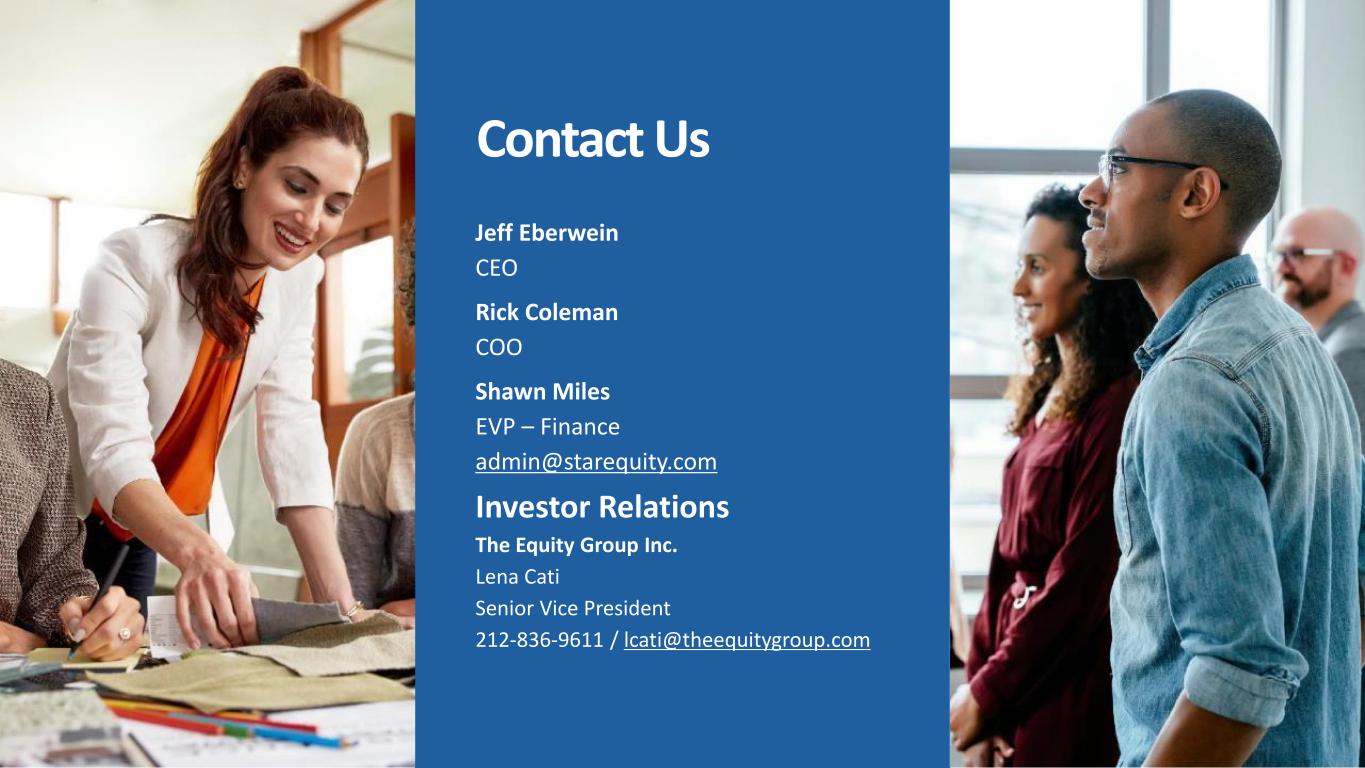 33 Contact Us Jeff Eberwein CEO Rick Coleman COO Shawn Miles EVP – Finance admin@starequity.com Investor Relations The Equity Group Inc. Lena Cati Senior Vice President 212-836-9611 / lcati@theequitygroup.com