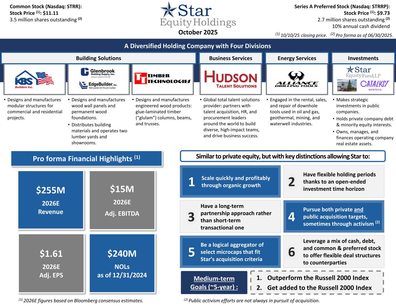 October 2025 A Diversified Holding Company with Four Divisions Common Stock (Nasdaq: STRR): Stock Price (1): $11.11 3.5 million shares outstanding (2) Series A Preferred Stock (Nasdaq: STRRP): Stock Price (1): $9.73 2.7 million shares outstanding (2) 10% annual cash dividend (1) 10/10/25 closing price. (2) Pro forma as of 06/30/2025. 1 Scale quickly and profitably through organic growth 2 Have flexible holding periods thanks to an open-ended investment time horizon 3 Have a long-term partnership approach rather than short-term transactional one 5 Be a logical aggregator of select microcaps that fit Star’s acquisition criteria 6 Leverage a mix of cash, debt, and common & preferred stock to offer flexible deal structures to counterparties 4 Pursue both private and public acquisition targets, sometimes through activism (2) Similar to private equity, but with key distinctions allowing Star to: 1. Outperform the Russell 2000 Index 2. Get added to the Russell 2000 Index (1) 2026E figures based on Bloomberg consensus estimates. $1.61 2026E Adj. EPS $240M NOLs as of 12/31/2024 $255M 2026E Revenue $15M 2026E Adj. EBITDA Pro forma Financial Highlights (1) (2) Public activism efforts are not always in pursuit of acquisition. A Diversified Holding Company with Four Divisions • Makes strategic investments in public companies. • Holds private company debt & minority equity interests. • Owns, manages, and finances operating company real estate assets. • Designs and manufactures modular structures for commercial and residential projects. • Engaged in the rental, sales, and repair of downhole tools used in oil and gas, geothermal, mining, and waterwell industries. • Global total talent solutions provider: partners with talent acquisition, HR, and procurement leaders around the world to build diverse, high-impact teams, and drive business success. • Designs and manufactures engineered wood products: glue-laminated timber (“glulam”) columns, beams, and trusses. • Designs and manufactures wood wall panels and permanent wood foundations. • Distributes building materials and operates two lumber yards and showrooms. Energy ServicesBusiness ServicesBuilding Solutions Investments Medium-term Goals (~5-year) :