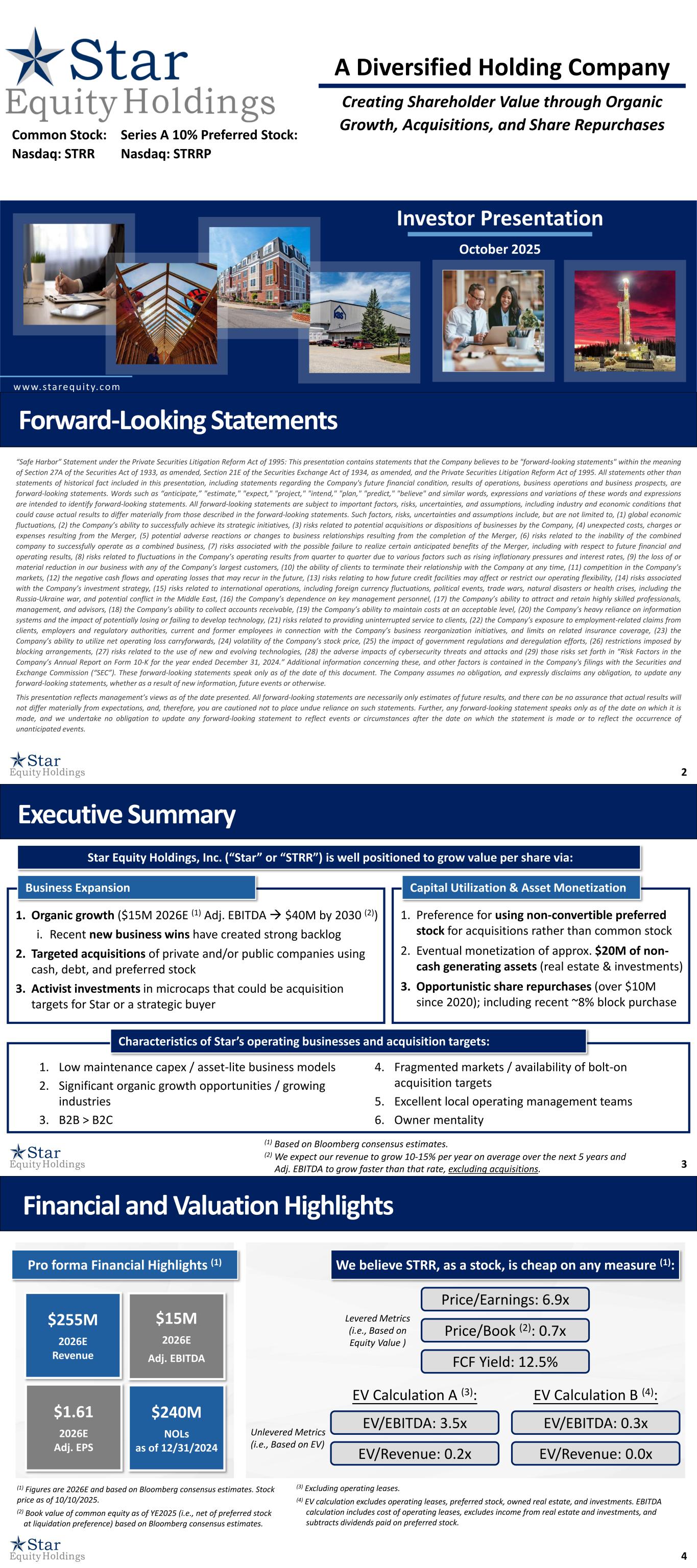 1 A Diversified Holding Company www.starequity.com Creating Shareholder Value through Organic Growth, Acquisitions, and Share Repurchases Investor Presentation October 2025 Common Stock: Nasdaq: STRR Series A 10% Preferred Stock: Nasdaq: STRRP 2 “Safe Harbor” Statement under the Private Securities Litigation Reform Act of 1995: This presentation contains statements that the Company believes to be "forward-looking statements" within the meaning of Section 27A of the Securities Act of 1933, as amended, Section 21E of the Securities Exchange Act of 1934, as amended, and the Private Securities Litigation Reform Act of 1995. All statements other than statements of historical fact included in this presentation, including statements regarding the Company's future financial condition, results of operations, business operations and business prospects, are forward-looking statements. Words such as “anticipate,” "estimate," "expect," "project," "intend," "plan," "predict," "believe" and similar words, expressions and variations of these words and expressions are intended to identify forward-looking statements. All forward-looking statements are subject to important factors, risks, uncertainties, and assumptions, including industry and economic conditions that could cause actual results to differ materially from those described in the forward-looking statements. Such factors, risks, uncertainties and assumptions include, but are not limited to, (1) global economic fluctuations, (2) the Company’s ability to successfully achieve its strategic initiatives, (3) risks related to potential acquisitions or dispositions of businesses by the Company, (4) unexpected costs, charges or expenses resulting from the Merger, (5) potential adverse reactions or changes to business relationships resulting from the completion of the Merger, (6) risks related to the inability of the combined company to successfully operate as a combined business, (7) risks associated with the possible failure to realize certain anticipated benefits of the Merger, including with respect to future financial and operating results, (8) risks related to fluctuations in the Company’s operating results from quarter to quarter due to various factors such as rising inflationary pressures and interest rates, (9) the loss of or material reduction in our business with any of the Company’s largest customers, (10) the ability of clients to terminate their relationship with the Company at any time, (11) competition in the Company’s markets, (12) the negative cash flows and operating losses that may recur in the future, (13) risks relating to how future credit facilities may affect or restrict our operating flexibility, (14) risks associated with the Company’s investment strategy, (15) risks related to international operations, including foreign currency fluctuations, political events, trade wars, natural disasters or health crises, including the Russia-Ukraine war, and potential conflict in the Middle East, (16) the Company’s dependence on key management personnel, (17) the Company’s ability to attract and retain highly skilled professionals, management, and advisors, (18) the Company’s ability to collect accounts receivable, (19) the Company’s ability to maintain costs at an acceptable level, (20) the Company’s heavy reliance on information systems and the impact of potentially losing or failing to develop technology, (21) risks related to providing uninterrupted service to clients, (22) the Company’s exposure to employment-related claims from clients, employers and regulatory authorities, current and former employees in connection with the Company’s business reorganization initiatives, and limits on related insurance coverage, (23) the Company’s ability to utilize net operating loss carryforwards, (24) volatility of the Company’s stock price, (25) the impact of government regulations and deregulation efforts, (26) restrictions imposed by blocking arrangements, (27) risks related to the use of new and evolving technologies, (28) the adverse impacts of cybersecurity threats and attacks and (29) those risks set forth in “Risk Factors in the Company’s Annual Report on Form 10-K for the year ended December 31, 2024.” Additional information concerning these, and other factors is contained in the Company's filings with the Securities and Exchange Commission (“SEC”). These forward-looking statements speak only as of the date of this document. The Company assumes no obligation, and expressly disclaims any obligation, to update any forward-looking statements, whether as a result of new information, future events or otherwise. This presentation reflects management’s views as of the date presented. All forward-looking statements are necessarily only estimates of future results, and there can be no assurance that actual results will not differ materially from expectations, and, therefore, you are cautioned not to place undue reliance on such statements. Further, any forward-looking statement speaks only as of the date on which it is made, and we undertake no obligation to update any forward-looking statement to reflect events or circumstances after the date on which the statement is made or to reflect the occurrence of unanticipated events. Forward-Looking Statements 3 Executive Summary (1) Based on Bloomberg consensus estimates. 1. Low maintenance capex / asset-lite business models 2. Significant organic growth opportunities / growing industries 3. B2B > B2C 4. Fragmented markets / availability of bolt-on acquisition targets 5. Excellent local operating management teams 6. Owner mentality Characteristics of Star’s operating businesses and acquisition targets: (2) We expect our revenue to grow 10-15% per year on average over the next 5 years and Adj. EBITDA to grow faster than that rate, excluding acquisitions. Star Equity Holdings, Inc. (“Star” or “STRR”) is well positioned to grow value per share via: 1