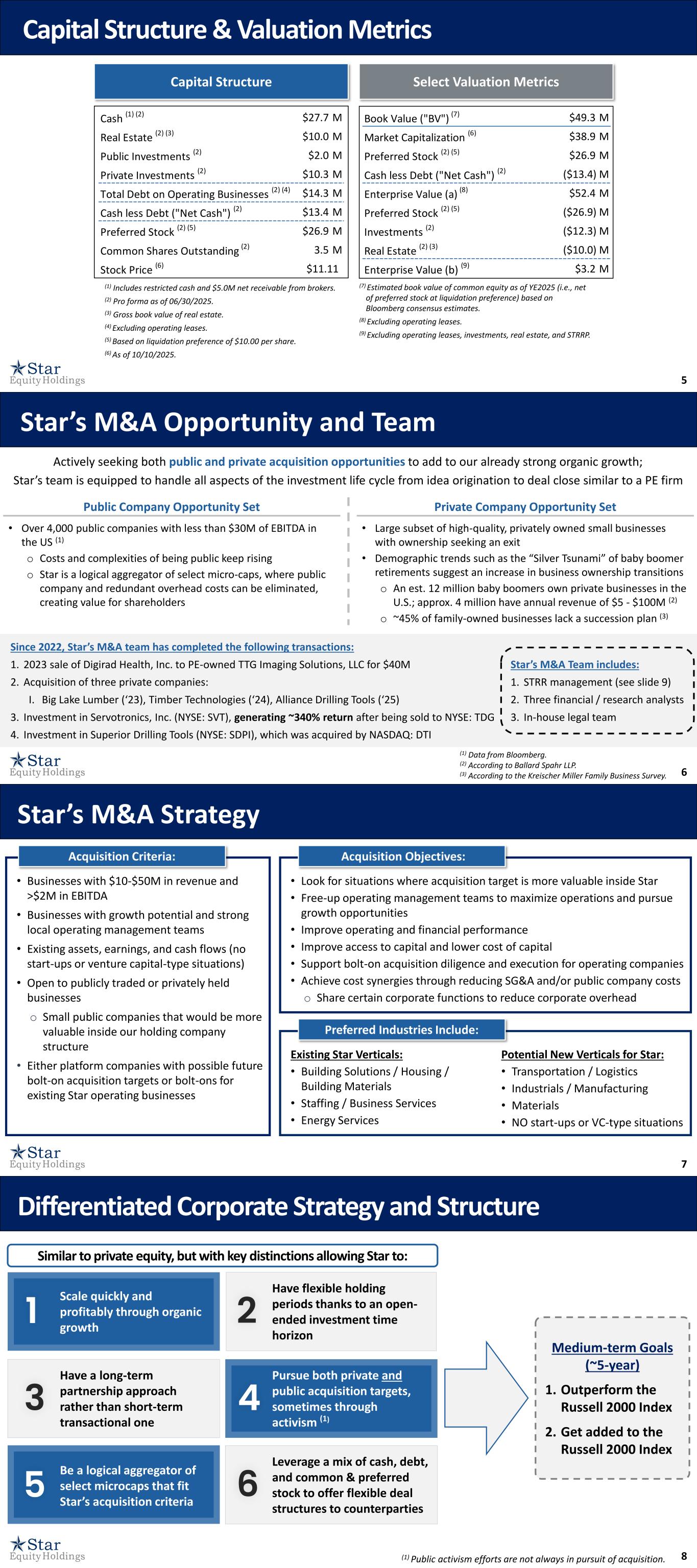 5 Capital Structure & Valuation Metrics (1) Includes restricted cash and $5.0M net receivable from brokers. (2) Pro forma as of 06/30/2025. (3) Gross book value of real estate. (4) Excluding operating leases. (5) Based on liquidation preference of $10.00 per share. (6) As of 10/10/2025. (7) Estimated book value of common equity as of YE2025 (i.e., net of preferred stock at liquidation preference) based on Bloomberg consensus estimates. (8) Excluding operating leases. (9) Excluding operating leases, investments, real estate, and STRRP. Capital Structure Select Valuation Metrics Cash (1) (2) $27.7 M Real Estate (2) (3) $10.0 M Public Investments (2) $2.0 M Private Investments (2) $10.3 M Total Debt on Operating Businesses (2) (4) $14.3 M Cash less Debt ("Net Cash") (2) $13.4 M Preferred Stock (2) (5) $26.9 M Common Shares Outstanding (2) 3.5 M Stock Price (6) $11.11 Book Value ("BV") (7) $49.3 M Market Capitalization (6) $38.9 M Preferred Stock (2) (5) $26.9 M Cash less Debt ("Net Cash") (2) ($13.4) M Enterprise Value (a) (8) $52.4 M Preferred Stock (2) (5) ($26.9) M Investments (2) ($12.3) M Real Estate (2) (3) ($10.0) M Enterprise Value (b) (9) $3.2 M 6 Star’s M&A Opportunity and Team Actively seeking both public and private acquisition opportunities to add to our already strong organic growth; Star’s team is equipped to handle all aspects of the investment life cycle from idea origination to deal close similar to a PE firm (1) Data from Bloomberg. (2) According to Ballard Spahr LLP. (3) According to the Kreischer Miller Family Business Survey. Public Company Opportunity Set • Over 4,000 public companies with less than $30M of EBITDA in the US (1) o Costs and complexities of being public keep rising o Star is a logical aggregator of select micro-caps, where public company and redundant overhead costs can be eliminated, creating value for shareholders Private Company Opportunity Set • Large subset of high-quality, privately owned small businesses with ownership seeking an exit • Demographic trends such as the “Silver Tsunami” of baby boomer retirements suggest an increase in business ownership transitions o An est. 12 million baby boomers own private businesses in the U.S.; approx. 4 million have annual revenue of $5 - $100M (2) o ~45% of family-owned businesses lack a succession plan (3) Since 2022, Star’s M&A team has completed the following transactions: 1. 2023 sale of Digirad Health, Inc. to PE-owned TTG Imaging Solutions, LLC for $40M 2. Acquisition of three private companies: I. Big Lake Lumber (‘23), Timber Technologies (‘24), Alliance Drilling Tools (‘25) 3. Investment in Servotronics, Inc. (NYSE: SVT), generating ~340% return after being sold to NYSE: TDG 4. Investment in Superior Drilling Tools (NYSE: SDPI), which was acquired by NASDAQ: DTI Star’s M&A Team includes: 1. STRR management (see slide 9) 2. Three financial / research analysts 3. In-house legal team 7 • Businesses with $10-$50M in revenue and >$2M in EBITDA • Businesses with growth potential and strong local operating management teams • Existing assets, earnings, and cash flows (no start-ups or venture capital-type situations) • Open to publicly traded or privately held businesses o Small public companies that would be more valuable inside our holding company structure • Either platform companies with possible future bolt-on acquisition targets or bolt-ons for existing Star operating businesses Acquisition Criteria: • Look for situations where acquisition target is more valuable inside Star • Free-up operating management teams to maximize operations and pursue growth opportunities • Improve operating and financial performance • Improve access to capital and lower cost of capital • Support bolt-on acquisition diligence and execution for operating companies • Achieve cost synergies through reducing SG&A and/or public company costs o Share certain corporate functions to reduce corporate overhead Acquisition Objectives: Existing Star Verticals: • Building Solutions / Housing / Building Materials • Staffing / Business Services • Energy Services Potential New Verticals for Star: • Transportation / Logistics • Industrials / Manufacturing • Materials • NO start-ups or VC-type situations Preferred Industries Include: Star’s M&A Strategy 8(1) Public activism efforts are not always in pursuit of acquisition. Differentiated Corporate Strategy and Structure 1 Scale quickly and profitably through organic growth 3 5 Have a long-term partnership approach rather than short-term transactional one 2 4 Have flexible holding periods thanks to an open- ended investment time horizon 6Be a logical aggregator of select microcaps that fit Star’s acquisition criteria Similar to private equity, but with key distinctions allowing Star to: Leverage a mix of cash, debt, and common & preferred stock to offer flexible deal structures to counterparties Pursue both private and public acquisition targets, sometimes through activism (1) Medium-term Goals (~5-year) 1. Outperform the Russell 2000 Index 2. Get added to the Russell 2000 Index