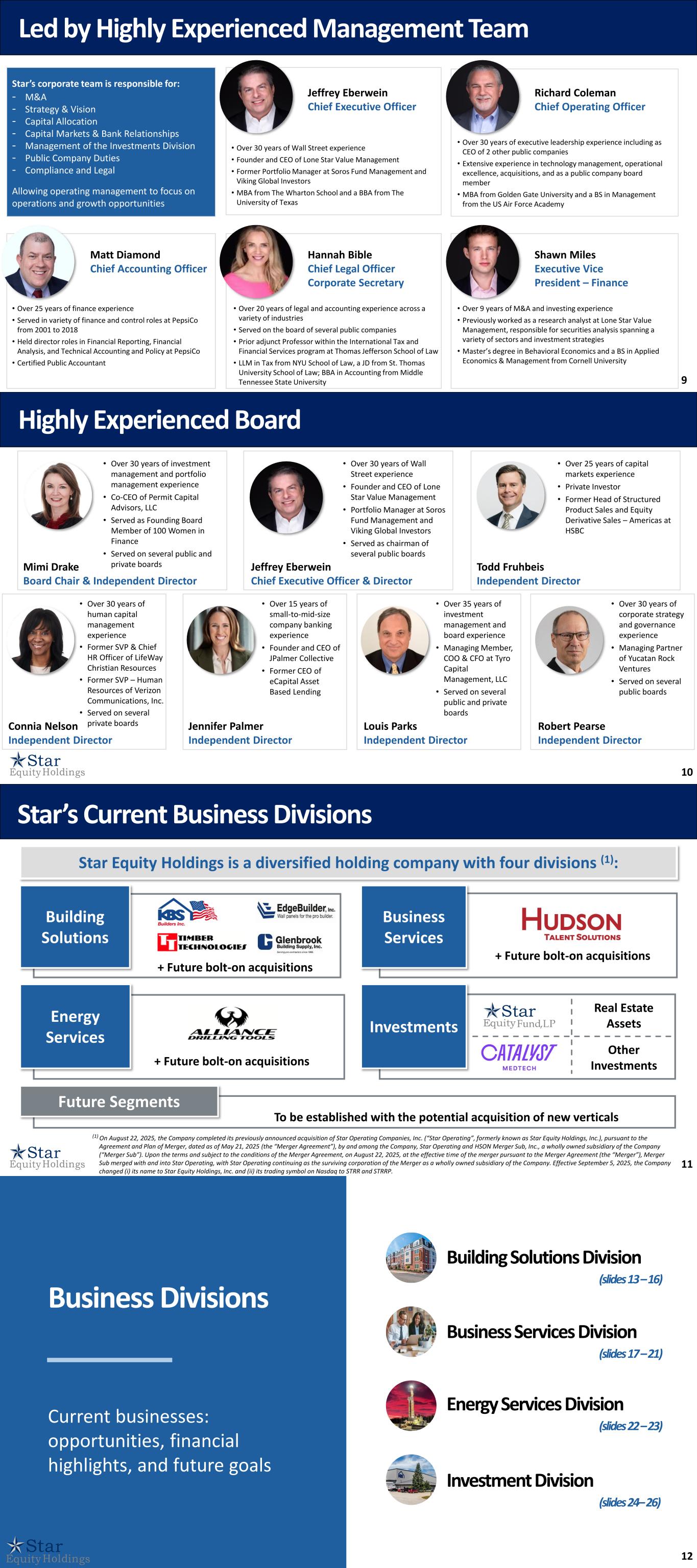 9 Star’s corporate team is responsible for: - M&A - Strategy & Vision - Capital Allocation - Capital Markets & Bank Relationships - Management of the Investments Division - Public Company Duties - Compliance and Legal Allowing operating management to focus on operations and growth opportunities Led by Highly Experienced Management Team Jeffrey Eberwein Chief Executive Officer • Over 30 years of Wall Street experience • Founder and CEO of Lone Star Value Management • Former Portfolio Manager at Soros Fund Management and Viking Global Investors • MBA from The Wharton School and a BBA from The University of Texas Richard Coleman Chief Operating Officer • Over 30 years of executive leadership experience including as CEO of 2 other public companies • Extensive experience in technology management, operational excellence, acquisitions, and as a public company board member • MBA from Golden Gate University and a BS in Management from the US Air Force Academy • Over 9 years of M&A and investing experience • Previously worked as a research analyst at Lone Star Value Management, responsible for securities analysis spanning a variety of sectors and investment strategies • Master’s degree in Behavioral Economics and a BS in Applied Economics & Management from Cornell University Shawn Miles Executive Vice President – Finance • Over 25 years of finance experience • Served in variety of finance and control roles at PepsiCo from 2001 to 2018 • Held director roles in Financial Reporting, Financial Analysis, and Technical Accounting and Policy at PepsiCo • Certified Public Accountant Matt Diamond Chief Accounting Officer • Over 20 years of legal and accounting experience across a variety of industries • Served on the board of several public companies • Prior adjunct Professor within the International Tax and Financial Services program at Thomas Jefferson School of Law • LLM in Tax from NYU School of Law, a JD from St. Thomas University School of Law; BBA in Accounting from Middle Tennessee State University Hannah Bible Chief Legal Officer Corporate Secretary 10 Highly Experienced Board Jeffrey Eberwein Chief Executive Officer & Director • Over 30 years of Wall Street experience • Founder and CEO of Lone Star Value Management • Portfolio Manager at Soros Fund Management and Viking Global Investors • Served as chairman of several public boards • Over 15 years of small-to-mid-size company banking experience • Founder and CEO of JPalmer Collective • Former CEO of eCapital Asset Based Lending Jennifer Palmer Independent Director Louis Parks Independent Director • Over 35 years of investment management and board experience • Managing Member, COO & CFO at Tyro Capital Management, LLC • Served on several public and private boards Todd Fruhbeis Independent Director • Over 25 years of capital markets experience • Private Investor • Former Head of Structured Product Sales and Equity Derivative Sales – Americas at HSBC Mimi Drake Board Chair & Independent Director • Over 30 years of investment management and portfolio management experience • Co-CEO of Permit Capital Advisors, LLC • Served as Founding Board Member of 100 Women in Finance • Served on several public and private boards Connia Nelson Independent Director • Over 30 years of human capital management experience • Former SVP & Chief HR Officer of LifeWay Christian Resources • Former SVP – Human Resources of Verizon Communications, Inc. • Served on several private boards Robert Pearse Independent Director • Over 30 years of corporate strategy and governance experience • Managing Partner of Yucatan Rock Ventures • Served on several public boards 11 Star Equity Holdings is a diversified holding company with four divisions (1): Investments Investments Future Segments To be established with the potential acquisition of new verticals Business Services Building Solutions Building Solutions Business Services i i + Future bolt-on acquisitions + Future bolt-on acquisitions Star’s Current Business Divisions Other Investments Business Services Business Services Real Estate Assets Investments + Future bolt-on acquisitions Energy Services (1) On August 22, 2025, the Company completed its previously announced acquisition of Star Operating Companies, Inc. (“Star Operating”, formerly known as Star Equity Holdings, Inc.), pursuant to the Agreement and Plan of Merger, dated as of May 21, 2025 (the “Merger Agreement”), by and among the Company, Star Operating and HSON Merger Sub, Inc., a wholly owned subsidiary of the Company (“Merger Sub”). Upon the terms and subject to the conditions of the Merger Agreement, on August 22, 2025, at the effective time of the merger pursuant to the Merger Agreement (the “Merger”), Merger Sub merged with and into Star Operating, with Star Operating continuing as the surviving corporation of the Merger as a wholly owned subsidiary of the Company. Effective September 5, 2025, the Company changed (i) its name to Star Equity Holdings, Inc. and (ii) its trading symbol on Nasdaq to STRR and STRRP. 12 Business Services Division (slides 17 – 21) Energy Services Division (slides 22 – 23) Investment Division (slides 24– 26) Business Divisions Current businesses: opportunities, financial highlights, and future goals Building Solutions Division (slides 13 – 16)