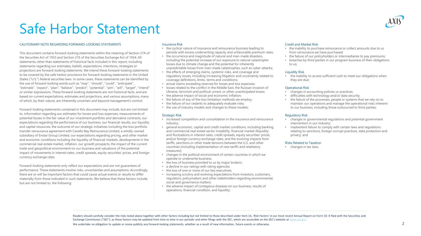 Safe Harbor Statement  2 CAUTIONARY NOTE REGARDING FORWARD-LOOKING STATEMENTS This document contains forward-looking statements within the meaning of Section 27A of  the Securities Act of 1933 and Section 21E of the Securities Exchange Act of 1934. All  statements, other than statements of historical facts included in this report, including  statements regarding our estimates, beliefs, expectations, intentions, strategies or  projections are forward-looking statements. We intend these forward-looking statements  to be covered by the safe harbor provisions for forward-looking statements in the United  States ("U.S.") federal securities laws. In some cases, these statements can be identified by  the use of forward-looking words such as "may", "should", "could", "anticipate",  "estimate", "expect", "plan", "believe", "predict", "potential", "aim", "will", "target", "intend"  or similar expressions. These forward-looking statements are not historical facts, and are  based on current expectations, estimates and projections, and various assumptions, many  of which, by their nature, are inherently uncertain and beyond management's control. Forward-looking statements contained in this document may include, but are not limited  to, information regarding our estimates for losses and loss expenses, measurements of  potential losses in the fair value of our investment portfolio and derivative contracts, our  expectations regarding the performance of our business, our financial results, our liquidity  and capital resources, the outcome of our strategic initiatives including the loss portfolio  transfer reinsurance agreement with Cavello Bay Reinsurance Limited, a wholly-owned  subsidiary of Enstar Group Limited, our expectations regarding pricing, and other market  and economic conditions including the liquidity of financial markets, developments in the  commercial real estate market, inflation, our growth prospects, the impact of the current  trade and geopolitical environment on our business and valuations of the potential  impact of movements in interest rates, credit spreads, equity securities' prices, and foreign  currency exchange rates. Forward-looking statements only reflect our expectations and are not guarantees of  performance. These statements involve risks, uncertainties and assumptions. Accordingly,  there are or will be important factors that could cause actual events or results to differ  materially from those indicated in such statements. We believe that these factors include,  but are not limited to, the following: Insurance Risk • the cyclical nature of insurance and reinsurance business leading to  periods with excess underwriting capacity and unfavorable premium rates; • the occurrence and magnitude of natural and man-made disasters,  including the potential increase of our exposure to natural catastrophe  losses due to climate change and the potential for inherently  unpredictable losses from man-made catastrophes, such as cyber-attacks;  • the effects of emerging claims, systemic risks, and coverage and  regulatory issues, including increasing litigation and uncertainty related to  coverage definitions, limits, terms and conditions;  • actual claims exceeding reserves for losses and loss expenses; • losses related to the conflict in the Middle East, the Russian invasion of  Ukraine, terrorism and political unrest, or other unanticipated losses; • the adverse impact of social and economic inflation; • the failure of any of the loss limitation methods we employ; • the failure of our cedants to adequately evaluate risks; • the use of industry models and changes to these models; Strategic Risk • increased competition and consolidation in the insurance and reinsurance  industry; • general economic, capital and credit market conditions, including banking  and commercial real estate sector instability, financial market illiquidity  and fluctuations in interest rates, credit spreads, equity securities' prices,  and/or foreign currency exchange rates, and the evolving impacts from  tariffs, sanctions or other trade tensions between the U.S. and other  countries (including implementation of new tariffs and retaliatory  measures); • changes in the political environment of certain countries in which we  operate or underwrite business; • the loss of business provided to us by major brokers; • a decline in our ratings with rating agencies; • the loss of one or more of our key executives; • increasing scrutiny and evolving expectations from investors, customers,  regulators, policymakers and other stakeholders regarding environmental,  social and governance matters; • the adverse impact of contagious diseases on our business, results of  operations, financial condition, and liquidity; Readers should carefully consider the risks noted above together with other factors including but not limited to those described under Item 1A, 'Risk Factors' in our most recent Annual Report on Form 10- K filed with the Securities and  Exchange Commission ("SEC"), as those factors may be updated from time to time in our periodic and other filings with the SEC, which are accessible on the SEC’s website at www.sec.gov. We undertake no obligation to update or revise publicly any forward-looking statements, whether as a result of new information, future events or otherwise. Credit and Market Risk • the inability to purchase reinsurance or collect amounts due to us  from reinsurance we have purchased; • the failure of our policyholders or intermediaries to pay premiums; • breaches by third parties in our program business of their obligations  to us; Liquidity Risk • the inability to access sufficient cash to meet our obligations when  they are due; Operational Risk • changes in accounting policies or practices;  • difficulties with technology and/or data security; • the failure of the processes, people or systems that we rely on to  maintain our operations and manage