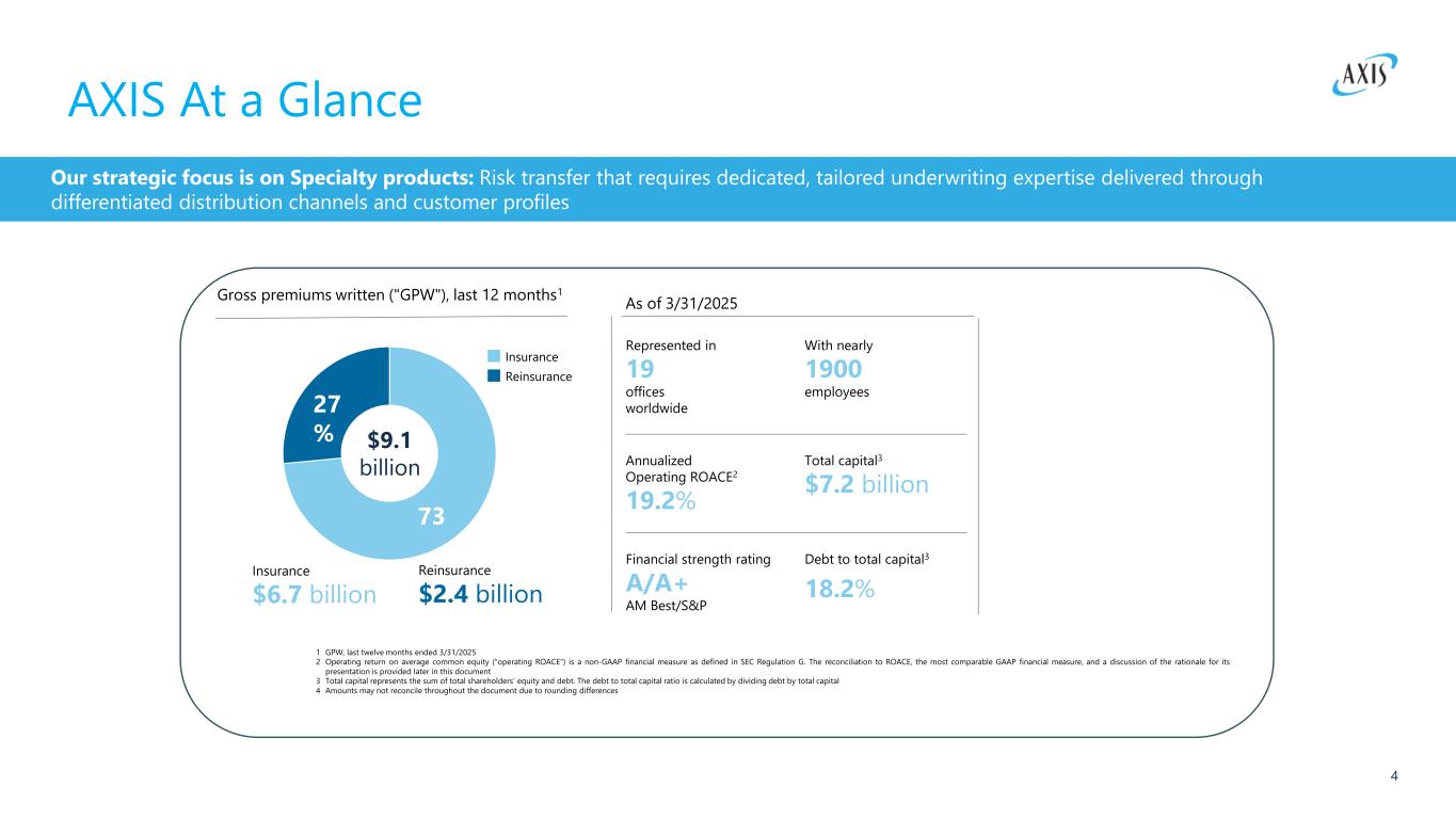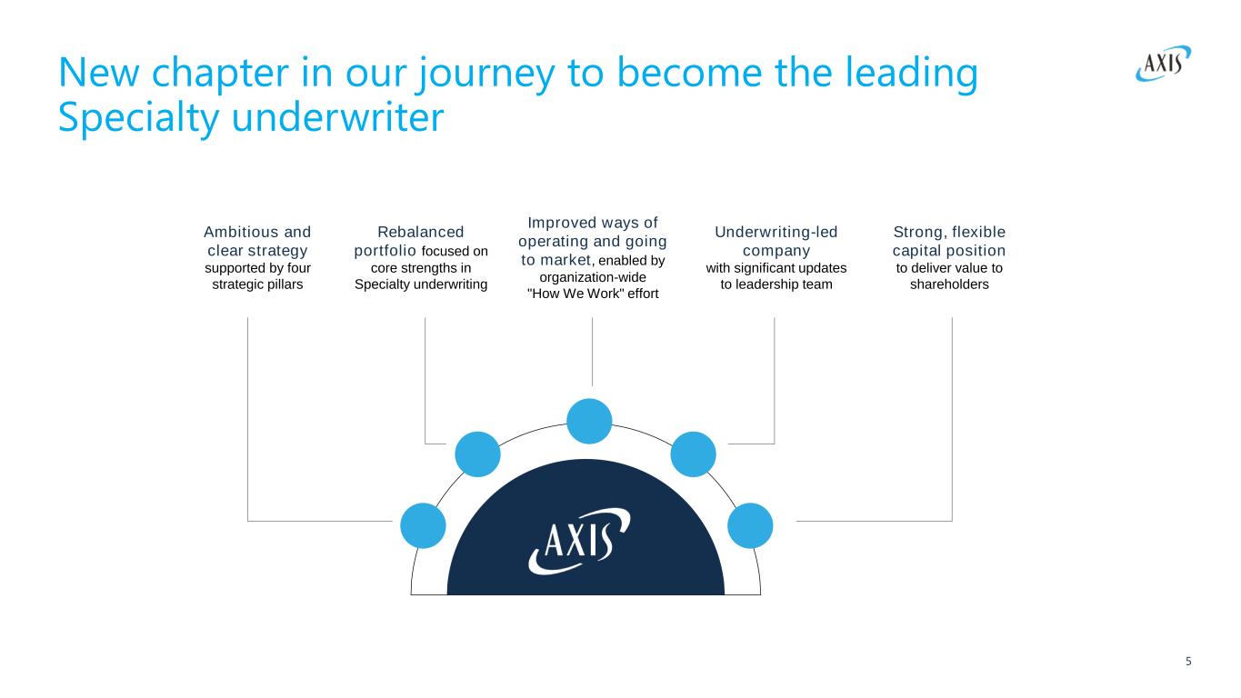 AXIS At a Glance 4 Our strategic focus is on Specialty products: Risk transfer that requires dedicated, tailored underwriting expertise delivered through  differentiated distribution channels and customer profiles 73 27 % Insurance Reinsurance Annualized  Operating ROACE2 19.2% Total capital3 $7.2 billion Financial strength rating A/A+ AM Best/S&P Debt to total capital3 18.2% Represented in  19  offices  worldwide With nearly 1900  employees Insurance $6.7 billion Reinsurance $2.4 billion $9.1 billion 1 GPW, last twelve months ended 3/31/2025 2 Operating return on average common equity ("operating ROACE") is a non-GAAP financial measure as defined in SEC Regulation G. The reconciliation to ROACE, the most comparable GAAP financial measure, and a discussion of the rationale for its  presentation is provided later in this document 3 Total capital represents the sum of total shareholders' equity and debt. The debt to total capital ratio is calculated by dividing debt by total capital 4 Amounts may not reconcile throughout the document due to rounding differences Gross premiums written ("GPW"), last 12 months1  As of 3/31/2025
