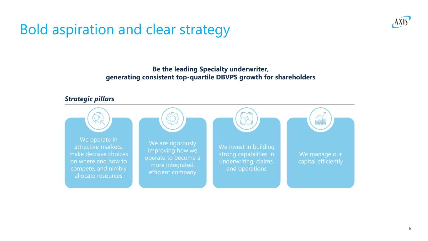 5 New chapter in our journey to become the leading  Specialty underwriter Ambitious and  clear strategy  supported by four  strategic pillars Rebalanced  portfolio focused on  core strengths in  Specialty underwriting Improved ways of  operating and going  to market, enabled by  organization-wide  "How We Work" effort Underwriting-led  company  with significant updates  to leadership team Strong, flexible  capital position  to deliver value to  shareholders