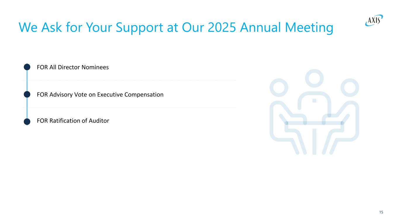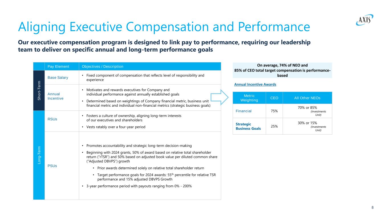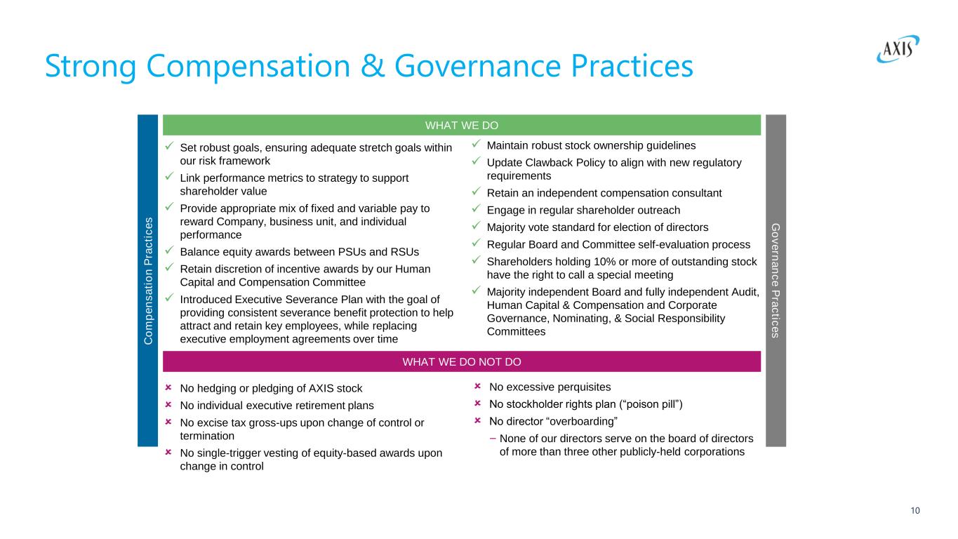Strong Compensation & Governance Practices 10 C o m p e n s a ti o n  P ra c ti c e s ✓ Set robust goals, ensuring adequate stretch goals within  our risk framework ✓ Link performance metrics to strategy to support  shareholder value ✓ Provide appropriate mix of fixed and variable pay to  reward Company, business unit, and individual  performance ✓ Balance equity awards between PSUs and RSUs ✓ Retain discretion of incentive awards by our Human  Capital and Compensation Committee ✓ Introduced Executive Severance Plan with the goal of  providing consistent severance benefit protection to help  attract and retain key employees, while replacing  executive employment agreements over time  No hedging or pledging of AXIS stock  No individual executive retirement plans  No excise tax gross-ups upon change of control or  termination  No single-trigger vesting of equity-based awards upon  change in control ✓ Maintain robust stock ownership guidelines ✓ Update Clawback Policy to align with new regulatory  requirements ✓ Retain an independent compensation consultant ✓ Engage in regular shareholder outreach ✓ Majority vote standard for election of directors ✓ Regular Board and Committee self-evaluation process ✓ Shareholders holding 10% or more of outstanding stock  have the right to call a special meeting ✓ Majority independent Board and fully independent Audit,  Human Capital & Compensation and Corporate  Governance, Nominating, & Social Responsibility  Committees  No excessive perquisites  No stockholder rights plan (“poison pill”)  No director “overboarding”  ‒ None of our directors serve on the board of directors  of more than three other publicly-held corporations WHAT WE DO WHAT WE DO NOT DO G o v e rn a n c e  P ra c tic e s