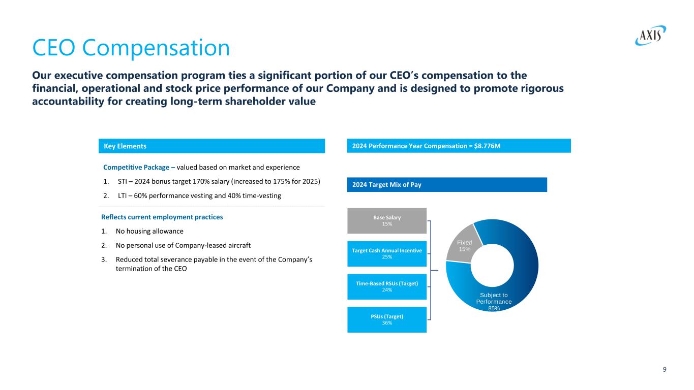 Aligning Executive Compensation and Performance 8 Our executive compensation program is designed to link pay to performance, requiring our leadership  team to deliver on specific annual and long-term performance goals Pay Element Objectives / Description S h o rt -T e rm Base Salary • Fixed component of compensation that reflects level of responsibility and  experience Annual  Incentive • Motivates and rewards executives for Company and  individual performance against annually established goals • Determined based on weightings of Company financial metric, business unit  financial metric and individual non-financial metrics (strategic business goals) L o n g -T e rm RSUs • Fosters a culture of ownership, aligning long-term interests  of our executives and shareholders • Vests ratably over a four-year period PSUs • Promotes accountability and strategic long-term decision-making • Beginning with 2024 grants, 50% of award based on relative total shareholder  return (“rTSR”) and 50% based on adjusted book value per diluted common share  (“Adjusted DBVPS”) growth • Prior awards determined solely on relative total shareholder return • Target performance goals for 2024 awards: 55th percentile for relative TSR  performance and 15% adjusted DBVPS Growth • 3-year performance period with payouts ranging from 0% - 200% On average, 74% of NEO and  85% of CEO total target compensation is performance- based Metric  Weighting CEO All Other NEOs Financial 75% 70% or 85%  (Investments  Unit) Strategic  Business Goals 25% 30% or 15%  (Investments  Unit) Annual Incentive Awards