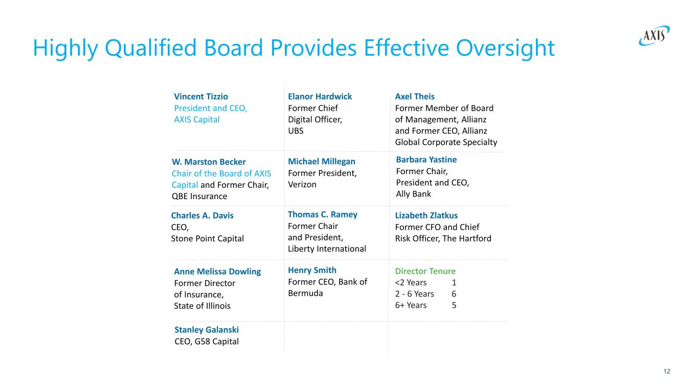 12 Highly Qualified Board Provides Effective Oversight  Vincent Tizzio President and CEO, AXIS Capital W. Marston Becker Chair of the Board of AXIS  Capital and Former Chair,  QBE Insurance Charles A. Davis CEO, Stone Point Capital  Anne Melissa Dowling Former Director  of Insurance, State of Illinois Elanor Hardwick Former Chief  Digital Officer, UBS Michael Millegan Former President, Verizon Henry Smith Former CEO, Bank of  Bermuda Thomas C. Ramey Former Chair  and President, Liberty International Axel Theis Former Member of Board  of Management, Allianz  and Former CEO, Allianz  Global Corporate Specialty Barbara Yastine Former Chair,  President and CEO, Ally Bank  Lizabeth Zlatkus Former CFO and Chief  Risk Officer, The Hartford Director Tenure <2 Years   1 2 - 6 Years        6 6+ Years   5 Stanley Galanski CEO, G58 Capital