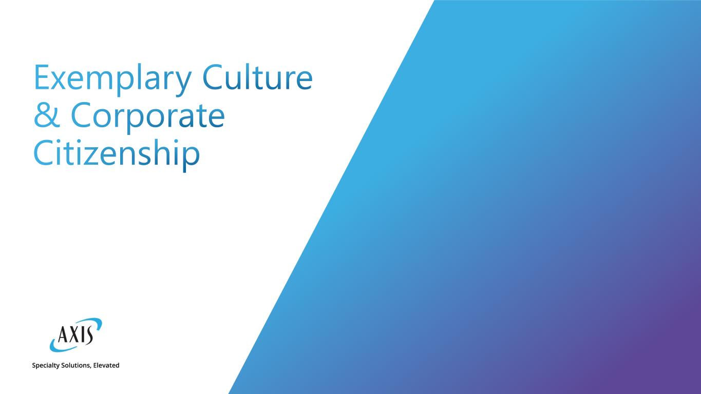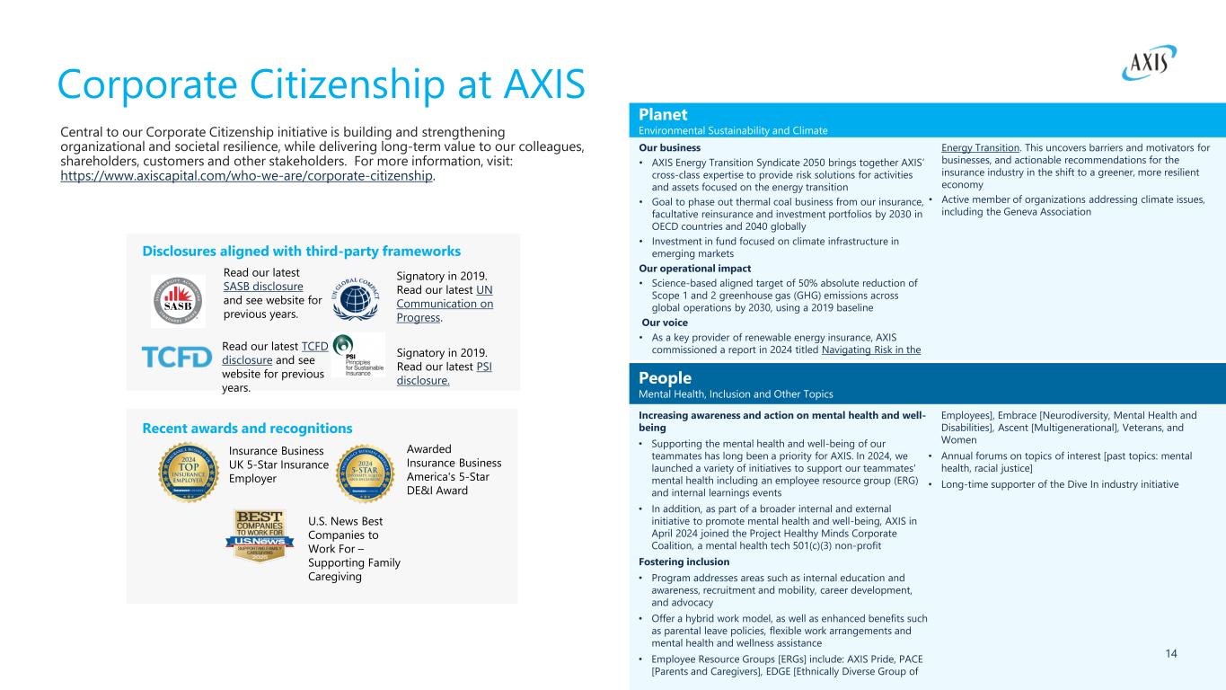 14 Corporate Citizenship at AXIS Increasing awareness and action on mental health and well- being • Supporting the mental health and well-being of our  teammates has long been a priority for AXIS. In 2024, we  launched a variety of initiatives to support our teammates'  mental health including an employee resource group (ERG)  and internal learnings events  • In addition, as part of a broader internal and external  initiative to promote mental health and well-being, AXIS in  April 2024 joined the Project Healthy Minds Corporate  Coalition, a mental health tech 501(c)(3) non-profit Fostering inclusion • Program addresses areas such as internal education and  awareness, recruitment and mobility, career development,  and advocacy • Offer a hybrid work model, as well as enhanced benefits such  as parental leave policies, flexible work arrangements and  mental health and wellness assistance • Employee Resource Groups [ERGs] include: AXIS Pride, PACE  [Parents and Caregivers], EDGE [Ethnically Diverse Group of  Employees], Embrace [Neurodiversity, Mental Health and  Disabilities], Ascent [Multigenerational], Veterans, and  Women • Annual forums on topics of interest [past topics: mental  health, racial justice] • Long-time supporter of the Dive In industry initiative Our business • AXIS Energy Transition Syndicate 2050 brings together AXIS’  cross-class expertise to provide risk solutions for activities  and assets focused on the energy transition • Goal to phase out thermal coal business from our insurance,  facultative reinsurance and investment portfolios by 2030 in  OECD countries and 2040 globally • Investment in fund focused on climate infrastructure in  emerging markets Our operational impact • Science-based aligned target of 50% absolute reduction of  Scope 1 and 2 greenhouse gas (GHG) emissions across  global operations by 2030, using a 2019 baseline  Our voice  • As a key provider of renewable energy insurance, AXIS  commissioned a report in 2024 titled Navigating Risk in the  Energy Transition. This uncovers barriers and motivators for  businesses, and actionable recommendations for the  insurance industry in the shift to a greener, more resilient  economy  • Active member of organizations addressing climate issues,  including the Geneva Association Signatory in 2019.  Read our latest PSI  disclosure. Read our latest  SASB disclosure  and see website for  previous years. Signatory in 2019.  Read our latest UN  Communication on  Progress. Planet   Environmental Sustainability and Climate People Mental Health, Inclusion and Other Topics  Read our latest TCFD  disclosure and see  website for previous  years. Disclosures aligned with third-party frameworks Central to our Corporate Citizenship initiative is building and strengthening  organizational and societal resilience, while delivering long-term value to our colleagues,  shareholders, customers and other stakeholders. For more information, visit:  https://www.axiscapital.com/who-we-are/corporate-citizenship. Recent awards and recognitions Insurance Business  UK 5-Star Insurance  Employer Awarded  Insurance Business  America's 5-Star  DE&I Award U.S. News Best  Companies to  Work For –  Supporting Family  Caregiving