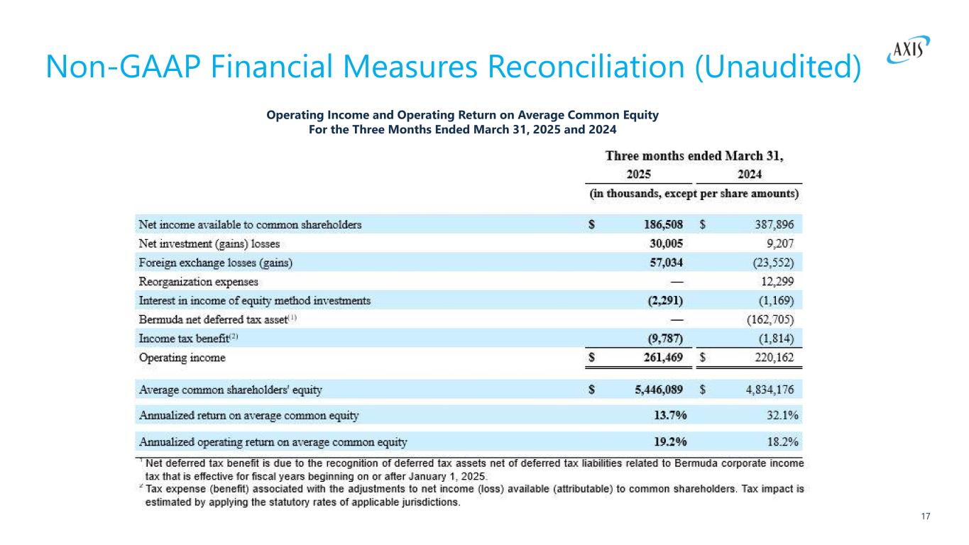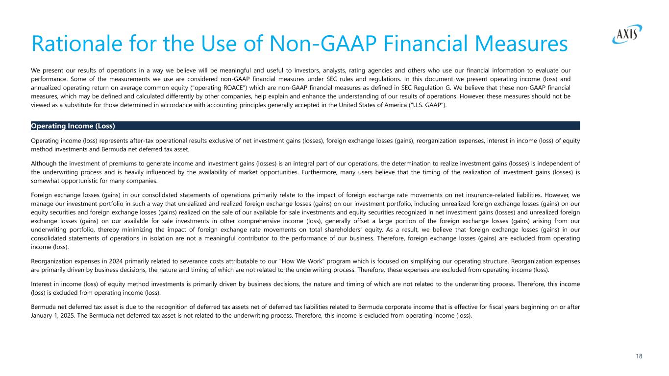 18 Rationale for the Use of Non-GAAP Financial Measures We present our results of operations in a way we believe will be meaningful and useful to investors, analysts, rating agencies and others who use our financial information to evaluate our  performance. Some of the measurements we use are considered non-GAAP financial measures under SEC rules and regulations. In this document we present operating income (loss) and  annualized operating return on average common equity ("operating ROACE") which are non-GAAP financial measures as defined in SEC Regulation G. We believe that these non-GAAP financial  measures, which may be defined and calculated differently by other companies, help explain and enhance the understanding of our results of operations. However, these measures should not be  viewed as a substitute for those determined in accordance with accounting principles generally accepted in the United States of America ("U.S. GAAP"). Operating Income (Loss) Operating income (loss) represents after-tax operational results exclusive of net investment gains (losses), foreign exchange losses (gains), reorganization expenses, interest in income (loss) of equity  method investments and Bermuda net deferred tax asset.  Although the investment of premiums to generate income and investment gains (losses) is an integral part of our operations, the determination to realize investment gains (losses) is independent of  the underwriting process and is heavily influenced by the availability of market opportunities. Furthermore, many users believe that the timing of the realization of investment gains (losses) is  somewhat opportunistic for many companies.  Foreign exchange losses (gains) in our consolidated statements of operations primarily relate to the impact of foreign exchange rate movements on net insurance-related liabilities. However, we  manage our investment portfolio in such a way that unrealized and realized foreign exchange losses (gains) on our investment portfolio, including unrealized foreign exchange losses (gains) on our  equity securities and foreign exchange losses (gains) realized on the sale of our available for sale investments and equity securities recognized in net investment gains (losses) and unrealized foreign  exchange losses (gains) on our available for sale investments in other comprehensive income (loss), generally offset a large portion of the foreign exchange losses (gains) arising from our  underwriting portfolio, thereby minimizing the impact of foreign exchange rate movements on total shareholders' equity. As a result, we believe that foreign exchange losses (gains) in our  consolidated statements of operations in isolation are not a meaningful contributor to the performance of our business. Therefore, foreign exchange losses (gains) are excluded from operating  income (loss). Reorganization expenses in 2024 primarily related to severance costs attributable to our "How We Work" program which is focused on simplifying our operating structure. Reorganization expenses  are primarily driven by business decisions, the nature and timing of which are not related to the underwriting process. Therefore, these expenses are excluded from operating income (loss).  Interest in income (loss) of equity method investments is primarily driven by business decisions, the nature and timing of which are not related to the underwriting process. Therefore, this income  (loss) is excluded from operating income (loss).  Bermuda net deferred tax asset is due to the recognition of deferred tax assets net of deferred tax liabilities related to Bermuda corporate income that is effective for fiscal years beginning on or after  January 1, 2025. The Bermuda net deferred tax asset is not related to the underwriting process. Therefore, this income is excluded from operating income (loss).