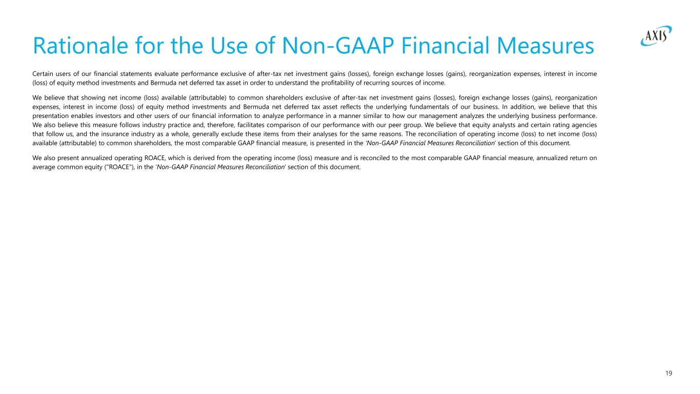 19 Rationale for the Use of Non-GAAP Financial Measures Certain users of our financial statements evaluate performance exclusive of after-tax net investment gains (losses), foreign exchange losses (gains), reorganization expenses, interest in income  (loss) of equity method investments and Bermuda net deferred tax asset in order to understand the profitability of recurring sources of income.  We believe that showing net income (loss) available (attributable) to common shareholders exclusive of after-tax net investment gains (losses), foreign exchange losses (gains), reorganization  expenses, interest in income (loss) of equity method investments and Bermuda net deferred tax asset reflects the underlying fundamentals of our business. In addition, we believe that this  presentation enables investors and other users of our financial information to analyze performance in a manner similar to how our management analyzes the underlying business performance.  We also believe this measure follows industry practice and, therefore, facilitates comparison of our performance with our peer group. We believe that equity analysts and certain rating agencies  that follow us, and the insurance industry as a whole, generally exclude these items from their analyses for the same reasons. The reconciliation of operating income (loss) to net income (loss)  available (attributable) to common shareholders, the most comparable GAAP financial measure, is presented in the 'Non-GAAP Financial Measures Reconciliation' section of this document.  We also present annualized operating ROACE, which is derived from the operating income (loss) measure and is reconciled to the most comparable GAAP financial measure, annualized return on  average common equity ("ROACE"), in the 'Non-GAAP Financial Measures Reconciliation' section of this document.