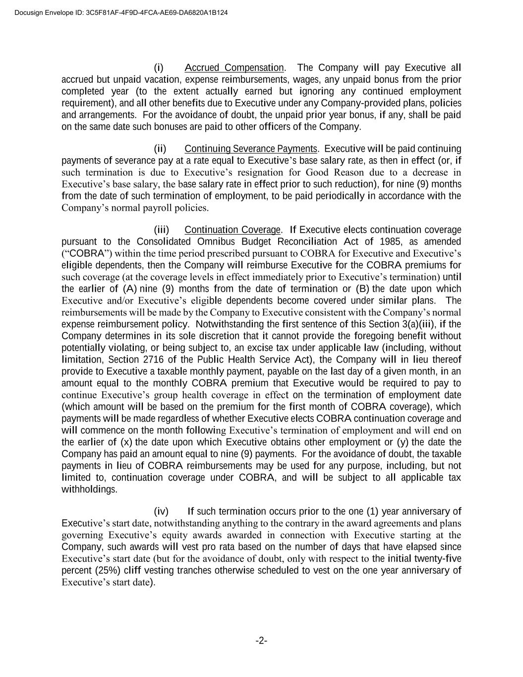 -2- (i) Accrued Compensation. The Company will pay Executive all accrued but unpaid vacation, expense reimbursements, wages, any unpaid bonus from the prior completed year (to the extent actually earned but ignoring any continued employment requirement), and all other benefits due to Executive under any Company-provided plans, policies and arrangements. For the avoidance of doubt, the unpaid prior year bonus, if any, shall be paid on the same date such bonuses are paid to other officers of the Company. (ii) Continuing Severance Payments. Executive will be paid continuing payments of severance pay at a rate equal to Executive’s base salary rate, as then in effect (or, if such termination is due to Executive’s resignation for Good Reason due to a decrease in Executive’s base salary, the base salary rate in effect prior to such reduction), for nine (9) months from the date of such termination of employment, to be paid periodically in accordance with the Company’s normal payroll policies. (iii) Continuation Coverage. If Executive elects continuation coverage pursuant to the Consolidated Omnibus Budget Reconciliation Act of 1985, as amended (“COBRA”) within the time period prescribed pursuant to COBRA for Executive and Executive’s eligible dependents, then the Company will reimburse Executive for the COBRA premiums for such coverage (at the coverage levels in effect immediately prior to Executive’s termination) until the earlier of (A) nine (9) months from the date of termination or (B) the date upon which Executive and/or Executive’s eligible dependents become covered under similar plans. The reimbursements will be made by the Company to Executive consistent with the Company’s normal expense reimbursement policy. Notwithstanding the first sentence of this Section 3(a)(iii), if the Company determines in its sole discretion that it cannot provide the foregoing benefit without potentially violating, or being subject to, an excise tax under applicable law (including, without limitation, Section 2716 of the Public Health Service Act), the Company will in lieu thereof provide to Executive a taxable monthly payment, payable on the last day of a given month, in an amount equal to the monthly COBRA premium that Executive would be required to pay to continue Executive’s group health coverage in effect on the termination of employment date (which amount will be based on the premium for the first month of COBRA coverage), which payments will be made regardless of whether Executive elects COBRA continuation coverage and will commence on the month following Executive’s termination of employment and will end on the earlier of (x) the date upon which Executive obtains other employment or (y) the date the Company has paid an amount equal to nine (9) payments. For the avoidance of doubt, the taxable payments in lieu of COBRA reimbursements may be used for any purpose, including, but not limited to, continuation coverage under COBRA, and will be subject to all applicable tax withholdings. (iv) If such termination occurs prior to the one (1) year anniversary of Executive’s start date, notwithstanding anything to the contrary in the award agreements and plans governing Executive’s equity awards awarded in connection with Executive starting at the Company, such awards will vest pro rata based on the number of days that have elapsed since Executive’s start date (but for the avoidance of doubt, only with respect to the initial twenty-five percent (25%) cliff vesting tranches otherwise scheduled to vest on the one year anniversary of Executive’s start date). Docusign Envelope ID: 3C5F81AF-4F9D-4FCA-AE69-DA6820A1B124