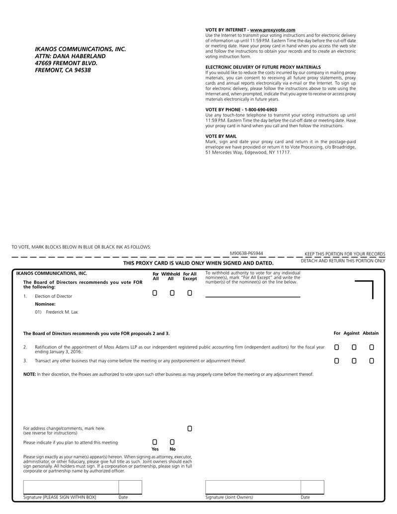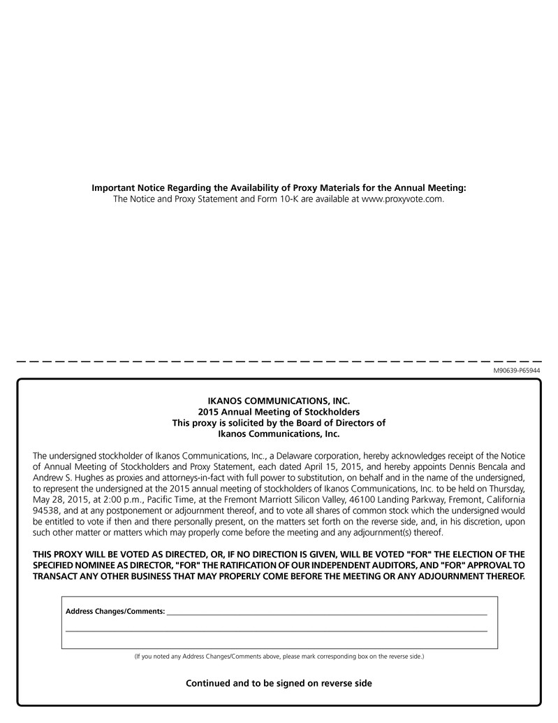 We cordially invite you to attend the 2015 Annual Meeting of Stockholders of Ikanos Communications, Inc. The meeting will be held on Thursday, May 28, 2015 at 2:00 p.m., Pacific Time, at the Fremont Marriott Silicon Valley, 46100 Landing Parkway, Fremont, CA 94538. At the meeting we will: