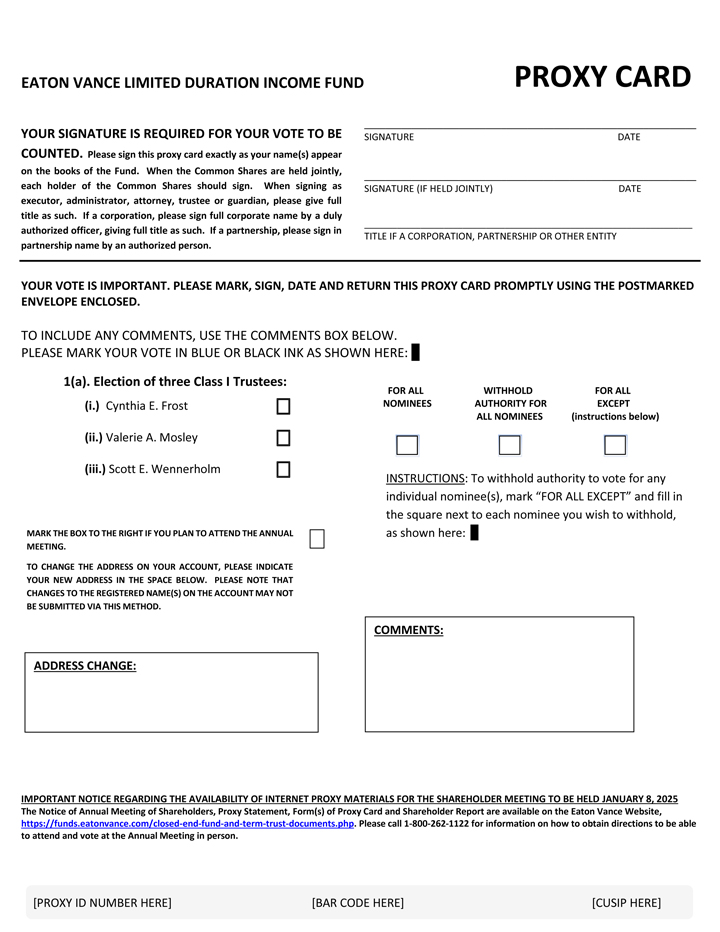 | a. | For Eaton Vance Limited Duration Income Fund, three Class I Trustees, Cynthia E. Frost, Valerie A. Mosley and Scott E. Wennerholm, to be elected by the holders of the Fund’s Common Shares and Auction Preferred Shares, voting together as a single class. |