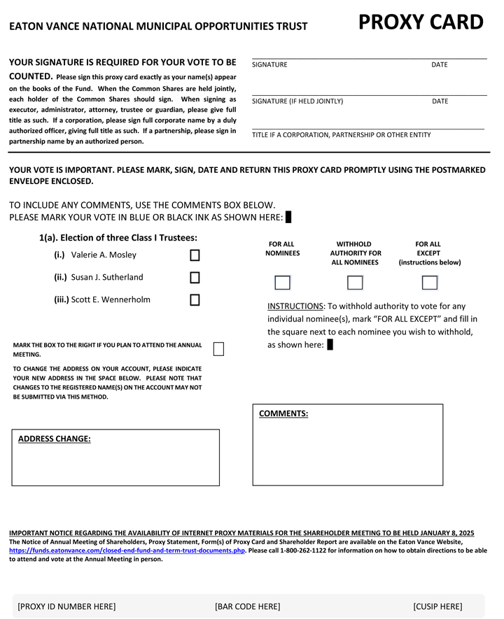 | b. | For Eaton Vance National Municipal Opportunities Trust, three Class I Trustees, Valerie A. Mosley, Susan J. Sutherland and Scott E. Wennerholm, to be elected by the shareholders of the Fund’s Common Shares. |