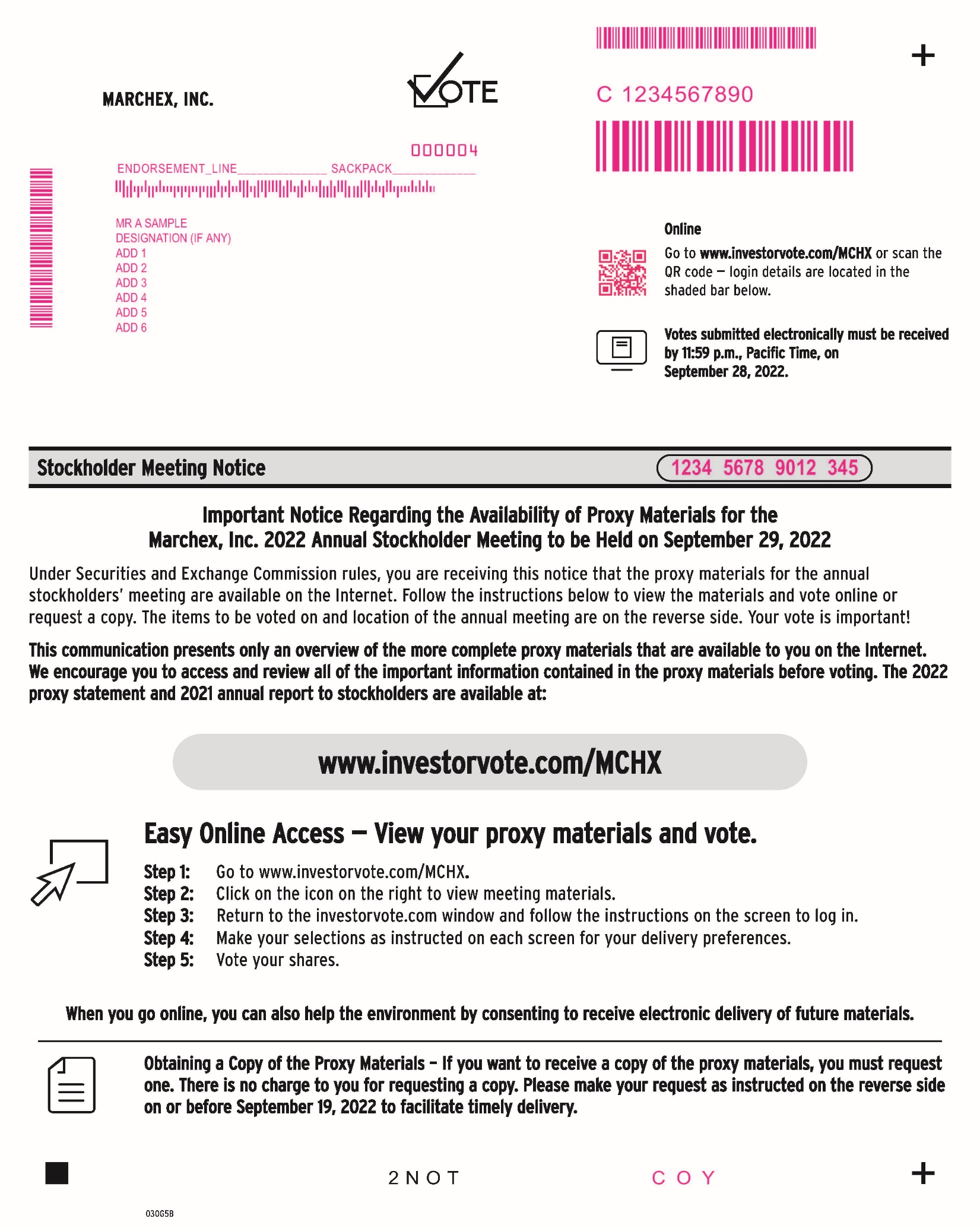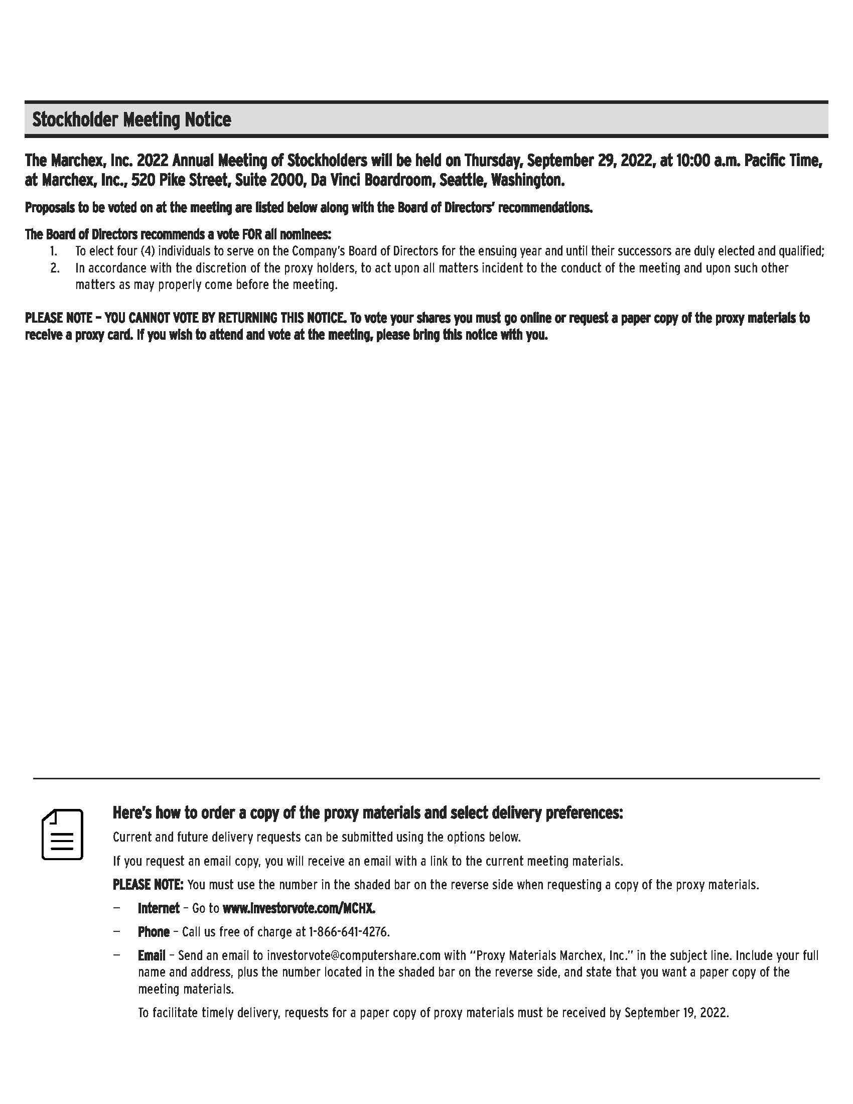 Stockholder Meeting Notice The Marchex, Inc. 2022 Annual Meeting of Stockholders will be held on Thursday, September 29, 2022, at 10:00 a.m. Pacific Time, at Marchex, Inc., 520 Pike Street, Suite 2000, Da Vinci Boardroom, Seattle, Washington. Proposals to be voted on at the meeting are listed below along with the Board of Directors’ recommendations. The Board of Directors recommends a vote FOR all nominees: 1. To elect four (4) individuals to serve on the Company’s Board of Directors for the ensuing year and until their successors are duly elected and qualified; 2. In accordance with the discretion of the proxy holders, to act upon all matters incident to the conduct of the meeting and upon such other matters as may properly come before the meeting. PLEASE NOTE – YOU CANNOT VOTE BY RETURNING THIS NOTICE. To vote your shares you must go online or request a paper copy of the proxy materials to receive a proxy card. If you wish to attend and vote at the meeting, please bring this notice with you. Here’s how to order a copy of the proxy materials and select delivery preferences: Current and future delivery requests can be submitted using the options below. If you request an email copy, you will receive an email with a link to the current meeting materials. PLEASE NOTE: You must use the number in the shaded bar on the reverse side when requesting a copy of the proxy materials. — Internet – Go to www.investorvote.com