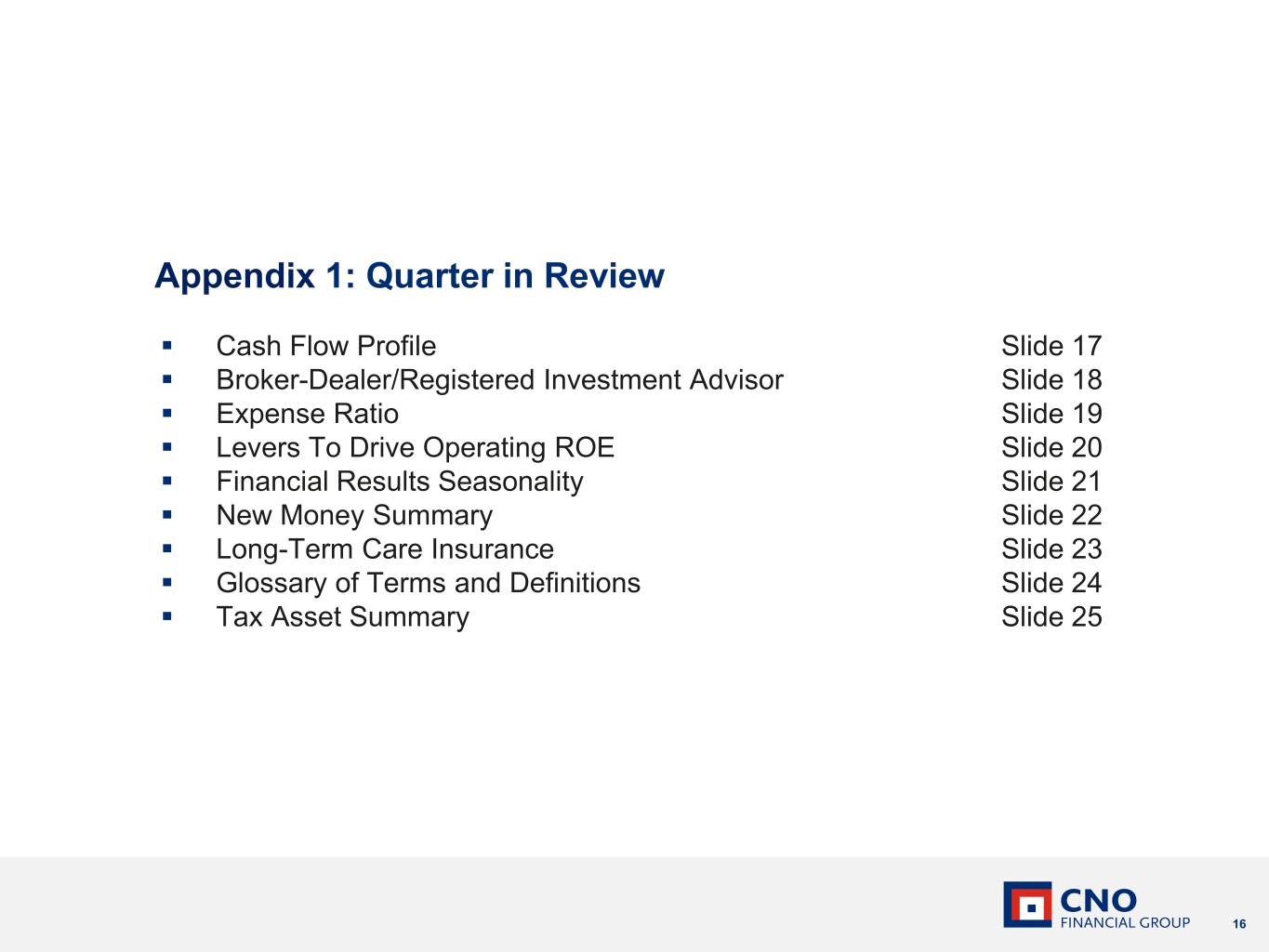 16 ▪ Cash Flow Profile Slide 17 ▪ Broker-Dealer/Registered Investment Advisor Slide 18 ▪ Expense Ratio Slide 19 ▪ Levers To Drive Operating ROE Slide 20 ▪ Financial Results Seasonality Slide 21 ▪ New Money Summary Slide 22 ▪ Long-Term Care Insurance Slide 23 ▪ Glossary of Terms and Definitions Slide 24 ▪ Tax Asset Summary Slide 25 Appendix 1: Quarter in Review