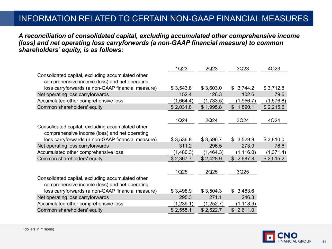 41 A reconciliation of consolidated capital, excluding accumulated other comprehensive income (loss) and net operating loss carryforwards (a non-GAAP financial measure) to common shareholders’ equity, is as follows: (dollars in millions) 1Q23 2Q23 3Q23 4Q23 Consolidated capital, excluding accumulated other comprehensive income (loss) and net operating loss carryforwards (a non-GAAP financial measure) 3,543.8$ 3,603.0$ 3,744.2$ 3,712.8$ Net operating loss carryforwards 152.4 126.3 102.6 79.6 Accumulated other comprehensive loss (1,664.4) (1,733.5) (1,956.7) (1,576.8) Common shareholders' equity 2,031.8$ 1,995.8$ 1,890.1$ 2,215.6$ 1Q24 2Q24 3Q24 4Q24 Consolidated capital, excluding accumulated other comprehensive income (loss) and net operating loss carryforwards (a non-GAAP financial measure) 3,536.8$ 3,596.7$ 3,529.9$ 3,810.0$ Net operating loss carryforwards 311.2 296.5 273.9 76.6 Accumulated other comprehensive loss (1,480.3) (1,464.3) (1,116.0) (1,371.4) Common shareholders' equity 2,367.7$ 2,428.9$ 2,687.8$ 2,515.2$ 1Q25 2Q25 3Q25 Consolidated capital, excluding accumulated other comprehensive income (loss) and net operating loss carryforwards (a non-GAAP financial measure) 3,498.9$ 3,504.3$ 3,483.6$ Net operating loss carryforwards 295.3 271.1 246.3 Accumulated other comprehensive loss (1,239.1) (1,252.7) (1,118.9) Common shareholders' equity 2,555.1$ 2,522.7$ 2,611.0$ INFORMATION RELATED TO CERTAIN NON-GAAP FINANCIAL MEASURES
