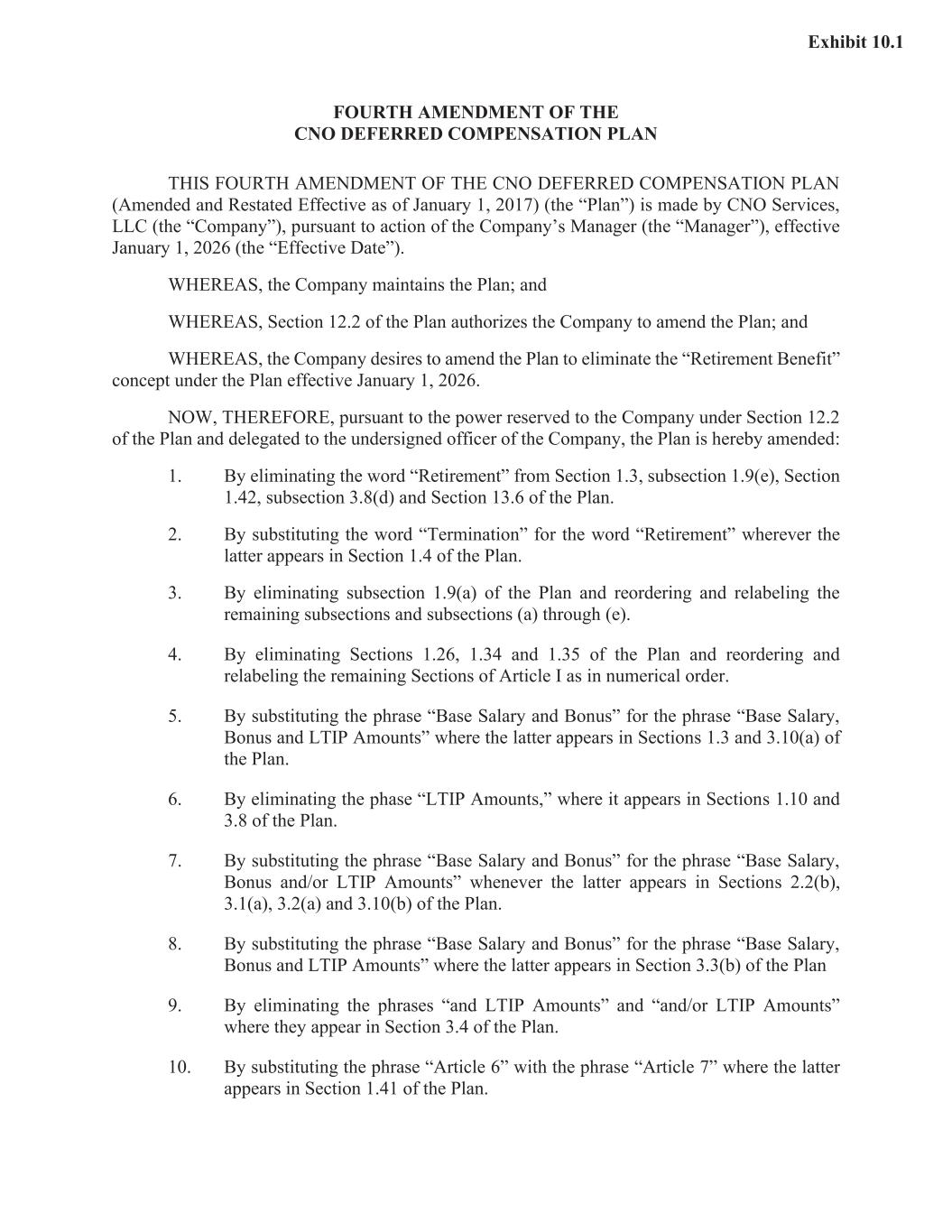 FOURTH AMENDMENT OF THE CNO DEFERRED COMPENSATION PLAN THIS FOURTH AMENDMENT OF THE CNO DEFERRED COMPENSATION PLAN (Amended and Restated Effective as of January 1, 2017) (the “Plan”) is made by CNO Services, LLC (the “Company”), pursuant to action of the Company’s Manager (the “Manager”), effective January 1, 2026 (the “Effective Date”). WHEREAS, the Company maintains the Plan; and WHEREAS, Section 12.2 of the Plan authorizes the Company to amend the Plan; and WHEREAS, the Company desires to amend the Plan to eliminate the “Retirement Benefit” concept under the Plan effective January 1, 2026. NOW, THEREFORE, pursuant to the power reserved to the Company under Section 12.2 of the Plan and delegated to the undersigned officer of the Company, the Plan is hereby amended: 1. By eliminating the word “Retirement” from Section 1.3, subsection 1.9(e), Section 1.42, subsection 3.8(d) and Section 13.6 of the Plan. 2. By substituting the word “Termination” for the word “Retirement” wherever the latter appears in Section 1.4 of the Plan. 3. By eliminating subsection 1.9(a) of the Plan and reordering and relabeling the remaining subsections and subsections (a) through (e). 4. By eliminating Sections 1.26, 1.34 and 1.35 of the Plan and reordering and relabeling the remaining Sections of Article I as in numerical order. 5. By substituting the phrase “Base Salary and Bonus” for the phrase “Base Salary, Bonus and LTIP Amounts” where the latter appears in Sections 1.3 and 3.10(a) of the Plan. 6. By eliminating the phase “LTIP Amounts,” where it appears in Sections 1.10 and 3.8 of the Plan. 7. By substituting the phrase “Base Salary and Bonus” for the phrase “Base Salary, Bonus and/or LTIP Amounts” whenever the latter appears in Sections 2.2(b), 3.1(a), 3.2(a) and 3.10(b) of the Plan. 8. By substituting the phrase “Base Salary and Bonus” for the phrase “Base Salary, Bonus and LTIP Amounts” where the latter appears in Section 3.3(b) of the Plan 9. By eliminating the phrases “and LTIP Amounts” and “and/or LTIP Amounts” where they appear in Section 3.4 of the Plan. 10. By substituting the phrase “Article 6” with the phrase “Article 7” where the latter appears in Section 1.41 of the Plan. Exhibit 10.1