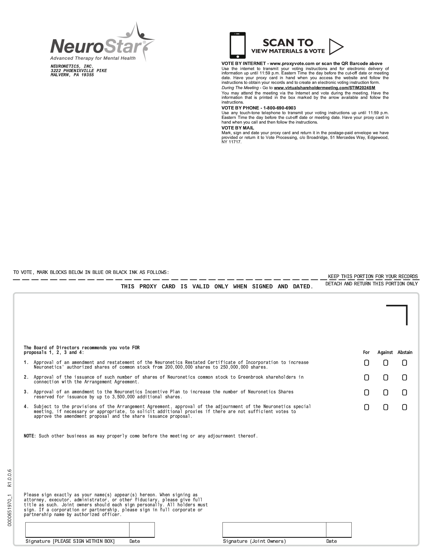YOUR VOTE IS IMPORTANT. Whether or not you expect to attend the Greenbrook Meeting or the Neuronetics Meeting virtually, please submit your vote as soon as possible. We urge you to read the enclosed materials carefully and to promptly vote by following the instructions in the enclosed materials.