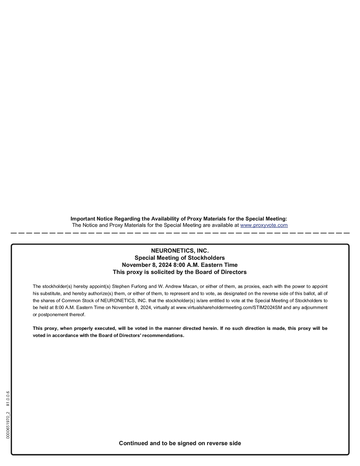 Neuronetics Stockholders who are planning to provide voting instructions in accordance with the enclosed form of proxy or voting instruction form are encouraged to review the Joint Proxy Statement/Circular carefully before submitting such form.