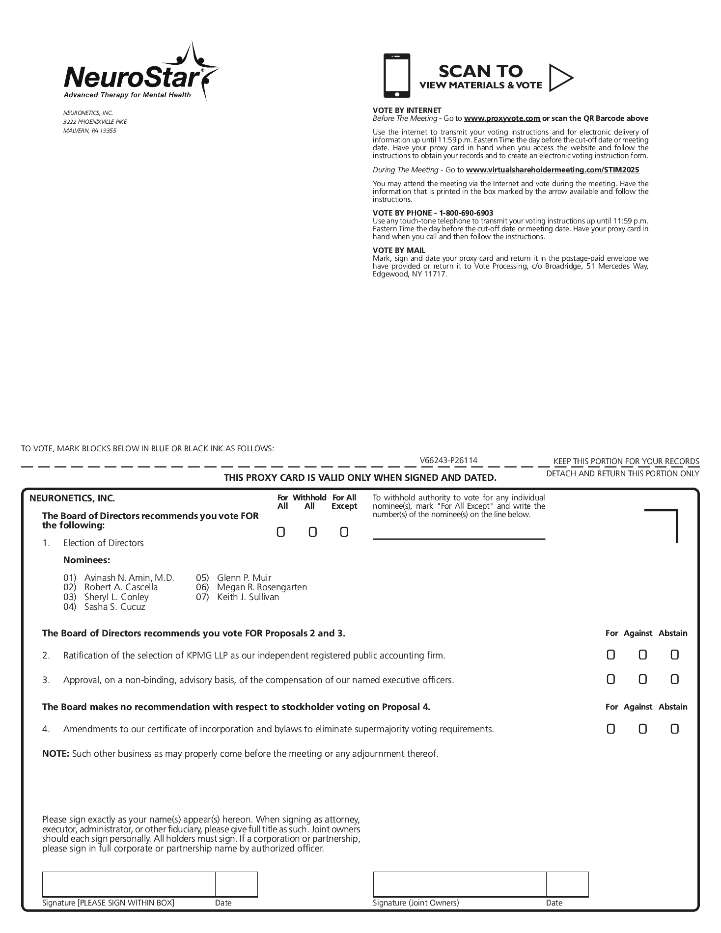 These items of business are more fully described in the proxy statement accompanying this notice. Only stockholders of record and beneficial owners of our common stock at 5:00 p.m. Eastern Time on March 24, 2025 are eligible to attend and vote at the Annual Meeting or any adjournment thereof. If you are a stockholder of record, you will need to visit virtualshareholdermeeting.com/STIM2025 and use the 16-digit control number received in your notice to log in to this website. Beneficial owners of shares held in street name will need to follow the instructions provided by the broker, bank, or other nominee that holds their shares. We encourage stockholders to log in to this website and access the webcast before the start time of the Annual Meeting.