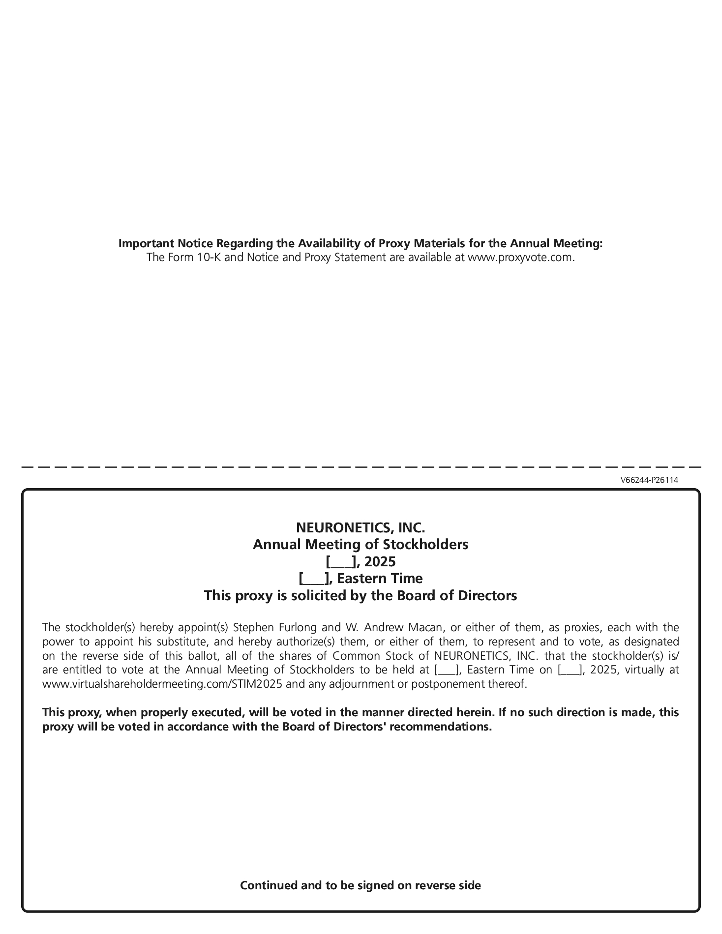 You are cordially invited to attend the virtual annual meeting of stockholders (the “Annual Meeting”) of Neuronetics, Inc., a Delaware corporation (the “Company”). The Annual Meeting will be held solely via live webcast on [  ], 2025 at [  ] Eastern Time to conduct the following business: