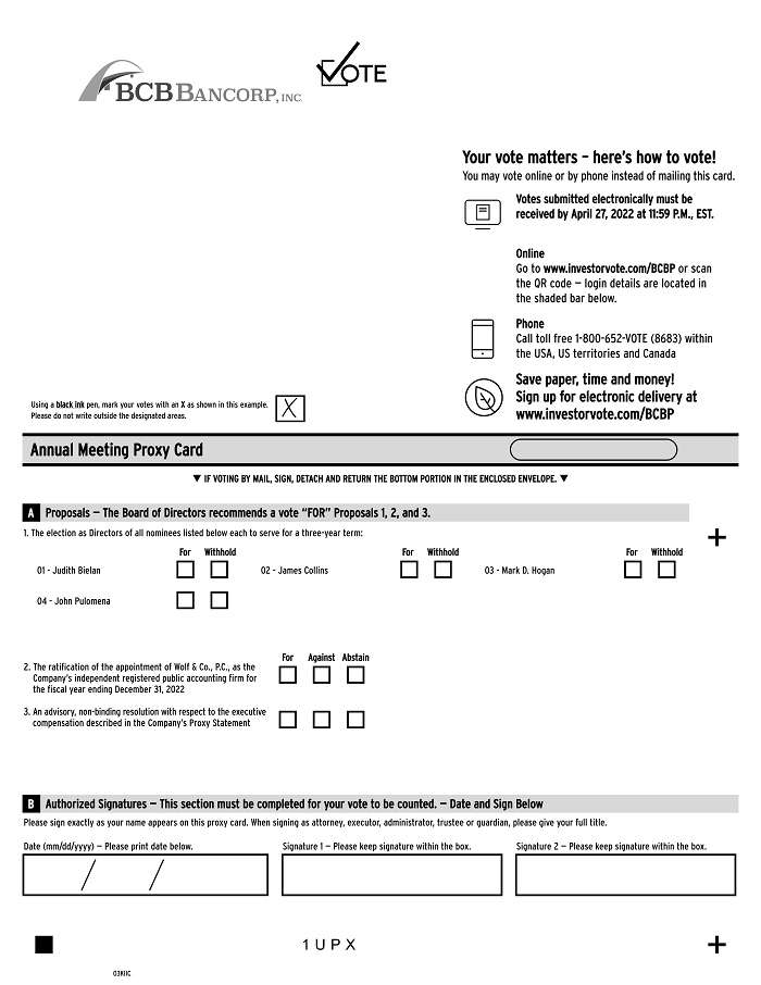 03KIIC 1 U P X + IMPORTANT ANNUAL MEETING INFORMATION IMPORTANT NOTICE REGARDING THE AVAILABILITY OF PROXY MATERIALS FOR THE SHAREHOLDER MEETING TO BE HELD ON APRIL 28, 2022. THE PROXY STATEMENT AND THE ANNUAL REPORT ARE AVAILABLE AT: http://www.edocumentview.com/BCBP q IF VOTING BY MAIL, SIGN, DETACH AND RETURN THE BOTTOM PORTION IN THE ENCLOSED ENVELOPE. q REVOCABLE PROXY — BCB BANCORP, INC. ANNUAL MEETING OF SHAREHOLDERS APRIL 28, 2022 THIS PROXY IS SOLICITED BY THE BOARD OF DIRECTORS. The undersigned hereby appoints Ryan Blake, Chief Operating Officer and Corporate Secretary, with full powers of substitution to act as attorneys and proxies for the undersigned to vote all shares of common stock of BCB Bancorp, Inc. (the “Company”) which the undersigned is entitled to vote at the Annual Meeting of Shareholders to be held at The Chandelier Restaurant, 1081 Broadway, Bayonne, New Jersey 07002 on April 28, 2022, at 10:00 a.m. eastern time. Ryan Blake, Chief Operating Officer and Corporate Secretary, is authorized to cast all votes to which the undersigned is entitled as follows: THIS PROXY WILL BE VOTED AS DIRECTED, BUT IF NO INSTRUCTIONS ARE SPECIFIED, THIS PROXY WILL BE VOTED FOR EACH OF THE PROPOSITIONS STATED ABOVE. IF ANY OTHER BUSINESS IS PRESENTED AT SUCH MEETING, THIS PROXY WILL BE VOTED BY THE ABOVE-NAMED PROXY AT THE DIRECTION OF A MAJORITY OF THE BOARD OF DIRECTORS. AT THE PRESENT TIME, THE BOARD OF DIRECTORS KNOWS OF NO OTHER BUSINESS TO BE PRESENTED AT THE MEETING. The annual meeting may be postponed or adjourned for the purpose of soliciting additional proxies. Should the undersigned be present and elect to vote at the annual meeting or at any adjournment thereof and after notification to our Corporate Secretary at the annual meeting of the shareholder’s decision to terminate this proxy, then the power of said attorneys and proxies shall be deemed terminated and of no further force and effect. This proxy may also be revoked by sending written notice to our Corporate Secretary at the address set forth on the Notice of Annual Meeting of Shareholders, or by the filing of a later proxy prior to a vote being taken on a particular proposal at the annual meeting. The undersigned acknowledges receipt from the Company prior to the execution of this proxy of a notice of the annual meeting and a Proxy Statement dated March 18, 2022 and the Annual Report on Form 10-K with audited financial statements. PLEASE COMPLETE, DATE, SIGN, AND MAIL THIS PROXY CARD IN THE ENCLOSED POSTAGE-PAID ENVELOPE C Non-Voting Items Change of Address — Please print new address below. Comments — Please print your comments below. Meeting Attendance Mark box to the right if you plan to attend the Annual Meeting. +