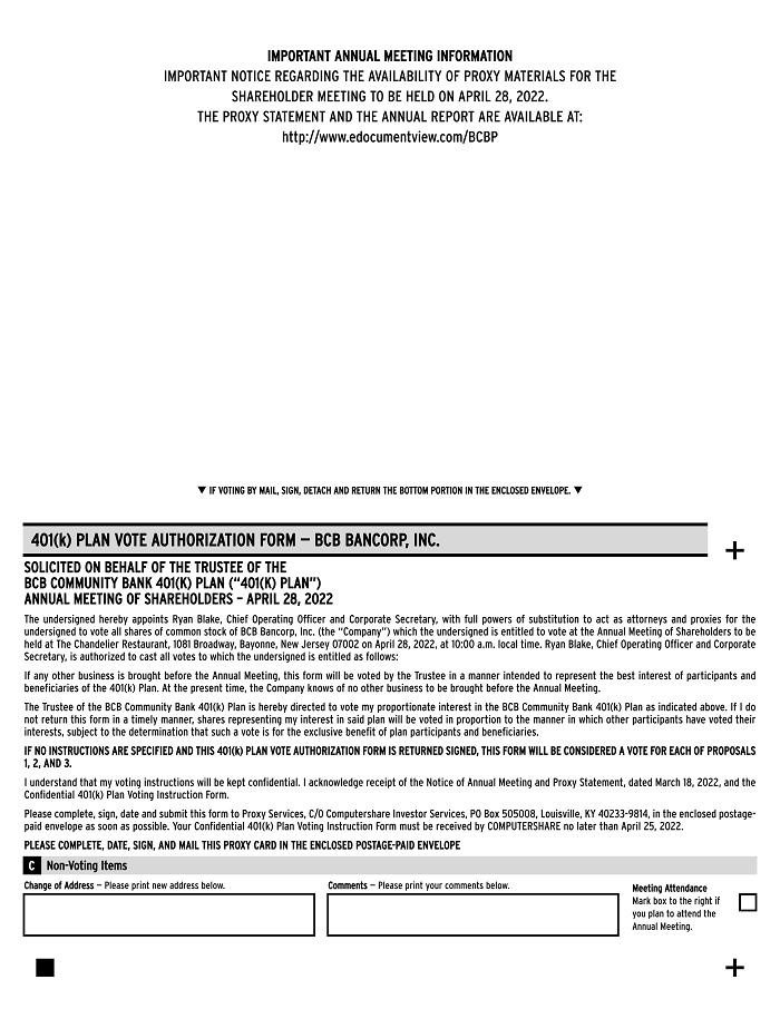 03KNOC 1 U P X + IMPORTANT ANNUAL MEETING INFORMATION IMPORTANT NOTICE REGARDING THE AVAILABILITY OF PROXY MATERIALS FOR THE SHAREHOLDER MEETING TO BE HELD ON APRIL 28, 2022. THE PROXY STATEMENT AND THE ANNUAL REPORT ARE AVAILABLE AT: http://www.edocumentview.com/BCBP q IF VOTING BY MAIL, SIGN, DETACH AND RETURN THE BOTTOM PORTION IN THE ENCLOSED ENVELOPE. q 401(k) PLAN VOTE AUTHORIZATION FORM — BCB BANCORP, INC. SOLICITED ON BEHALF OF THE TRUSTEE OF THE BCB COMMUNITY BANK 401(K) PLAN (“401(K) PLAN”) ANNUAL MEETING OF SHAREHOLDERS – APRIL 28, 2022 The undersigned hereby appoints Ryan Blake, Chief Operating Officer and Corporate Secretary, with full powers of substitution to act as attorneys and proxies for the undersigned to vote all shares of common stock of BCB Bancorp, Inc. (the “Company”) which the undersigned is entitled to vote at the Annual Meeting of Shareholders to be held at The Chandelier Restaurant, 1081 Broadway, Bayonne, New Jersey 07002 on April 28, 2022, at 10:00 a.m. local time. Ryan Blake, Chief Operating Officer and Corporate Secretary, is authorized to cast all votes to which the undersigned is entitled as follows: If any other business is brought before the Annual Meeting, this form will be voted by the Trustee in a manner intended to represent the best interest of participants and beneficiaries of the 401(k) Plan. At the present time, the Company knows of no other business to be brought before the Annual Meeting. The Trustee of the BCB Community Bank 401(k) Plan is hereby directed to vote my proportionate interest in the BCB Community Bank 401(k) Plan as indicated above. If I do not return this form in a timely manner, shares representing my interest in said plan will be voted in proportion to the manner in which other participants have voted their interests, subject to the determination that such a vote is for the exclusive benefit of plan participants and beneficiaries. IF NO INSTRUCTIONS ARE SPECIFIED AND THIS 401(k) PLAN VOTE AUTHORIZATION FORM IS RETURNED SIGNED, THIS FORM WILL BE CONSIDERED A VOTE FOR EACH OF PROPOSALS 1, 2, AND 3. I understand that my voting instructions will be kept confidential. I acknowledge receipt of the Notice of Annual Meeting and Proxy Statement, dated March 18, 2022, and the Confidential 401(k) Plan Voting Instruction Form. Please complete, sign, date and submit this form to Proxy Services, C/O Computershare Investor Services, PO Box 505008, Louisville, KY 40233-9814, in the enclosed postage- paid envelope as soon as possible. Your Confidential 401(k) Plan Voting Instruction Form must be received by COMPUTERSHARE no later than April 25, 2022. PLEASE COMPLETE, DATE, SIGN, AND MAIL THIS PROXY CARD IN THE ENCLOSED POSTAGE-PAID ENVELOPE C Non-Voting Items Change of Address — Please print new address below. Comments — Please print your comments below. Meeting Attendance Mark box to the right if you plan to attend the Annual Meeting. +