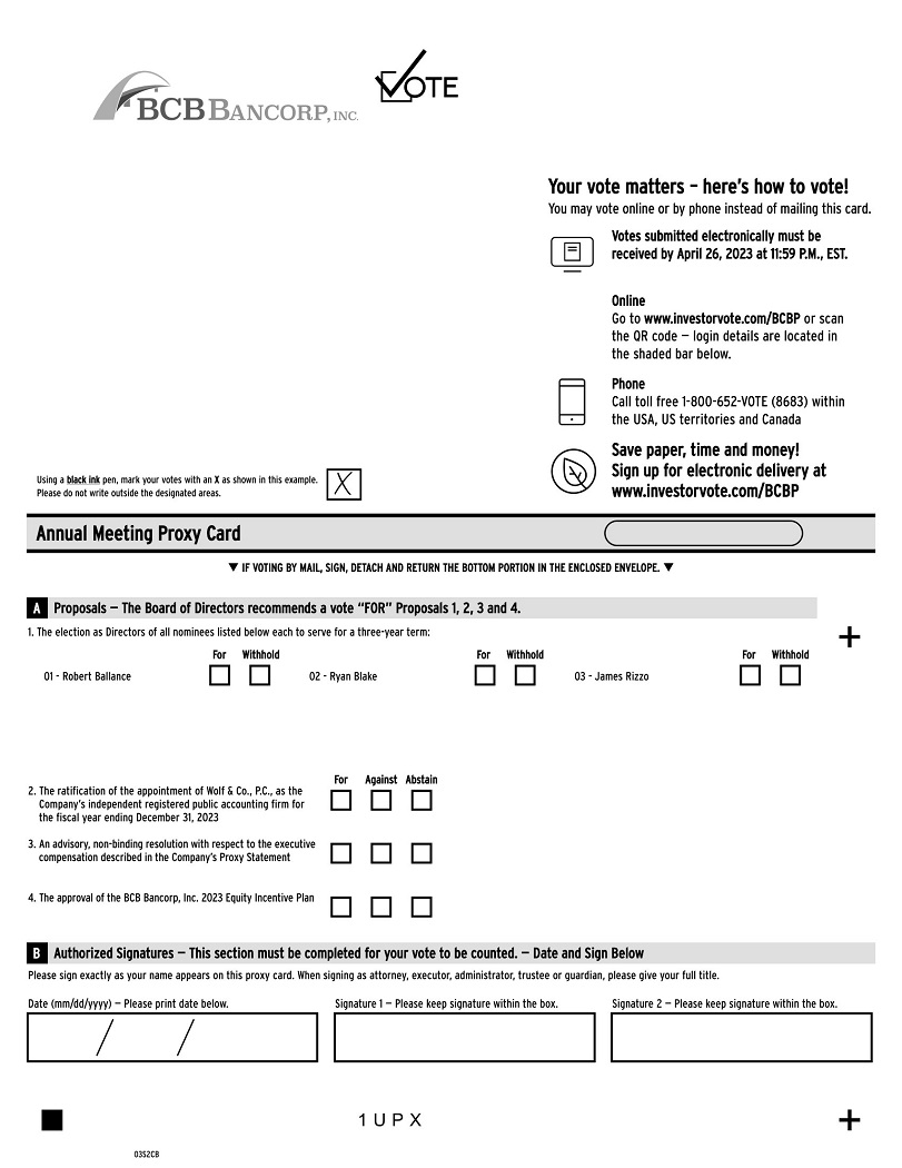 At the annual meeting, shareholders will vote on the election of three directors, the ratification of the appointment of the Company’s independent registered public accounting firm for the fiscal year ending December 31, 2023, an advisory, non-binding resolution with respect to the Company’s executive compensation described in this Proxy Statement, the approval of the BCB Bancorp, Inc. 2023 Equity Incentive Plan (the “2023 Equity Incentive Plan”) and such other matters as may properly come before the annual meeting or any adjournments thereof.