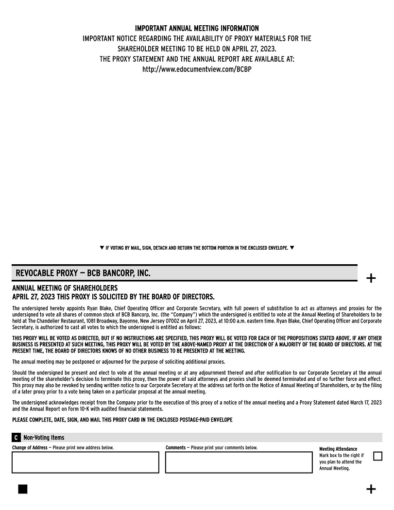 We cordially invite you to attend the Annual Meeting of Shareholders of BCB Bancorp, Inc. The annual meeting will be held at The Chandelier Restaurant, 1081 Broadway, Bayonne, New Jersey 07002, at 10:00 a.m., Eastern Time, on April 27, 2023.