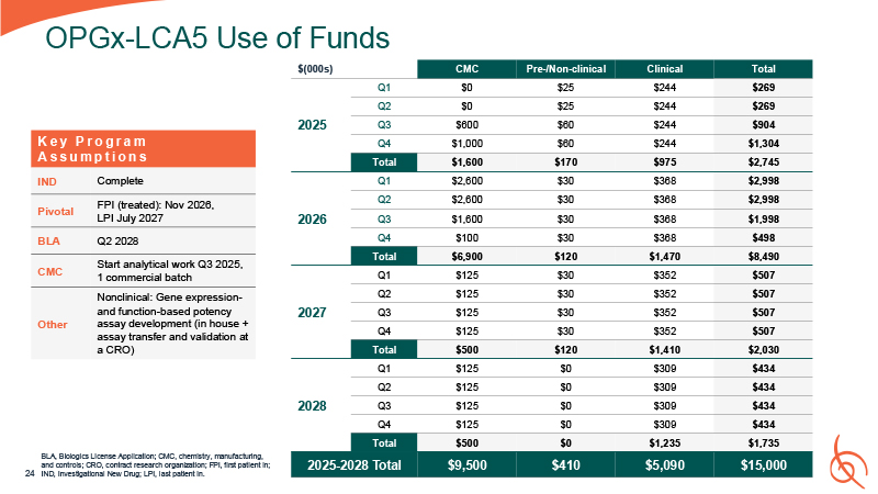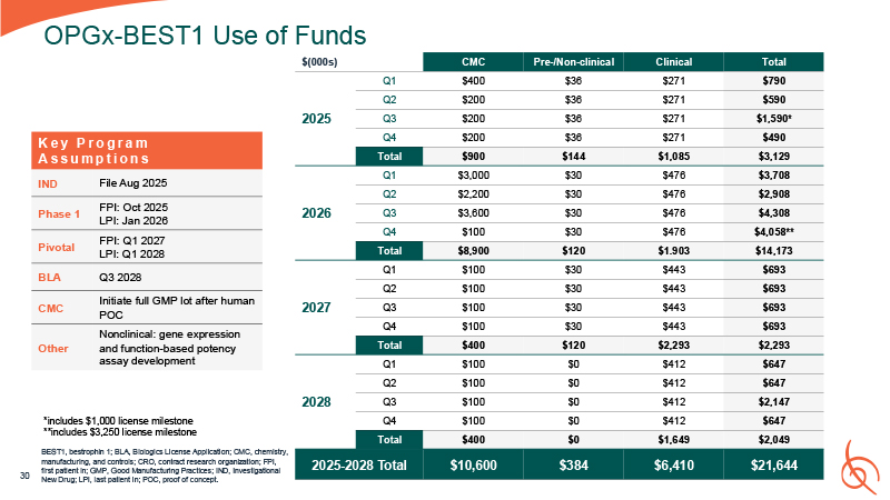 Funds  30  $(000s)  CMC  Pre-/Non-clinical  Clinical  Total  2025  Q1  $400  $36  $271  $790  Q2  $200  $36  $271  $590  Q3  $200  $36  $271  $1,590*  Q4  $200  $36  $271  $490  Total  $900  $144  $1,085  $3,129  2026  Q1  $3,000  $30  $476  $3,708  Q2  $2,200  $30  $476  $2,908  Q3  $3,600  $30  $476  $4,308  Q4  $100  $30  $476  $4,058**  Total  $8,900  $120  $1.903  $14,173  2027  Q1  $100  $30  $443  $693  Q2  $100  $30  $443  $693  Q3  $100  $30  $443  $693  Q4  $100  $30  $443  $693  Total  $400  $120  $2,293  $2,293  2028  Q1  $100  $0  $412  $647  Q2  $100  $0  $412  $647  Q3  $100  $0  $412  $2,147  Q4  $100  $0  $412  $647  Total  $400  $0  $1,649  $2,049  2025-2028