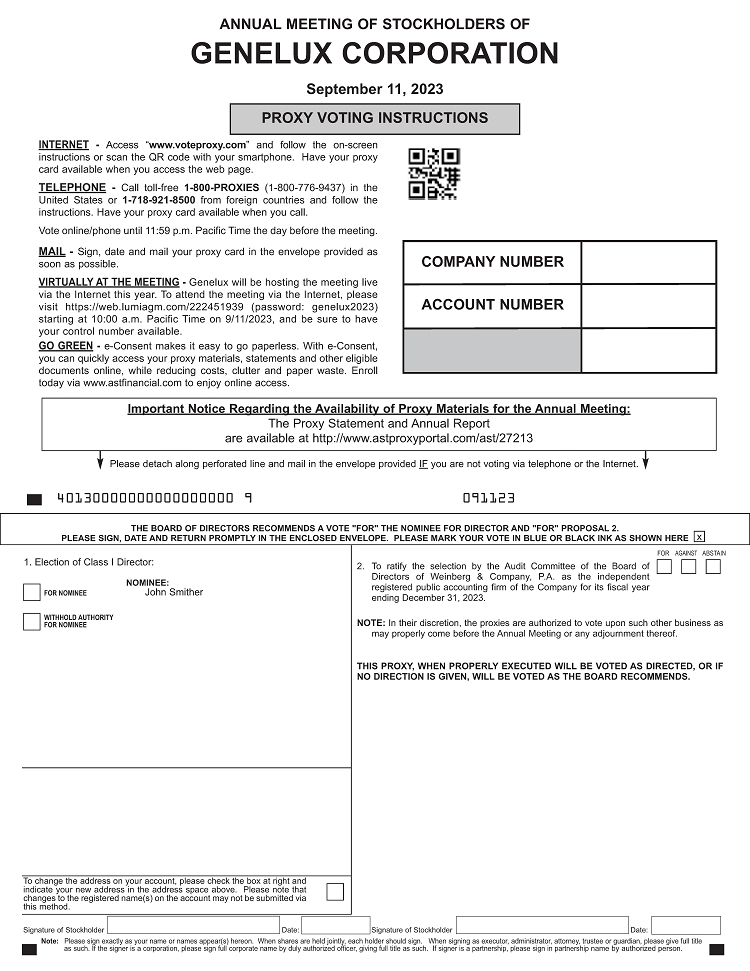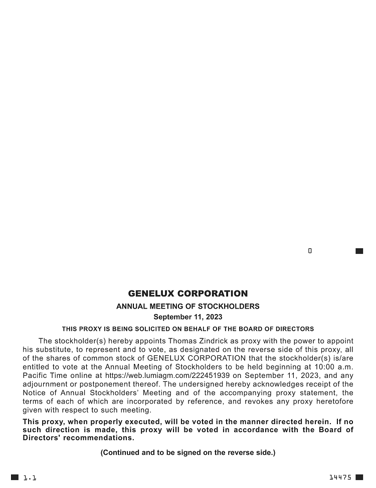 You are cordially invited to attend the 2023 Annual Meeting of Stockholders (including any adjournments, continuations or postponements thereof, the “Annual Meeting”) of Genelux Corporation, a Delaware corporation (the “Company”). The Annual Meeting will be held on Monday, September 11, 2023 at 10:00 a.m. Pacific Time at the Zapara School of Business at La Sierra University, located at 4500 Riverwalk Pkwy, Riverside, CA 92505, and via live webcast at https://web.lumiagm.com/222451939. For additional instructions on how to attend the Annual Meeting, please review the accompanying Proxy Statement for the Annual Meeting (the “Proxy Statement”). The Annual Meeting will be held for the following purposes: