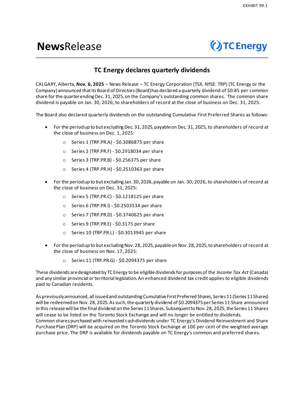 NewsRelease TC Energy declares quarterly dividends CALGARY, Alberta, Nov. 6, 2025 – News Release – TC Energy Corporation (TSX, NYSE: TRP) (TC Energy or the Company) announced that its Board of Directors (Board) has declared a quarterly dividend of $0.85 per common share for the quarter ending Dec. 31, 2025, on the Company’s outstanding common shares. The common share dividend is payable on Jan. 30, 2026, to shareholders of record at the close of business on Dec. 31, 2025. The Board also declared quarterly dividends on the outstanding Cumulative First Preferred Shares as follows: • For the period up to but excluding Dec. 31, 2025, payable on Dec. 31, 2025, to shareholders of record at the close of business on Dec. 1, 2025: o Series 1 (TRP.PR.A) - $0.3086875 per share o Series 2 (TRP.PR.F) - $0.2918034 per share o Series 3 (TRP.PR.B) - $0.256375 per share o Series 4 (TRP.PR.H) - $0.2510363 per share • For the period up to but excluding Jan. 30, 2026, payable on Jan. 30, 2026, to shareholders of record at the close of business on Dec. 31, 2025: o Series 5 (TRP.PR.C) - $0.1218125 per share o Series 6 (TRP.PR.I) - $0.2503534 per share o Series 7 (TRP.PR.D) - $0.3740625 per share o Series 9 (TRP.PR.E) - $0.3175 per share o Series 10 (TRP.PR.L) - $0.3013945 per share • For the period up to but excluding Nov. 28, 2025, payable on Nov. 28, 2025, to shareholders of record at the close of business on Nov. 17, 2025: o Series 11 (TRP.PR.G) - $0.2094375 per share These dividends are designated by TC Energy to be eligible dividends for purposes of the Income Tax Act (Canada) and any similar provincial or territorial legislation. An enhanced dividend tax credit applies to eligible dividends paid to Canadian residents. As previously announced, all issued and outstanding Cumulative First Preferred Shares, Series 11 (Series 11 Shares) will be redeemed on Nov. 28, 2025. As such, the quarterly dividend of $0.2094375 per Series 11 Share announced in this release will be the final dividend on the Series 11 Shares. Subsequent to Nov. 28, 2025, the Series 11 Shares will cease to be listed on the Toronto Stock Exchange and will no longer be entitled to dividends. Common shares purchased with reinvested cash dividends under TC Energy’s Dividend Reinvestment and Share Purchase Plan (DRP) will be acquired on the Toronto Stock Exchange at 100 per cent of the weighted average purchase price. The DRP is available for dividends payable on TC Energy’s common and preferred shares.