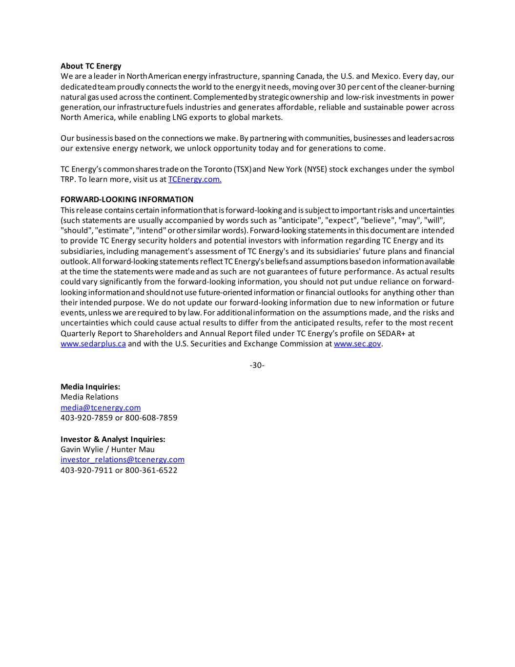 About TC Energy We are a leader in North American energy infrastructure, spanning Canada, the U.S. and Mexico. Every day, our dedicated team proudly connects the world to the energy it needs, moving over 30 per cent of the cleaner-burning natural gas used across the continent. Complemented by strategic ownership and low-risk investments in power generation, our infrastructure fuels industries and generates affordable, reliable and sustainable power across North America, while enabling LNG exports to global markets. Our business is based on the connections we make. By partnering with communities, businesses and leaders across our extensive energy network, we unlock opportunity today and for generations to come. TC Energy’s common shares trade on the Toronto (TSX) and New York (NYSE) stock exchanges under the symbol TRP. To learn more, visit us at TCEnergy.com. FORWARD-LOOKING INFORMATION This release contains certain information that is forward-looking and is subject to important risks and uncertainties (such statements are usually accompanied by words such as "anticipate", "expect", "believe", "may", "will", "should", "estimate", "intend" or other similar words). Forward-looking statements in this document are intended to provide TC Energy security holders and potential investors with information regarding TC Energy and its subsidiaries, including management's assessment of TC Energy's and its subsidiaries' future plans and financial outlook. All forward-looking statements reflect TC Energy's beliefs and assumptions based on information available at the time the statements were made and as such are not guarantees of future performance. As actual results could vary significantly from the forward-looking information, you should not put undue reliance on forward- looking information and should not use future-oriented information or financial outlooks for anything other than their intended purpose. We do not update our forward-looking information due to new information or future events, unless we are required to by law. For additional information on the assumptions made, and the risks and uncertainties which could cause actual results to differ from the anticipated results, refer to the most recent Quarterly Report to Shareholders and Annual Report filed under TC Energy’s profile on SEDAR+ at www.sedarplus.ca and with the U.S. Securities and Exchange Commission at www.sec.gov. -30- Media Inquiries: Media Relations media@tcenergy.com 403-920-7859 or 800-608-7859 Investor & Analyst Inquiries: Gavin Wylie / Hunter Mau investor_relations@tcenergy.com 403-920-7911 or 800-361-6522