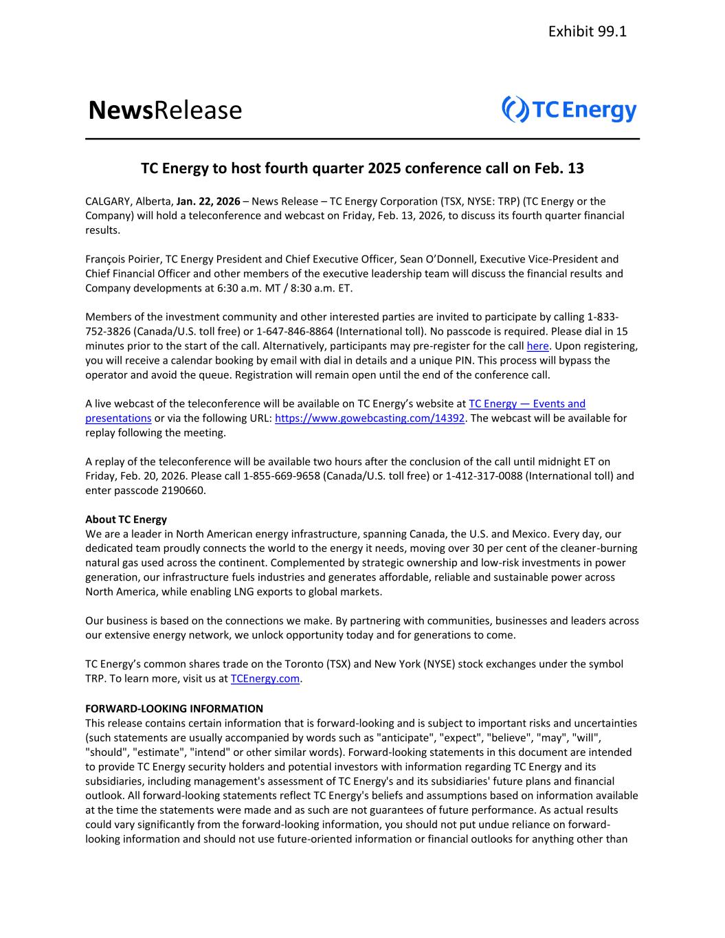 NewsRelease TC Energy to host fourth quarter 2025 conference call on Feb. 13 CALGARY, Alberta, Jan. 22, 2026 – News Release – TC Energy Corporation (TSX, NYSE: TRP) (TC Energy or the Company) will hold a teleconference and webcast on Friday, Feb. 13, 2026, to discuss its fourth quarter financial results. François Poirier, TC Energy President and Chief Executive Officer, Sean O’Donnell, Executive Vice-President and Chief Financial Officer and other members of the executive leadership team will discuss the financial results and Company developments at 6:30 a.m. MT / 8:30 a.m. ET. Members of the investment community and other interested parties are invited to participate by calling 1-833- 752-3826 (Canada/U.S. toll free) or 1-647-846-8864 (International toll). No passcode is required. Please dial in 15 minutes prior to the start of the call. Alternatively, participants may pre-register for the call here. Upon registering, you will receive a calendar booking by email with dial in details and a unique PIN. This process will bypass the operator and avoid the queue. Registration will remain open until the end of the conference call. A live webcast of the teleconference will be available on TC Energy’s website at TC Energy — Events and presentations or via the following URL: https://www.gowebcasting.com/14392. The webcast will be available for replay following the meeting. A replay of the teleconference will be available two hours after the conclusion of the call until midnight ET on Friday, Feb. 20, 2026. Please call 1-855-669-9658 (Canada/U.S. toll free) or 1-412-317-0088 (International toll) and enter passcode 2190660. About TC Energy We are a leader in North American energy infrastructure, spanning Canada, the U.S. and Mexico. Every day, our dedicated team proudly connects the world to the energy it needs, moving over 30 per cent of the cleaner-burning natural gas used across the continent. Complemented by strategic ownership and low-risk investments in power generation, our infrastructure fuels industries and generates affordable, reliable and sustainable power across North America, while enabling LNG exports to global markets. Our business is based on the connections we make. By partnering with communities, businesses and leaders across our extensive energy network, we unlock opportunity today and for generations to come. TC Energy’s common shares trade on the Toronto (TSX) and New York (NYSE) stock exchanges under the symbol TRP. To learn more, visit us at TCEnergy.com. FORWARD-LOOKING INFORMATION This release contains certain information that is forward-looking and is subject to important risks and uncertainties (such statements are usually accompanied by words such as "anticipate", "expect", "believe", "may", "will", "should", "estimate", "intend" or other similar words). Forward-looking statements in this document are intended to provide TC Energy security holders and potential investors with information regarding TC Energy and its subsidiaries, including management's assessment of TC Energy's and its subsidiaries' future plans and financial outlook. All forward-looking statements reflect TC Energy's beliefs and assumptions based on information available at the time the statements were made and as such are not guarantees of future performance. As actual results could vary significantly from the forward-looking information, you should not put undue reliance on forward- looking information and should not use future-oriented information or financial outlooks for anything other than