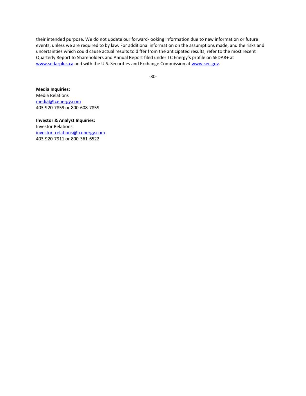 their intended purpose. We do not update our forward-looking information due to new information or future events, unless we are required to by law. For additional information on the assumptions made, and the risks and uncertainties which could cause actual results to differ from the anticipated results, refer to the most recent Quarterly Report to Shareholders and Annual Report filed under TC Energy’s profile on SEDAR+ at www.sedarplus.ca and with the U.S. Securities and Exchange Commission at www.sec.gov. -30- Media Inquiries: Media Relations media@tcenergy.com 403-920-7859 or 800-608-7859 Investor & Analyst Inquiries: Investor Relations investor_relations@tcenergy.com 403-920-7911 or 800-361-6522