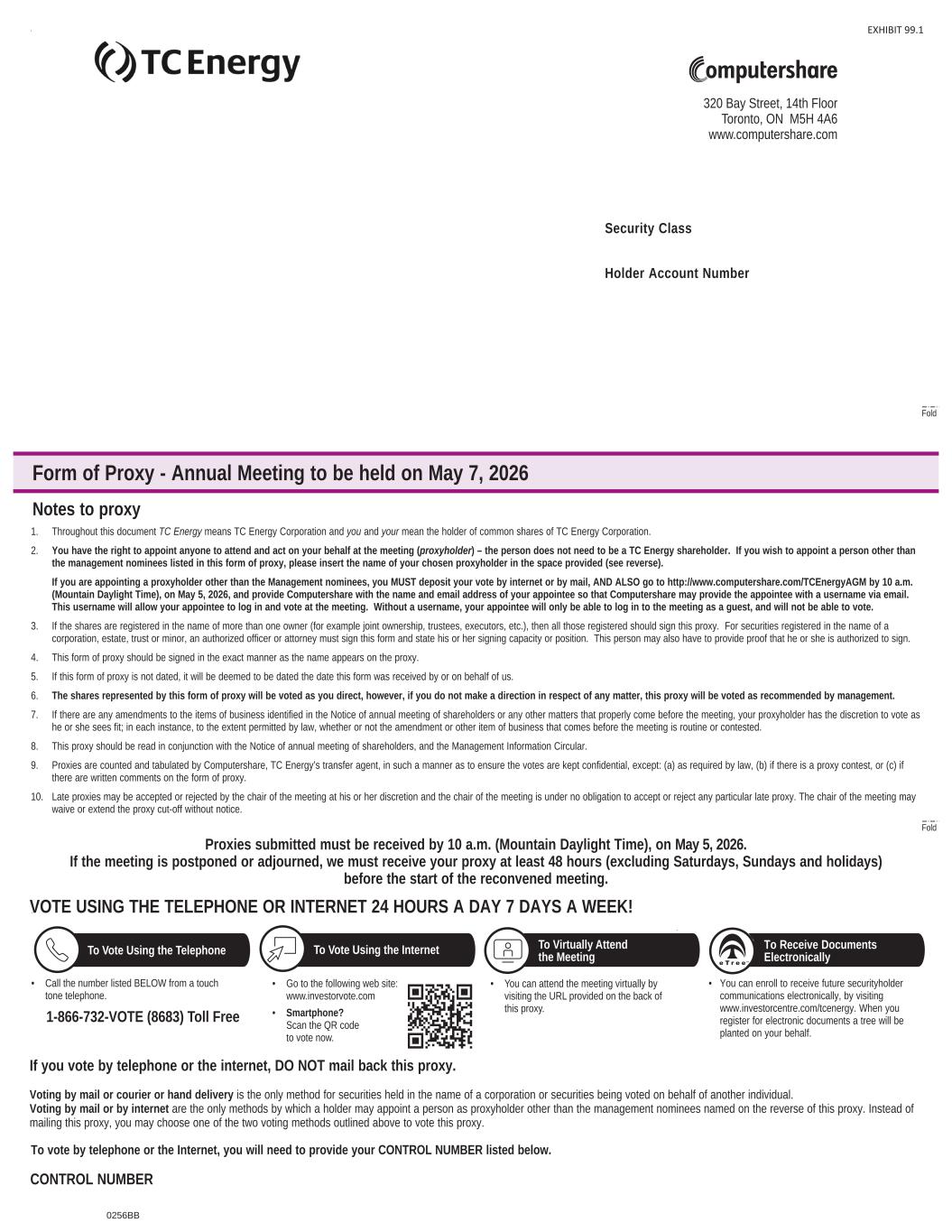 To Vote Using the Telephone To Vote Using the Internet To Virtually Attend the Meeting . 0256BB Fold Fold Form of Proxy - Annual Meeting to be held on May 7, 2026 VOTE USING THE TELEPHONE OR INTERNET 24 HOURS A DAY 7 DAYS A WEEK! If you vote by telephone or the internet, DO NOT mail back this proxy. Voting by mail or courier or hand delivery is the only method for securities held in the name of a corporation or securities being voted on behalf of another individual. Voting by mail or by internet are the only methods by which a holder may appoint a person as proxyholder other than the management nominees named on the reverse of this proxy. Instead of mailing this proxy, you may choose one of the two voting methods outlined above to vote this proxy. . • You can enroll to receive future securityholder communications electronically, by visiting www.investorcentre.com/tcenergy. When you register for electronic documents a tree will be planted on your behalf. . To vote by telephone or the Internet, you will need to provide your CONTROL NUMBER listed below. CONTROL NUMBER 1. Throughout this document TC Energy means TC Energy Corporation and you and your mean the holder of common shares of TC Energy Corporation. 2. You have the right to appoint anyone to attend and act on your behalf at the meeting (proxyholder) – the person does not need to be a TC Energy shareholder. If you wish to appoint a person other than the management nominees listed in this form of proxy, please insert the name of your chosen proxyholder in the space provided (see reverse). If you are appointing a proxyholder other than the Management nominees, you MUST deposit your vote by internet or by mail, AND ALSO go to http://www.computershare.com/TCEnergyAGM by 10 a.m. (Mountain Daylight Time), on May 5, 2026, and provide Computershare with the name and email address of your appointee so that Computershare may provide the appointee with a username via email. This username will allow your appointee to log in and vote at the meeting. Without a username, your appointee will only be able to log in to the meeting as a guest, and will not be able to vote. 3. If the shares are registered in the name of more than one owner (for example joint ownership, trustees, executors, etc.), then all those registered should sign this proxy. For securities registered in the name of a corporation, estate, trust or minor, an authorized officer or attorney must sign this form and state his or her signing capacity or position. This person may also have to provide proof that he or she is authorized to sign. 4. This form of proxy should be signed in the exact manner as the name appears on the proxy. 5. If this form of proxy is not dated, it will be deemed to be dated the date this form was received by or on behalf of us. 6. The shares represented by this form of proxy will be voted as you direct, however, if you do not make a direction in respect of any matter, this proxy will be voted as recommended by management. 7. If there are any amendments to the items of business identified in the Notice of annual meeting of shareholders or any other matters that properly come before the meeting, your proxyholder has the discretion to vote as he or she sees fit; in each instance, to the extent permitted by law, whether or not the amendment or other item of business that comes before the meeting is routine or contested. 8. This proxy should be read in conjunction with the Notice of annual meeting of shareholders, and the Management Information Circular. 9. Proxies are counted and tabulated by Computershare, TC Energy’s transfer agent, in such a manner as to ensure the votes are kept confidential, except: (a) as required by law, (b) if there is a proxy contest, or (c) if there are written comments on the form of proxy. 10. Late proxies may be accepted or rejected by the chair of the meeting at his or her discretion and the chair of the meeting is under no obligation to accept or reject any particular late proxy. The chair of the meeting may waive or extend the proxy cut-off without notice. Proxies submitted must be received by 10 a.m. (Mountain Daylight Time), on May 5, 2026. If the meeting is postponed or adjourned, we must receive your proxy at least 48 hours (excluding Saturdays, Sundays and holidays) before the start of the reconvened meeting. Notes to proxy • Call the number listed BELOW from a touch tone telephone. • Go to the following web site: www.investorvote.com • Smartphone? Scan the QR code to vote now. • You can attend the meeting virtually by visiting the URL provided on the back of this proxy. To Receive Documents Electronically 320 Bay Street, 14th Floor Toronto, ON M5H 4A6 www.computershare.com 000001 Security Class 123 C1234567890 X X X Holder Account Number MR SAM SAMPLE 123 SAMPLES STREET SAMPLETOWN SS X9X 9X9 CPUQC01.E.INT/000001/i1234 123456789012345 1-866-732-VOTE (8683) Toll Free