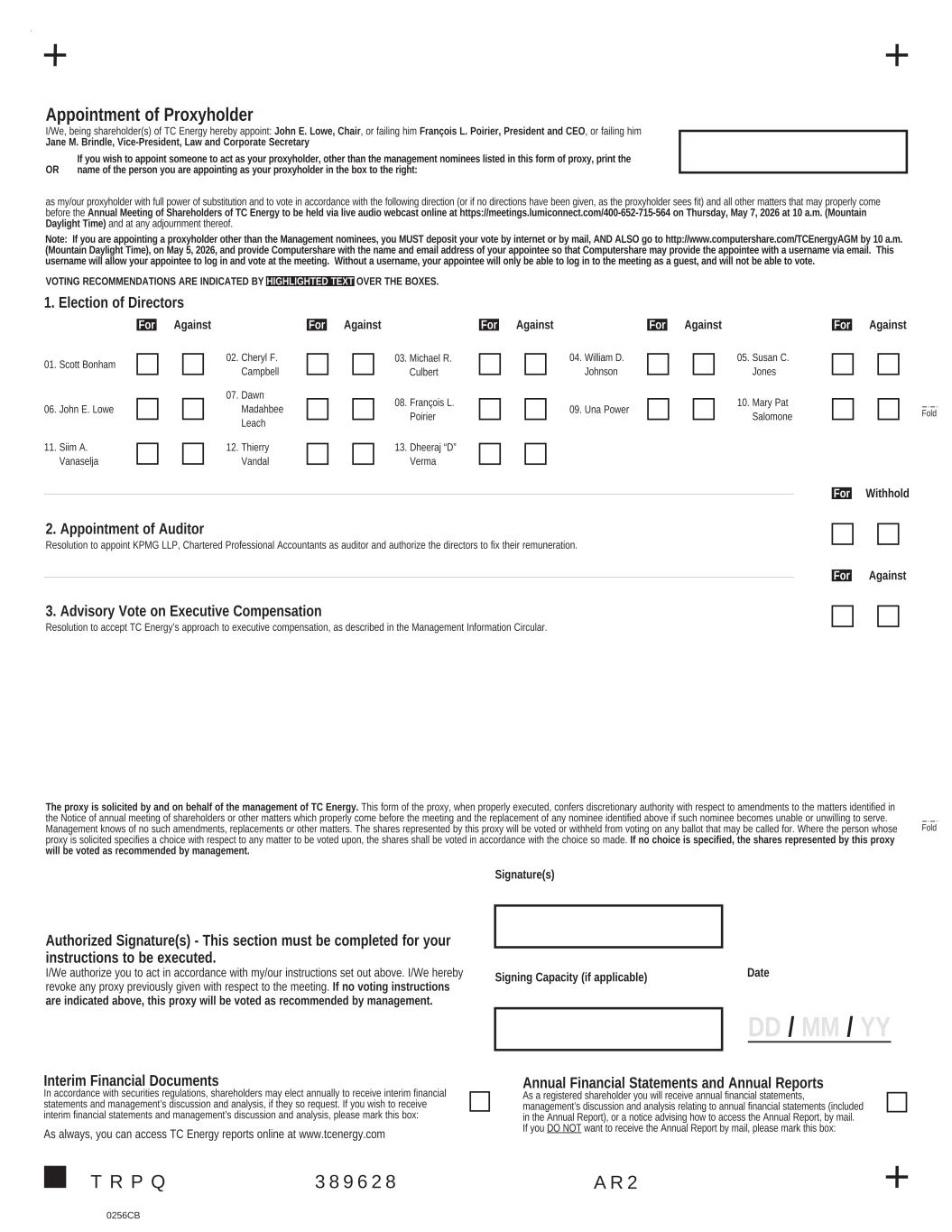 . 0256CB 3 8 9 6 2 8 Fold Fold Appointment of Proxyholder as my/our proxyholder with full power of substitution and to vote in accordance with the following direction (or if no directions have been given, as the proxyholder sees fit) and all other matters that may properly come before the Annual Meeting of Shareholders of TC Energy to be held via live audio webcast online at https://meetings.lumiconnect.com/400-652-715-564 on Thursday, May 7, 2026 at 10 a.m. (Mountain Daylight Time) and at any adjournment thereof. If you wish to appoint someone to act as your proxyholder, other than the management nominees listed in this form of proxy, print the name of the person you are appointing as your proxyholder in the box to the right:OR I/We, being shareholder(s) of TC Energy hereby appoint: John E. Lowe, Chair, or failing him François L. Poirier, President and CEO, or failing him Jane M. Brindle, Vice-President, Law and Corporate Secretary Authorized Signature(s) - This section must be completed for your instructions to be executed. I/We authorize you to act in accordance with my/our instructions set out above. I/We hereby revoke any proxy previously given with respect to the meeting. If no voting instructions are indicated above, this proxy will be voted as recommended by management. As always, you can access TC Energy reports online at www.tcenergy.com Interim Financial Documents In accordance with securities regulations, shareholders may elect annually to receive interim financial statements and management’s discussion and analysis, if they so request. If you wish to receive interim financial statements and management’s discussion and analysis, please mark this box: Annual Financial Statements and Annual Reports As a registered shareholder you will receive annual financial statements, management’s discussion and analysis relating to annual financial statements (included in the Annual Report), or a notice advising how to access the Annual Report, by mail. If you DO NOT want to receive the Annual Report by mail, please mark this box: A R 2 DD / MM / YY DateSigning Capacity (if applicable) Signature(s) 2. Appointment of Auditor Resolution to appoint KPMG LLP, Chartered Professional Accountants as auditor and authorize the directors to fix their remuneration. 1. Election of Directors AgainstFor AgainstFor 04. William D. Johnson 05. Susan C. Jones 09. Una Power 10. Mary Pat Salomone AgainstFor 03. Michael R. Culbert 08. François L. Poirier 13. Dheeraj “D” Verma AgainstFor 02. Cheryl F. Campbell 07. Dawn Madahbee Leach 12. Thierry Vandal AgainstFor 01. Scott Bonham 06. John E. Lowe 11. Siim A. Vanaselja WithholdFor The proxy is solicited by and on behalf of the management of TC Energy. This form of the proxy, when properly executed, confers discretionary authority with respect to amendments to the matters identified in the Notice of annual meeting of shareholders or other matters which properly come before the meeting and the replacement of any nominee identified above if such nominee becomes unable or unwilling to serve. Management knows of no such amendments, replacements or other matters. The shares represented by this proxy will be voted or withheld from voting on any ballot that may be called for. Where the person whose proxy is solicited specifies a choice with respect to any matter to be voted upon, the shares shall be voted in accordance with the choice so made. If no choice is specified, the shares represented by this proxy will be voted as recommended by management. Note: If you are appointing a proxyholder other than the Management nominees, you MUST deposit your vote by internet or by mail, AND ALSO go to http://www.computershare.com/TCEnergyAGM by 10 a.m. (Mountain Daylight Time), on May 5, 2026, and provide Computershare with the name and email address of your appointee so that Computershare may provide the appointee with a username via email. This username will allow your appointee to log in and vote at the meeting. Without a username, your appointee will only be able to log in to the meeting as a guest, and will not be able to vote. VOTING RECOMMENDATIONS ARE INDICATED BY HIGHLIGHTED TEXT OVER THE BOXES. 3. Advisory Vote on Executive Compensation Resolution to accept TC Energy’s approach to executive compensation, as described in the Management Information Circular. AgainstFor MR SAM SAMPLE 123 C1234567890 XXX 9 9 9 9 9 9 9 9 9 9 99 X XT R P Q