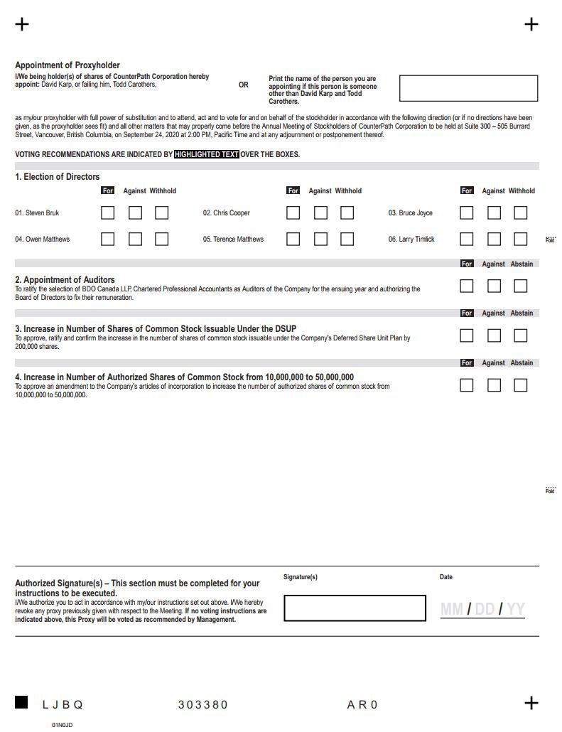 NOTICE IS HEREBY GIVEN that CounterPath Corporation (the "Company"), a Nevada corporation, will hold its annual meeting of stockholders (the "Meeting") on September 24, 2020 at 2:00 p.m. (Vancouver time) at Suite 300 - 505 Burrard Street, Vancouver, British Columbia, Canada V7X 1M3.